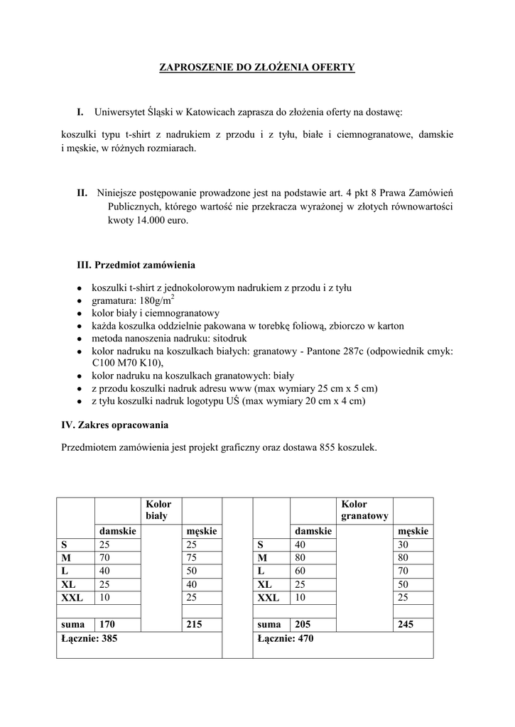 ZAPROSZENIE DO ZŁOŻENIA OFERTY I. Uniwersytet Śląski w Katowicach zaprasza do złożenia oferty na dostawę: koszulki typu t-shirt z nadrukiem z przodu i z tyłu, białe i ciemnogranatowe, damskie i męskie, w różnych rozmiarach. II. Niniejsze postępowanie prowadzone jest na podstawie art. 4 pkt 8 Prawa Zamówień Publicznych, którego wartość nie przekracza wyrażonej w złotych równowartości kwoty 14.000 euro. III. Przedmiot zamówienia koszulki t-shirt z jednokolorowym nadrukiem z przodu i z tyłu gramatura: 180g/m2 kolor biały i ciemnogranatowy każda koszulka oddzielnie pakowana w torebkę foliową, zbiorczo w karton metoda nanoszenia nadruku: sitodruk kolor nadruku na koszulkach białych: granatowy - Pantone 287c (odpowiednik cmyk: C100 M70 K10), kolor nadruku na koszulkach granatowych: biały z przodu koszulki nadruk adresu www (max wymiary 25 cm x 5 cm) z tyłu koszulki nadruk logotypu UŚ (max wymiary 20 cm x 4 cm) IV. Zakres opracowania Przedmiotem zamówienia jest projekt graficzny oraz dostawa 855 koszulek. Kolor biały S M L XL XXL damskie 25 70 40 25 10 suma 170 Łącznie: 385 Kolor granatowy męskie 25 75 50 40 25 215 S M L XL XXL damskie 40 80 60 25 10 suma 205 Łącznie: 470 męskie 30 80 70 50 25 245 V. Warunki realizacji Zleceniodawca dostarczy niezbędne materiały graficzne do Wykonawcy drogą elektroniczną, Wykonawca zobowiązuje się do wykonania projektu graficznego do 24 godzin od momentu wysłania materiałów graficznych przez Zamawiającego, Zleceniodawca zobowiązuje się do zatwierdzenia projektów graficznych lub zgłoszenia uwag do 2 dni roboczych od momentu ich otrzymania, Przedmiot umowy będzie realizowany według bieżących potrzeb Zamawiającego, od daty zawarcia umowy do dnia 31.12.2013 r. lub do momentu wyczerpania przedmiotu umowy, w zakresie rodzaju asortymentu oraz jego ilości, określonych w ofercie Wykonawcy, w zależności od tego, które ze zdarzeń nastąpi wcześniej. Termin pierwszej dostawy nie może nastąpić później niż 8 marca 2013 r. Wykonawca każdorazowo wystawi fakturę VAT, płatną przelewem po podpisaniu protokołu odbioru, z termin płatności minimum 14 dni. W cenę zostaną wliczone wszelkie koszty związane z sukcesywną dostawą przedmiotu zamówienia. Zleceniodawca zobowiązuje się do zakupu minimum 70% zamówienia. VI. Kryteria oceny ofert i ich znaczenie: Cena – 100% VII. Miejsce, termin oraz forma składania ofert: Oferty proszę przesyłać do 1 marca 2013 r. do godz. 15.00, na adres mailowy [email protected] lub w formie papierowej na adres: Uniwersytet Śląski w Katowicach, Dział Informacji i Promocji, ul. Bankowa 12, 40-007 Katowice z dopiskiem „koszulki tshirt”. Informacji udziela Dział Informacji i Promocji UŚ 32 359 19 75. VIII. Unieważnienie postępowania Zamawiający zastrzega sobie prawo do unieważnienia postępowania jeżeli: w wyznaczonym czasie nie wpłynie żadna oferta; całkowita cena najniższej oferty przekroczy kwotę, jaka została przeznaczona na realizację tego zamówienia; oferty, które wpłyną, nie będą odpowiadały przedmiotowi zamówienia.