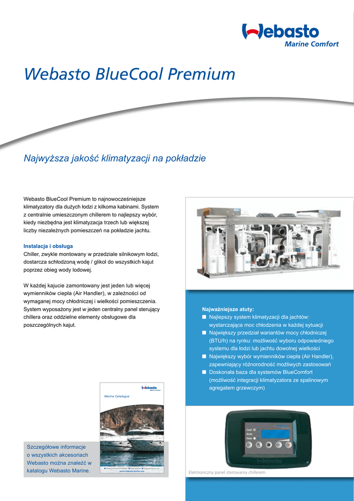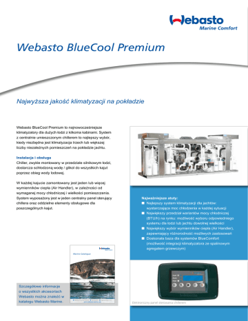 Webasto BlueCool Premium Najwyższa jakość klimatyzacji na pokładzie Webasto BlueCool Premium to najnowocześniejsze klimatyzatory dla dużych łodzi z kilkoma kabinami. System z centralnie umieszczonym chillerem to najlepszy wybór, kiedy niezbędna jest klimatyzacja trzech lub większej liczby niezależnych pomieszczeń na pokładzie jachtu. Instalacja i obsługa Chiller, zwykle montowany w przedziale silnikowym łodzi, dostarcza schłodzoną wodę / glikol do wszystkich kajut poprzez obieg wody lodowej. W każdej kajucie zamontowany jest jeden lub więcej wymienników ciepła (Air Handler), w zależności od wymaganej mocy chłodniczej i wielkości pomieszczenia. System wyposażony jest w jeden centralny panel sterujący chillera oraz oddzielne elementy obsługowe dla poszczególnych kajut. Najważniejsze atuty: ■ Najlepszy system klimatyzacji dla jachtów: wystarczająca moc chłodzenia w każdej sytuacji ■ Największy przedział wariantów mocy chłodniczej (BTU/h) na rynku: możliwość wyboru odpowiedniego systemu dla łodzi lub jachtu dowolnej wielkości ■ Największy wybór wymienników ciepła (Air Handler), zapewniający różnorodność możliwych zastosowań ■ Doskonała baza dla systemów BlueComfort (możliwość integracji klimatyzatora ze spalinowym agregatem grzewczym) Marine Catalogue 2010 Szczegółowe informacje o wszystkich akcesoriach Webasto można znaleźć w katalogu Webasto Marine. ■ Heating & Cooling Solutions ■ Roof Systems ■ Engineering Services www.webasto-marine.com Elektroniczny panel sterowania chillerem Przykładowa instalacja systemu klimatyzacji Webasto BlueCool Premium: A Jednostka chłodnicza (chiller) w przedziale silnikowym B Wymiennik ciepła (Air Handler) C Otwory nawiewu chłodnego powietrza D Proste i intuicyjne sterowanie E Pompa obiegowa F Obieg chłodzenia wodą zaburtową C D A D E B F Specyfikacja techniczna: CH12 Moc chłodnicza (BTU/h): Moc chłodnicza (kW) CH16 12,000 Napięcie zasilania (V) CH20 16,000 CH24 20,000 CH30 24,000 CH36 30,000 CH42 36,000 CH48 42,000 CH60 48,000 60,000 3.5 4.7 5.8 7.0 8.7 10.5 12.3 14.0 17.6 230 / 115 230 / 115 230 230 230 / 400 230 / 400 230 / 400 230 / 400 400 230 Pobór mocy elektrycznej (W) – praca / rozruch* Masa netto (kg) 1,000 / 2,500 1,250 / 3,200 1,500 / 3,700 1,725 / 4,200 2,100 / 4,500 2,650 / 5,600 3,000 / 7,300 3,450 / 9,200 4,400 / 9,800 2,200 / 5,000 Dług. x głęb. x wys. (mm) 405x333x347 417x333x356 417x333x356 405x333x419 480x422x505 480x422x515 480x422x535 480x422x585 535x530x600 411x355x410 Systemy z dwoma sprężarkami 29 CH24 Moc chłodnicza (BTU/h): Moc chłodnicza (kW) CH32 24,000 Napięcie zasilania (V) 33 33 CH40 39 CH50 43 / 55 CH60 66 CH60 68 CH72 60,000 70 CH84 72,000 84,000 75 CH96 32,000 40,000 50,000 60,000 96,000 7.0 9.4 11.7 14.6 17.6 17.6 21.1 24.6 28.1 230 230 230 230 230 230 / 400 230 / 400 230 / 400 230 / 400 Pobór mocy elektrycznej (W) – praca / rozruch* Masa netto (kg) 2,070 / 3,750 2,500 / 4,450 3,000 / 5,000 3,500 / 5,800 4,200 / 6,600 4,400 / 8,100 5,300 / 9,650 6,000 / 11,000 6,900 / 12,850 Dług. x głęb. x wys. (mm) 470x419x480 470x419x523 470x419x523 470x419x552 470x419x552 680x432x572 680x432x572 680x432x592 680x432x630 70 75 78 85 90 95 100 105 130 * Prąd rozruchowy sprężarki płynie przez ok. 0,3 s. | Wszystkie wymiary podano z tolerancją +/- 10 mm | Specyfikacja techniczna może zostać zmieniona bez uprzedniego powiadomienia. ■ C hillery z trzema sprężarkami dostępne są wariantach mocy chłodniczej od 72000 do 252000 BTU/h ■ C hillery z czterema sprężarkami dostępne są wariantach mocy chłodniczej od 100000 do 572000 BTU/h Systemy rur Webasto EasyPipe Zawór kulowy Webasto Pompa: WB2500G do 5500G Pompa samozasysająca: WB4000 / 5600 / 8000 / 10500 Integracja panelu sterowania BlueComfort z magistralą CANbus Doradztwo · Montaż · Serwis Webasto Petemar Sp. z o.o. Warszawska 205/219 05-092 Łomianki www.webasto.com http://marine.webasto.pl Ident-Nr. MK600831 • 10/10 • Firma nie ponosi odpowiedzialności za błędy lub pominięcia • © Webasto AG, GCS 2010 Systemy z jedną sprężarką