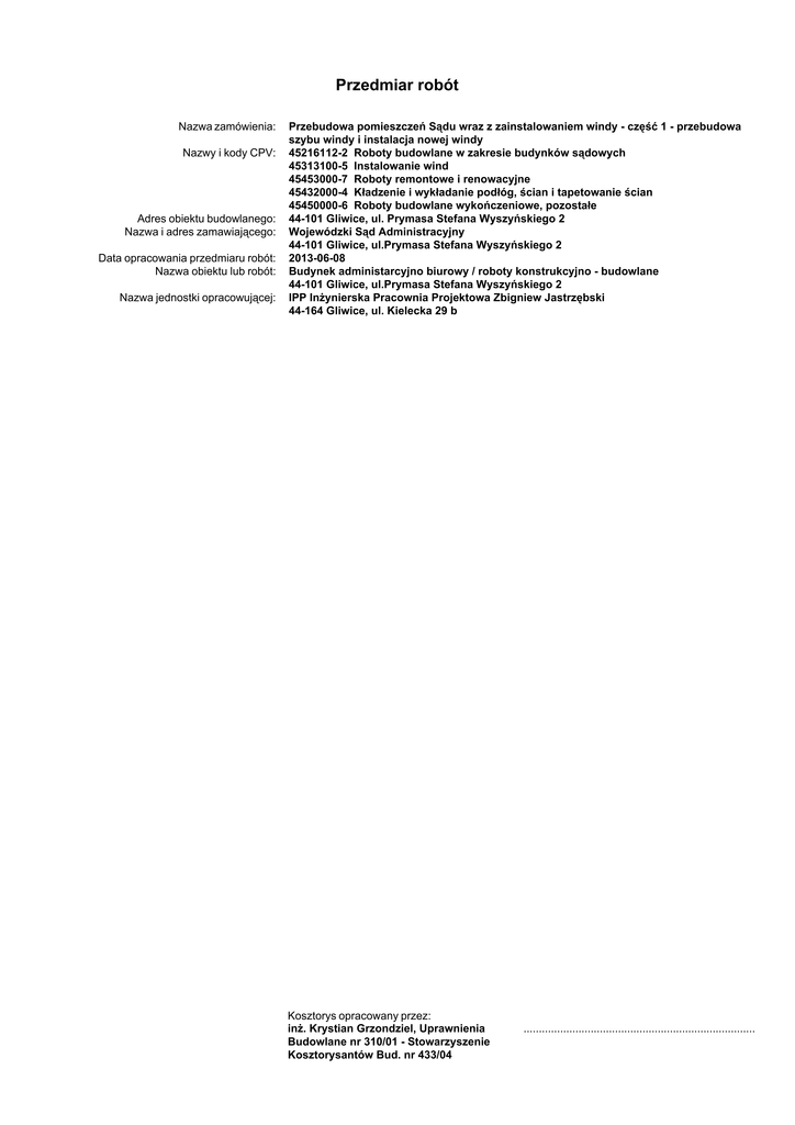 część 1 - Winda - Przedmiar - Wojewódzki Sąd Administracyjny