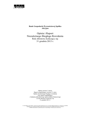 ABCD Bank Gospodarki Żywnościowej Spółka Akcyjna Opinia i Raport Niezależnego Biegłego Rewidenta Rok obrotowy kończący się 31 grudnia 2013 r. Opinia zawiera 3 strony Raport uzupełniający zawiera 11 stron Opinia niezależnego biegłego rewidenta oraz raport uzupełniający z badania jednostkowego sprawozdania finansowego za rok obrotowy kończący się 31 grudnia 2013 r. © 2014 KPMG Audyt Spółka z ograniczoną odpowiedzialnością sp.k. jest polską spółką komandytową i członkiem sieci KPMG składającej się z niezależnych spółek członkowskich stowarzyszonych z KPMG International Cooperative (“KPMG International”), podmiotem prawa szwajcarskiego. Wszelkie prawa zastrzeżone. ABCD OPINIA NIEZALEŻNEGO BIEGŁEGO REWIDENTA Dla Walnego Zgromadzenia Banku Gospodarki Żywnościowej Spółka Akcyjna Opinia o jednostkowym sprawozdaniu finansowym Przeprowadziliśmy badanie załączonego jednostkowego sprawozdania finansowego Banku Gospodarki Żywnościowej Spółka Akcyjna z siedzibą w Warszawie przy ul. Kasprzaka 10/16 („Bank”), na które składa się sprawozdanie z sytuacji finansowej sporządzone na dzień 31 grudnia 2013 r., rachunek zysków i strat, sprawozdanie z całkowitych dochodów, sprawozdanie ze zmian w kapitale własnym oraz sprawozdanie z przepływów pieniężnych za rok obrotowy kończący się tego dnia oraz informacje dodatkowe zawierające opis istotnych zasad rachunkowości oraz inne informacje objaśniające. Odpowiedzialność Zarządu oraz Rady Nadzorczej Zarząd Banku jest odpowiedzialny za prawidłowość ksiąg rachunkowych oraz sporządzenie i rzetelną prezentację tego sprawozdania finansowego zgodnie z Międzynarodowymi Standardami Sprawozdawczości Finansowej, które zostały zatwierdzone przez Unię Europejską i innymi obowiązującymi przepisami prawa oraz sporządzenie sprawozdania z działalności. Zarząd Banku jest odpowiedzialny również za kontrolę wewnętrzną, którą uznaje za niezbędną, aby sporządzane sprawozdania finansowe były wolne od nieprawidłowości powstałych wskutek celowych działań lub błędów. Zgodnie z ustawą z dnia 29 września 1994 r. o rachunkowości (Dz. U. z 2013 r. poz. 330 z późniejszymi zmianami) („ustawa o rachunkowości”), Zarząd Banku oraz członkowie Rady Nadzorczej są zobowiązani do zapewnienia, aby sprawozdanie finansowe oraz sprawozdanie z działalności spełniały wymagania przewidziane w tej ustawie. Odpowiedzialność Biegłego Rewidenta Naszym zadaniem jest, w oparciu o przeprowadzone badanie, wyrażenie opinii o tym sprawozdaniu finansowym oraz prawidłowości ksiąg rachunkowych stanowiących podstawę jego sporządzenia. Badanie sprawozdania finansowego przeprowadziliśmy stosownie do postanowień rozdziału 7 ustawy o rachunkowości, krajowych standardów rewizji finansowej wydanych przez Krajową Radę Biegłych Rewidentów oraz Międzynarodowych Standardów Rewizji Finansowej. Regulacje te nakładają na nas obowiązek postępowania zgodnego z zasadami etyki oraz zaplanowania i przeprowadzenia badania w taki sposób, aby uzyskać racjonalną pewność, że sprawozdanie finansowe i księgi rachunkowe stanowiące podstawę jego sporządzenia są wolne od istotnych nieprawidłowości. 1 ABCD Badanie polega na przeprowadzeniu procedur mających na celu uzyskanie dowodów badania dotyczących kwot i informacji ujawnionych w sprawozdaniu finansowym. Wybór procedur badania zależy od naszego osądu, w tym oceny ryzyka wystąpienia istotnej nieprawidłowości sprawozdania finansowego na skutek celowych działań lub błędów. Przeprowadzając ocenę tego ryzyka bierzemy pod uwagę kontrolę wewnętrzną związaną ze sporządzeniem oraz rzetelną prezentacją sprawozdania finansowego w celu zaplanowania stosownych do okoliczności procedur badania, nie zaś w celu wyrażenia opinii na temat skuteczności działania kontroli wewnętrznej w jednostce. Badanie obejmuje również ocenę odpowiedniości stosowanej polityki rachunkowości, zasadności szacunków dokonanych przez Zarząd Banku oraz ocenę ogólnej prezentacji sprawozdania finansowego. Wyrażamy przekonanie, że uzyskane przez nas dowody badania stanowią wystarczającą i odpowiednią podstawę do wyrażenia przez nas opinii z badania. Opinia Naszym zdaniem, załączone jednostkowe sprawozdanie finansowe Banku Gospodarki Żywnościowej Spółka Akcyjna przedstawia rzetelnie i jasno sytuację majątkową i finansową Banku na dzień 31 grudnia 2013 r., wynik finansowy oraz przepływy pieniężne za rok obrotowy kończący się tego dnia, zostało sporządzone, we wszystkich istotnych aspektach, zgodnie z Międzynarodowymi Standardami Sprawozdawczości Finansowej, które zostały zatwierdzone przez Unię Europejską, jest zgodne z wpływającymi na treść jednostkowego sprawozdania finansowego przepisami prawa i postanowieniami statutu Banku oraz zostało sporządzone na podstawie prawidłowo prowadzonych, we wszystkich istotnych aspektach, ksiąg rachunkowych. Inne kwestie Dane porównawcze zostały przedstawione na podstawie jednostkowego sprawozdania finansowego Banku za rok obrotowy kończący się 31 grudnia 2012 r., zbadanego przez inny podmiot uprawniony do badania, który w dniu 4 marca 2013 r. wydał opinię bez zastrzeżeń o tym jednostkowym sprawozdaniu finansowym. 2 ABCD Szczególne objaśnienia na temat innych wymogów prawa i regulacji Sprawozdanie z działalności Banku Ponadto, zgodnie z wymogami ustawy o rachunkowości, stwierdzamy, że sprawozdanie z działalności Banku uwzględnia, we wszystkich istotnych aspektach, informacje, o których mowa w art. 49 ustawy o rachunkowości oraz w rozporządzeniu Ministra Finansów z dnia 19 lutego 2009 r. w sprawie informacji bieżących i okresowych przekazywanych przez emitentów papierów wartościowych oraz warunków uznawania za równoważne informacji wymaganych przepisami prawa państwa niebędącego państwem członkowskim (Dz. U. z 2009 r., n