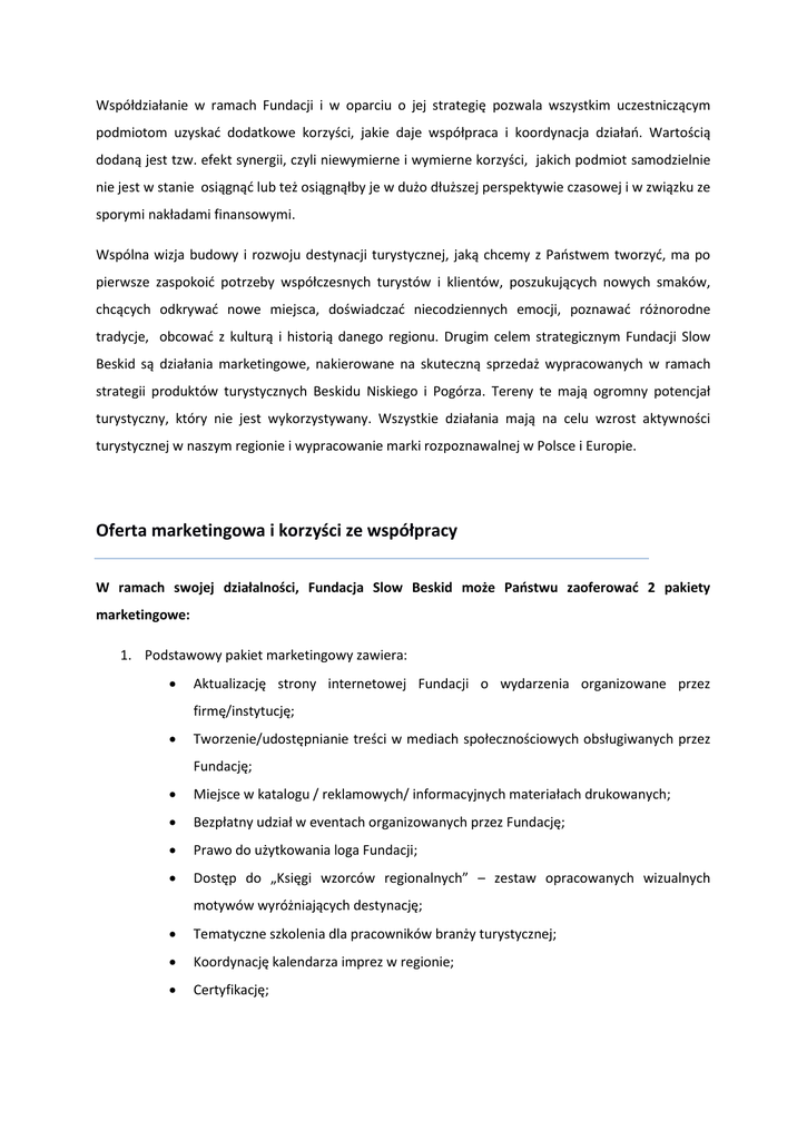 Współdziałanie w ramach Fundacji i w oparciu o jej strategię pozwala wszystkim uczestniczącym podmiotom uzyskać dodatkowe korzyści, jakie daje współpraca i koordynacja działań. Wartością dodaną jest tzw. efekt synergii, czyli niewymierne i wymierne korzyści, jakich podmiot samodzielnie nie jest w stanie osiągnąć lub też osiągnąłby je w dużo dłuższej perspektywie czasowej i w związku ze sporymi nakładami finansowymi. Wspólna wizja budowy i rozwoju destynacji turystycznej, jaką chcemy z Państwem tworzyć, ma po pierwsze zaspokoić potrzeby współczesnych turystów i klientów, poszukujących nowych smaków, chcących odkrywać nowe miejsca, doświadczać niecodziennych emocji, poznawać różnorodne tradycje, obcować z kulturą i historią danego regionu. Drugim celem strategicznym Fundacji Slow Beskid są działania marketingowe, nakierowane na skuteczną sprzedaż wypracowanych w ramach strategii produktów turystycznych Beskidu Niskiego i Pogórza. Tereny te mają ogromny potencjał turystyczny, który nie jest wykorzystywany. Wszystkie działania mają na celu wzrost aktywności turystycznej w naszym regionie i wypracowanie marki rozpoznawalnej w Polsce i Europie. Oferta marketingowa i korzyści ze współpracy W ramach swojej działalności, Fundacja Slow Beskid może Państwu zaoferować 2 pakiety marketingowe: 1. Podstawowy pakiet marketingowy zawiera: Aktualizację strony internetowej Fundacji o wydarzenia organizowane przez firmę/instytucję; Tworzenie/udostępnianie treści w mediach społecznościowych obsługiwanych przez Fundację; Miejsce w katalogu / reklamowych/ informacyjnych materiałach drukowanych; Bezpłatny udział w eventach organizowanych przez Fundację; Prawo do użytkowania loga Fundacji; Dostęp do „Księgi wzorców regionalnych” – zestaw opracowanych wizualnych motywów wyróżniających destynację; Tematyczne szkolenia dla pracowników branży turystycznej; Koordynację kalendarza imprez w regionie; Certyfikację; 2. Rozszerzony pakiet marketingowy zawiera: Wszystkie punkty podstawowego pakietu marketingowego; Prawo do kształtowania i użytkowania strategii; Dostęp do wyników badań i raportów okresowych systematycznie tworzonych przez Fundację; Korzyści, dla przedsiębiorstwa / instytucji publicznej / organizacji płynące ze współpracy z Fundacją: 1. Zintegrowany marketing i reklama marki / przedsiębiorstwa /organizacji / instytucji w nowych i tradycyjnych mediach, w skali regionalnej i ogólnopolskiej; 2. Nawiązanie rzeczywistych kontaktów biznesowych z innymi firmami / instytucjami / organizacjami zrzeszonymi w ramach Fundacji; 3. Osiągnięcie efektu synergii poprzez wspólne działania (marketingowe, reklamowe, szkolenia, itd.); 4. Zwiększenie możliwości świadczenia usług na rzecz firm stowarzyszonych w ramach Fundacji; 5. Wyróżnienie firmy na tle konkurencji; 6. Zaznaczenie i ugruntowanie swojej pozycji na rynku; 7. Zmniejszenie nakładów na reklamę i działania marketingowe; 8. Możliwość pozyskania nowych klientów; 9. Podniesienie poziomu wiedzy i kompetencji właścicieli i pracowników firm / organizacji / instytucji w zakresie rozwoju turystyki regionalnej, realnych potrzeb i oczekiwań współczesnych klientów poprzez tematyczne szkolenia, warsztaty i konferencje; 10. Kreowanie wizerunku firmy / instytucji /organizacji zaangażowanej społecznie poprzez wsparcie lokalnych inicjatyw; 11. Zwiększenie zaufania społecznego.