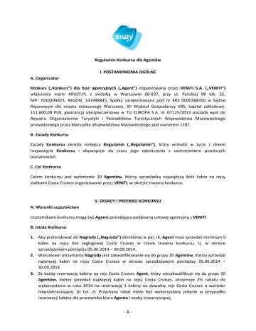 Regulamin Konkursu dla Agentów I. POSTANOWIENIA OGÓLNE A. Organizator Konkurs („Konkurs”) dla biur agencyjnych („Agent”) organizowany przez VENITI S.A. („VENITI”) właściciela marki KRUZY.PL z siedzibą w Warszawie 00-837, przy ul. Pańskiej 98 lok. 55, NIP: 7010204825, REGON: 141998845, Spółka zarejestrowana pod nr KRS 0000384450 w Sądzie Rejonowym dla miasta stołecznego Warszawy, XII Wydział Gospodarczy KRS, kapitał zakładowy: 111.600,00 PLN, gwarancja ubezpieczeniowa w TU EUROPA S.A. nr GT125/2013 posiada wpis do Rejestru Organizatorów Turystyki i Pośredników Turystycznych Województwa Mazowieckiego prowadzonego przez Marszałka Województwa Mazowieckiego pod numerem 1187. B. Zasady Konkursu Zasady Konkursu określa niniejszy Regulamin („Regulamin”), który wchodzi w życie z dniem rozpoczęcia Konkursu i obowiązuje do czasu jego zakończenia z zastrzeżeniem poniższych postanowień. C. Cel Konkursu Celem konkursu jest wyłonienie 20 Agentów, którzy sprzedadzą największą ilość kabin na rejsy statkami Costa Cruises organizowane przez VENITI, w okresie trwania konkursu. II. ZASADY I PRZEBIEG KONKURSU A. Warunki uczestnictwa Uczestnikami konkursu mogą być Agenci posiadający podpisaną umowę agencyjną z VENITI. B. Istota Konkursu 1. Aby pretendować do Nagrody („Nagroda”) określonej w par. III, Agent musi sprzedać minimum 5 kabin na rejsy linii żeglugowej Costa Cruises w czasie trwania konkursu, tj. w okresie sprzedażowym pomiędzy 05.06.2014 – 30.09.2014. 2. Warunkiem otrzymania Nagrody jest zakwalifikowanie się do grupy 20 Agentów, którzy sprzedali najwięcej kabin na rejsy Costa Cruises w okresie sprzedażowym pomiędzy 05.06.2014 – 30.09.2014. 3. Za każdą rezerwację kabiny na rejs Costa Cruises Agent, który niezakwalifikuje się do grupy 20 Agentów, którzy sprzedali najwięcej kabin na rejsy Costa Cruises, otrzymuje 2% rabatu do wykorzystania w roku 2014 na rezerwację 1 kabiny na dowolny rejs Costa Cruises o wartości nieprzekraczającej 10 tys. zł. Przyznany rabat może być wykorzystany jedynie w przypadku rezerwacji kabiny dla pracownika biura Agenta i osoby towarzyszącej. -1- 4. Nie ma możliwości wymiany Nagrody na gotówkę i/lub odsprzedania Nagrody Klientowi lub osobie trzeciej. C. Rozstrzygnięcie Konkursu 1. Wyniki Konkursu zostaną ogłoszone do 01.10.2014 r. 2. W przypadku, gdy więcej niż 20 Agentów sprzeda po co najmniej 5 kabin linii Costa Cruises, kolejnym kryterium decydującym o przyznaniu Nagrody będzie najwyższa sumaryczna wartość sprzedaży kabin linii Costa Cruises dokonana przez danego Agenta. D. Sposób ogłoszenia wyników Konkursu Wyniki zostaną przesłane do Agentów uczestniczących w konkursie drogą mailową. E. Zastrzeżenie prawa do odwołania Konkursu VENITI zastrzega sobie prawo do odwołania Konkursu z przyczyn niezależnych od niego. III. NAGRODA A. Nagroda 1. Nagrodę stanowi rejs statkiem Costa Serena po Morzu Śródziemnym z wypłynięciem z Savony w terminie 02.11 - 09.11.2014 r. 2. Nagrody nie można zamienić na rejs w innym terminie. 3. VENITI opłaca przelot z/do Mediolanu, transfery lotnisko-port i port-lotnisko, rejs z pełnym wyżywieniem z pobytem w kabinie wewnętrznej, napiwki oraz ubezpieczenie. Wszystkie ew. dodatkowe koszty i opłaty, w tym podatek dochodowy, pokrywają uczestnicy. B. Obowiązki uczestnika i VENITI 1. Do 2 dni od daty ogłoszenia wyników należy podać dane uczestnika wyjazdu (imię i nazwisko, data urodzenia, numer dowodu osobistego lub paszportu oraz data wydania i ważności). 2. VENITI zastrzega sobie prawo do nieprzyjęcia kandydata niespełniającego wymogów formalnopaszportowych. 3. Nie przewiduje się zmian zgłoszonych uczestników. 4. W przypadku rezygnacji z Nagrody koszty nie będę zwracane. IV. POSTANOWIENIA KOŃCOWE Przystąpienie do udziału w Konkursie jest dobrowolne i jednoznaczne z przyjęciem warunków niniejszego Regulaminu. -2-