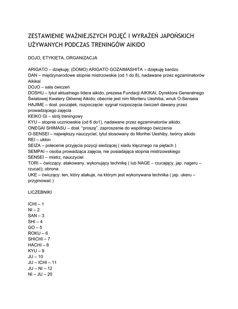 ZESTAWIENIE WAŻNIEJSZYCH POJĘĆ I WYRAŻEŃ JAPOŃSKICH UŻYWANYCH PODCZAS TRENINGÓW AIKIDO DOJO, ETYKIETA, ORGANIZACJA ARIGATO – dziękuję; (DOMO) ARIGATO GOZAIMASHITA – dziękuję bardzo DAN – międzynarodowe stopnie mistrzowskie (od 1 do 8), nadawane przez egzaminatorów Aikikai DOJO – sala ćwiczeń DOSHU – tytuł aktualnego lidera aikido, prezesa Fundacji AIKIKAI, Dyrektora Generalnego Światowej Kwatery Głównej Aikido; obecnie jest nim Moriteru Ueshiba, wnuk OSenseia HAJIME – dosł. początek, rozpoczęcie: sygnał rozpoczęcia ćwiczeń dawany przez prowadzącego zajęcia KEIKO GI – strój treningowy KYU – stopnie uczniowskie (od 6 do1), nadawane przez egzaminatorów aikido. ONEGAI SHIMASU – dosł. “proszę”, zaproszenie do wspólnego ćwiczenia OSENSEI – największy nauczyciel, tytuł stosowany do Morihei Ueshiby, twórcy aikido REI – ukłon SEIZA – polecenie przyjęcia pozycji siedzącej ( siadu klęcznego na piętach ) SEMPAI – osoba prowadząca zajęcia, nie posiadająca stopnia mistrzowskiego SENSEI – mistrz, nauczyciel TORI – ćwiczący: atakowany, wykonujący technikę ( lub NAGE – rzucający, jap. nageru – rzucać); obrona UKE – ćwiczący: ten, który atakuje, na którym jest wykonywana technika ( jap. ukeru – przyjmować ) LICZEBNIKI ICHI – 1 NI – 2 SAN – 3 SHI – 4 GO – 5 ROKU – 6 SHICHI – 7 HACHI – 8 KYU – 9 JU – 10 JU – ICHI – 11 JU – NI – 12 NI – JU – 20 SAN – JU – 30 HYAKU – 100 NI – HYAKU – 200 SEN 1000 POSTAWA, RUCHY, KROKI, PRZEWROTY, ĆWICZENIA POSTAWA AI HANMI – układ ćwiczących: obie osoby stoją w tej samej pozycji GYAKU HANMI układ ćwiczących: “pozycja lustrzana”, osoby ćwiczące stoją w odwrotnych pozycjach, jakby stanowiły własne odbicie lustrzane HIDARI KAMAE – postawa z lewą nogą z przodu MIGI KAMAE – pozycja z prawą nogą z przodu SEIZA – polecenie przyjęcia postawy siedzącej RUCHY, KROKI ASHI SABAKI – ruch stóp AYUMI ASHI – krok przestawny IRIMI – wejście, ruch w przód OKURI ASHI – krok odstawny OMOTE – kierunek ruchu: w stronę twarzy, przodu partnera SHIKKO poruszanie się w pozycji klęczącej TAI SABAKI – sposoby przemieszczania ciała TENKAN dosł. “przekształcić”; w wersji podstawowej: obrót ciała o 180 stopni z wycofaniem nogi TSUGI ASHI – krok dostawny URA kierunek ruchu: do tyłu, w stronę pleców partnera ZEMPO (IRIMI) TENKAI ASHI – krok naprzód i zwrot w miejscu PRZEWROTY MAE UKEMI – przewrót w przód USHIRO UKEMI – przewrót w tył YOKO UKEMI – przewrót w bok ĆWICZENIA KOHO UKEMI UNDO – “ćwiczenie przewrotów w tył”, ćwiczenie przygotowujące do ukemi TAI NO TENKAN HO – wykorzystanie ruchu tenkan w ćwiczeniu z partnerm: obrót ciała o 180 stopni z uniesieniem rąk, jakby w ruchu trzymania dużej kuli ATAKI: UCHWYTY, UDERZENIA, KATA TORI – uchwyt za bluzę na wysokości ramienia KATATE TORI – uchwyt za rękę KATATE ROTE TORI (= MOROTE TORI) MOROTE TORI uchwyt dwiema rękami za jedną rękę RYO KATA TORI uchwyt za bluzę dwiema rękami RYOTE TORI – uchwyt za dwie ręce SHOMEN UCHI – cięcie proste mieczem lub ręką w płaszczyźnie pionowej TSUKI uderzenie proste YOKOMEN UCHI – cięcie ukośne z lekkim zejściem na bok SPOSOBY ĆWICZENIA I WYKONYWANIA TECHNIK HANMI HANDACHI WAZA – tori siedzi, uke stoi SUWARI WAZA techniki lub ćwiczenia wykonywane w pozycji klęczącej TACHI WAZA – techniki lub ćwiczenia wykonywane w pozycji stojącej USHIRO WAZA – atak od tyłu TECHNIKI: UNIERUCHOMIENIA, RZUTY OSAE ( KAESHI ) WAZA – unieruchomienia IKKYO pierwsza forma unieruchomienia NIKKYO druga forma unieruchomienia SANKYO trzecia forma unieruchomienia YONKYO czwarta forma unieruchomienia z uciskiem na czuły punkt przedramienia GOKYO piąta forma unieruchomienia ( szczególnie przydatna w obronie przed atakiem yokomen uchi z nożem ) HIJIKIME OSAE – forma unieruchomienia przeciwnika z wykorzystaniem dźwigni na staw łokciowy NAGE WAZA – rzuty KOTE GAESHI – rzut przez skręcenie nadgarstka, wykonywany również jako unieruchomienie SHIHO NAGE – rzut podstawowy, tzw.”rzut w cztery strony” IRIMI NAGE – rzut przez “irimi”, wejście w partnera KOKYU NAGE – dosł. “rzut oddechem” KOSHI NAGE – rzut przez biodro UCHI KAITEN NAGE – rzut obrotowy, wykorzystujący ruch do wewnątrz, przejście pod ramieniem partnera SOTO KAITEN NAGE – rzut obrotowy, wykorzystujący ruch na zewnątrz UDEKIME NAGE – rzut wykorzystujący dźwignię na staw łokciowy TEN CHI NAGE – rzut “niebo – ziemia” ( jap. ten – niebo, chi – ziemia ) JUJIGARAMI rzut przez skrzyzowanie rąk