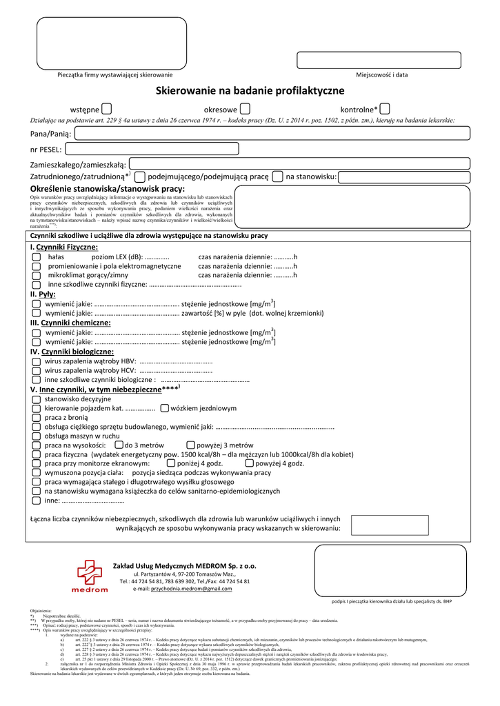 Pieczątka firmy wystawiającej skierowanie Miejscowość i data Skierowanie na badanie profilaktyczne wstępne okresowe kontrolne* Działając na podstawie art. 229 § 4a ustawy z dnia 26 czerwca 1974 r. – kodeks pracy (Dz. U. z 2014 r. poz. 1502, z późn. zm.), kieruję na badania lekarskie: Pana/Panią: nr PESEL: Zamieszkałego/zamieszkałą: ) Zatrudnionego/zatrudnioną* podejmującego/podejmującą pracę na stanowisku: Określenie stanowiska/stanowisk pracy: Opis warunków pracy uwzględniający informacje o występowaniu na stanowisku lub stanowiskach pracy czynników niebezpiecznych, szkodliwych dla zdrowia lub czynników uciążliwych i innychwynikających ze sposobu wykonywania pracy, podaniem wielkości narażenia oraz aktualnychwyników badań i pomiarów czynników szkodliwych dla zdrowia, wykonanych na tymstanowisku/stanowiskach – należy wpisać nazwę czynnika/czynników i wielkość/wielkości narażenia***): Czynniki szkodliwe i uciążliwe dla zdrowia występujące na stanowisku pracy I. Czynniki Fizyczne: hałas poziom LEX (dB): ………….. czas narażenia dziennie: ………..h promieniowanie i pola elektromagnetyczne czas narażenia dziennie: ………..h mikroklimat gorący/zimny czas narażenia dziennie: ………..h inne szkodliwe czynniki fizyczne: …………………………………………….. II. Pyły: 3 wymienić jakie: …………………………………………. stężenie jednostkowe [mg/m ] wymienić jakie: …………………………………………. zawartość [%] w pyle (dot. wolnej krzemionki) III. Czynniki chemiczne: 3 wymienić jakie: …………………………………………. stężenie jednostkowe [mg/m ] 3 wymienić jakie: …………………………………………. stężenie jednostkowe [mg/m ] IV. Czynniki biologiczne: wirus zapalenia wątroby HBV: …………………………………… wirus zapalenia wątroby HCV: …………………………………… inne szkodliwe czynniki biologiczne : …………………………………………… ) V. Inne czynniki, w tym niebezpieczne**** stanowisko decyzyjne kierowanie pojazdem kat. …………….. wózkiem jezdniowym praca z bronią obsługa ciężkiego sprzętu budowlanego, wymienić jaki: ……………….............................................. obsługa maszyn w ruchu praca na wysokości: do 3 metrów powyżej 3 metrów praca fizyczna (wydatek energetyczny pow. 1500 kcal/8h – dla mężczyzn lub 1000kcal/8h dla kobiet) praca przy monitorze ekranowym: poniżej 4 godz. powyżej 4 godz. wymuszona pozycja ciała: pozycja siedząca podczas wykonywania pracy praca wymagająca stałego i długotrwałego wysiłku głosowego na stanowisku wymagana książeczka do celów sanitarno-epidemiologicznych inne: ……………………………… Łączna liczba czynników niebezpiecznych, szkodliwych dla zdrowia lub warunków uciążliwych i innych wynikających ze sposobu wykonywania pracy wskazanych w skierowaniu: Zakład Usług Medycznych MEDROM Sp. z o.o. ul. Partyzantów 4, 97-200 Tomaszów Maz., Tel.: 44 724 54 81, 783 639 302, Tel./Fax: 44 724 54 81 e-mail: [email protected] podpis I pieczątka kierownika działu lub specjalisty ds. BHP Objaśnienia: *) Niepotrzebne skreślić. **) W przypadku osoby, której nie nadano nr PESEL – seria, numer i nazwa dokumentu stwierdzającego tożsamość, a w przypadku osoby przyjmowanej do pracy – data urodzenia. ***) Opisać: rodzaj pracy, podstawowe czynności, sposób i czas ich wykonywania. ****) Opis warunków pracy uwzględniający w szczególności przepisy: 1. wydane na podstawie: a) art. 222 § 3 ustawy z dnia 26 czerwca 1974 r. – Kodeks pracy dotyczące wykazu substancji chemicznych, ich mieszanin, czynników lub procesów technologicznych o działaniu rakotwórczym lub mutagennym, b) art. 2221 § 3 ustawy z dnia 26 czerwca 1974 r. – Kodeks pracy dotyczące wykazu szkodliwych czynników biologicznych, c) art. 227 § 2 ustawy z dnia 26 czerwca 1974 r. – Kodeks pracy dotyczące badań i pomiarów czynników szkodliwych dla zdrowia, d) art. 228 § 3 ustawy z dnia 26 czerwca 1974 r. – Kodeks pracy dotyczące wykazu najwyższych dopuszczalnych stężeń i natężeń czynników szkodliwych dla zdrowia w środowisku pracy, e) art. 25 pkt 1 ustawy z dnia 29 listopada 2000 r. – Prawo atomowe (Dz. U. z 2014 r. poz. 1512) dotyczące dawek granicznych promieniowania jonizującego; 2. załącznika nr 1 do rozporządzenia Ministra Zdrowia i Opieki Społecznej z dnia 30 maja 1996 r. w sprawie przeprowadzania badań lekarskich pracowników, zakresu profilaktycznej opieki zdrowotnej nad pracownikami oraz orzeczeń lekarskich wydawanych do celów przewidzianych w Kodeksie pracy (Dz. U. Nr 69, poz. 332, z późn. zm.) Skierowanie na badania lekarskie jest wydawane w dwóch egzemplarzach, z których jeden otrzymuje osoba kierowana na badania.