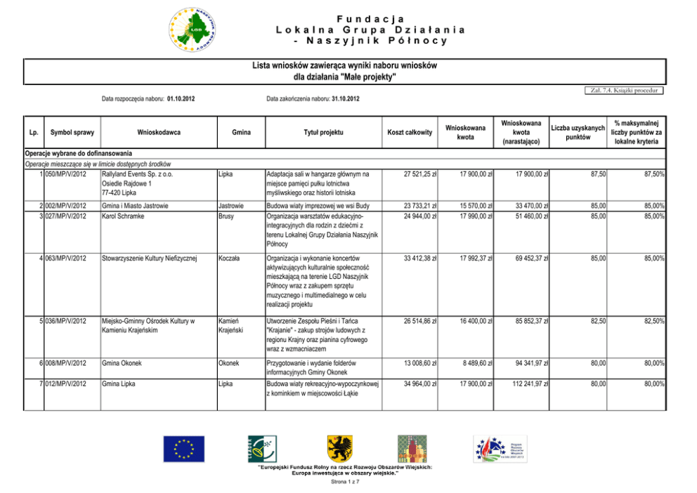 Lista wniosków zawierąca wyniki naboru wniosków dla działania "Małe projekty" Zał. 7.4. Książki procedur Data rozpoczęcia naboru: 01.10.2012 Lp. Symbol sprawy Wnioskodawca Operacje wybrane do dofinansowania Operacje mieszczące się w limicie dostępnych środków 1 050/MP/V/2012 Rallyland Events Sp. z o.o. Osiedle Rajdowe 1 77-420 Lipka Data zakończenia naboru: 31.10.2012 Gmina Tytuł projektu Koszt całkowity Wnioskowana kwota Wnioskowana kwota (narastająco) % maksymalnej Liczba uzyskanych liczby punktów za punktów lokalne kryteria Lipka Adaptacja sali w hangarze głównym na miejsce pamięci pułku lotnictwa myśliwskiego oraz historii lotniska 27 521,25 zł 17 900,00 zł 17 900,00 zł 87,50 87,50% 2 002/MP/V/2012 3 027/MP/V/2012 Gmina i Miasto Jastrowie Karol Schramke Jastrowie Brusy Budowa wiaty imprezowej we wsi Budy Organizacja warsztatów edukacyjnointegracyjnych dla rodzin z dziećmi z terenu Lokalnej Grupy Działania Naszyjnik Północy 23 733,21 zł 24 944,00 zł 15 570,00 zł 17 990,00 zł 33 470,00 zł 51 460,00 zł 85,00 85,00 85,00% 85,00% 4 063/MP/V/2012 Stowarzyszenie Kultury Niefizycznej Koczała Organizacja i wykonanie koncertów aktywizujących kulturalnie społeczność mieszkającą na terenie LGD Naszyjnik Północy wraz z zakupem sprzętu muzycznego i multimedialnego w celu realizacji projektu 33 412,38 zł 17 992,37 zł 69 452,37 zł 85,00 85,00% 5 036/MP/V/2012 Miejsko-Gminny Ośrodek Kultury w Kamieniu Krajeńskim Kamień Krajeński Utworzenie Zespołu Pieśni i Tańca "Krajanie" - zakup strojów ludowych z regionu Krajny oraz pianina cyfrowego wraz z wzmacniaczem 26 514,86 zł 16 400,00 zł 85 852,37 zł 82,50 82,50% 6 008/MP/V/2012 Gmina Okonek Okonek Przygotowanie i wydanie folderów informacyjnych Gminy Okonek 13 008,60 zł 8 489,60 zł 94 341,97 zł 80,00 80,00% 7 012/MP/V/2012 Gmina Lipka Lipka Budowa wiaty rekreacyjno-wypoczynkowej z kominkiem w miejscowości Łąkie 34 964,00 zł 17 900,00 zł 112 241,97 zł 80,00 80,00% Strona 1 z 7 Lp. Symbol sprawy Wnioskodawca Operacje wybrane do dofinansowania 8 026/MP/V/2012 Justyna Halusiak-Toruń Gmina Tytuł projektu Koszt całkowity Wnioskowana kwota Wnioskowana kwota (narastająco) % maksymalnej Liczba uzyskanych liczby punktów za punktów lokalne kryteria Przechlewo Utworzenie wypożyczalni sprzętu rekreacyjnego w miejscowości Kleśnik 36 492,96 zł 17 990,00 zł 130 231,97 zł 80,00 80,00% Czarneńskie Centrum Kultury Czarne "Niech się święci jubileusz…" obchody jubileuszu 30-lecia zespołu "Pomorzanki" i 5-lecia zespołu "Serenada" 40 570,55 zł 14 730,00 zł 144 961,97 zł 80,00 80,00% 10 059/MP/V/2012 Anna Kazimiera Grubich Lipka Zagospodarowanie zielenią ogrodu relaksowego 29 761,70 zł 17 900,00 zł 162 861,97 zł 80,00 80,00% 11 005/MP/V/2012 Canoe Przechlewo Karolina Baranowska Przechlewo Doposażenie firmy Canoe Przechlewo Karolina Baranowska w akcesoria i sprzęt kajakarski 21 589,08 zł 13 916,80 zł 176 778,77 zł 77,50 77,50% 12 048/MP/V/2012 "Odejewski-Odan" Spółka z ograniczoną odpowiedzialnością Człuchów Canponyland 33 536,00 zł 17 999,99 zł 194 778,76 zł 77,50 77,50% 13 004/MP/V/2012 Canoe Przechlewo Karolina Baranowska Przechlewo Stworzenie wioski indiańskiej jako alternatywnej formy wypoczynku na terenie gminy Przechlewo 19 902,80 zł 12 958,56 zł 207 737,32 zł 75,00 75,00% 14 014/MP/V/2012 Spółdzielnia Mieszkaniowa "Zacisze" w Lipce Lipka Utworzenie miejsca rekreacji dla dzieci i dorosłych na osiedlu mieszkaniowym w Lipce 27 132,27 zł 19 990,00 zł 227 727,32 zł 75,00 75,00% 15 015/MP/V/2012 Stowarzyszenie Przyjaciół Szkoły "Aktywna Okonek Trójwieś" Budowa placu zabaw w Pniewie 18 770,51 zł 13 800,00 zł 241 527,32 zł 75,00 75,00% 16 016/MP/V/2012 Przedsiębiorstwo Usługowe Tomasz Biały/Biały Gryfice Utworzenie internetowego portalu agroturystycznego dla obszaru LGD "Naszyjnik Północy" 33 656,80 zł 24 000,00 zł 265 527,32 zł 75,00 75,00% 17 019/MP/V/2012 Joanna Lucyna Szyszka Człuchów Metal, glina i wiklina - wykorzystując zasoby natury i rąk - Warsztaty Rękodzieła 10 179,30 zł 8 143,44 zł 273 670,76 zł 75,00 75,00% 18 028/MP/V/2012 Stowarzyszenie Przyjaciół Gminy Koczała Koczała Budowa małej infrastruktury turystycznej nad jeziorem Bardo i Resko I oraz wyznaczenie ścieżki rowerowej 39 803,62 zł 24 000,00 zł 297 670,76 zł 75,00 75,00% 9 053/MP/V/2012 Strona 2 z 7 Lp. Symbol sprawy Wnioskodawca Operacje wybrane do dofinansowania 19 029/MP/V/2012 Gminny Klub Sportowy "Drzewiarz" Rzeczenica Gmina Tytuł projektu Koszt całkowity Wnioskowana kwota Wnioskowana kwota (narastająco) % maksymalnej Liczba uzyskanych liczby punktów za punktów lokalne kryteria Rzeczenica Docieplenie elewacji budynku szatni na ogólnodostępnym boisku sportowym wraz z wymianą stolarki zewnętrznej 36 222,48 zł 17 999,00 zł 315 669,76 zł 75,00 75,00% 20 007/MP/V/2012 Gmina Okonek Okonek Wymiana elementów placu zabaw w miejscowości Okonek 28 960,00 zł 17 483,45 zł 333 153,21 zł 72,50 72,50% 21 039/MP/V/2012 Stowarzyszenie "Nad Głomią" Zakrzewo Wydanie mapy, zawierającej obiekty lokalnego dziedzictwa kulturowego i historycznego sołectwa Głomsk 5 142,10 zł 3 644,20 zł 336 797,41 zł 72,50 72,50% 22 047/MP/V/2012 Katarzyna Gilewicz - Górnaś Człuchów Organizacja warsztatów artystycznych dla dzieci w miejscowości Wierzchowo Człuchowskie 23 952,00 zł 17 900,00 zł 354 697,41 zł 72,50 72,50% 23 055/MP/V/2012 Gmina Koczała Koczała Opracowanie mapy gminy w wersji interaktywnej i wydanie folderu promującego walory turystyczne i przyrodnicze Gminy Koczała 6 638,40 zł 4 960,00 zł 359 657,41 zł 72,50 72,50% 24 006/MP/V/2012 Gmina Przechlewo Przechlewo Wydanie publikacji informacyjnopromocyjnych o ścieżkach pieszo rowerowych na terenie Gminy Przechlewo 23 202,00 zł 17 390,00 zł 377 047,41 zł 70,00 70,00% 25 010/MP/V/2012 Gmina Człuchów Człuchów Zakup wyposażenia do świetlic wiejskich na terenie Gminy Człuchów 10 7