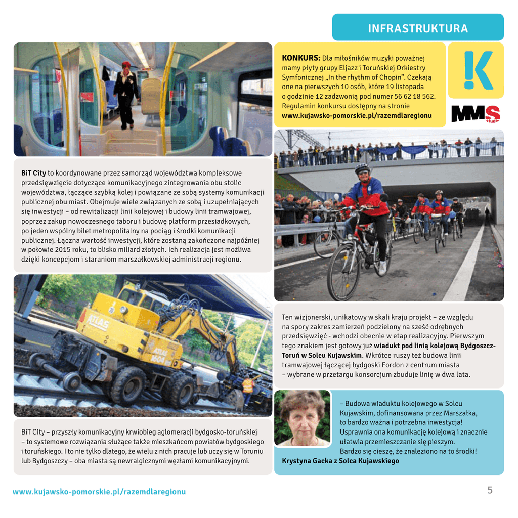 infrastruktura KONKURS: Dla miłośników muzyki poważnej mamy płyty grupy Eljazz i Toruńskiej Orkiestry Symfonicznej „In the rhythm of Chopin”. Czekają one na pierwszych 10 osób, które 19 listopada o godzinie 12 zadzwonią pod numer 56 62 18 562. Regulamin konkursu dostępny na stronie www.kujawsko-pomorskie.pl/razemdlaregionu BiT City to koordynowane przez samorząd województwa kompleksowe przedsięwzięcie dotyczące komunikacyjnego zintegrowania obu stolic województwa, łączące szybką kolej i powiązane ze sobą systemy komunikacji publicznej obu miast. Obejmuje wiele związanych ze sobą i uzupełniających się inwestycji – od rewitalizacji linii kolejowej i budowy linii tramwajowej, poprzez zakup nowoczesnego taboru i budowę platform przesiadkowych, po jeden wspólny bilet metropolitalny na pociąg i środki komunikacji publicznej. Łączna wartość inwestycji, które zostaną zakończone najpóźniej w połowie 2015 roku, to blisko miliard złotych. Ich realizacja jest możliwa dzięki koncepcjom i staraniom marszałkowskiej administracji regionu. Ten wizjonerski, unikatowy w skali kraju projekt – ze względu na spory zakres zamierzeń podzielony na sześć odrębnych przedsięwzięć - wchodzi obecnie w etap realizacyjny. Pierwszym tego znakiem jest gotowy już wiadukt pod linią kolejową BydgoszczToruń w Solcu Kujawskim . Wkrótce ruszy też budowa linii tramwajowej łączącej bydgoski Fordon z centrum miasta – wybrane w przetargu konsorcjum zbuduje linię w dwa lata. BiT City – przyszły komunikacyjny krwiobieg aglomeracji bydgosko-toruńskiej – to systemowe rozwiązania służące także mieszkańcom powiatów bydgoskiego i toruńskiego. I to nie tylko dlatego, że wielu z nich pracuje lub uczy się w Toruniu lub Bydgoszczy – oba miasta są newralgicznymi węzłami komunikacyjnymi. www.kujawsko-pomorskie.pl/razemdlaregionu – Budowa wiaduktu kolejowego w Solcu Kujawskim, dofinansowana przez Marszałka, to bardzo ważna i potrzebna inwestycja! Usprawnia ona komunikację kolejową i znacznie ułatwia przemieszczanie się pieszym. Bardzo się cieszę, że znaleziono na to środki! Krystyna Gacka z Solca Kujawskiego 5