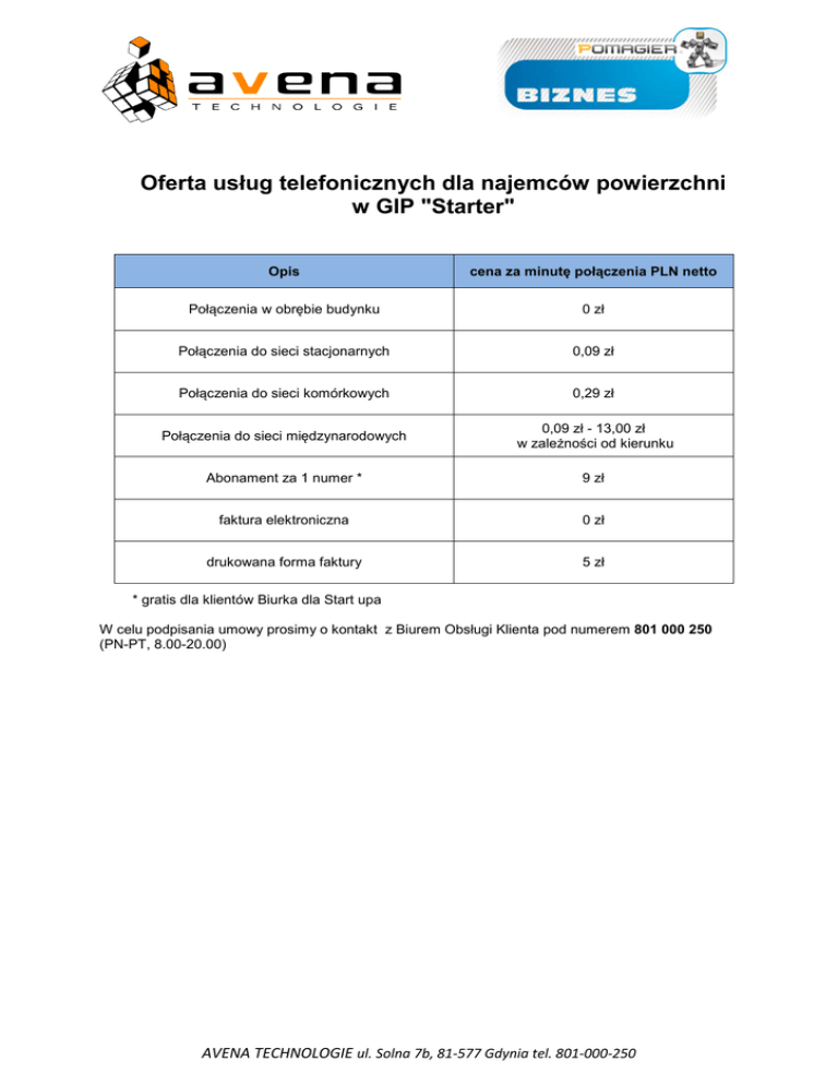 Oferta usług telefonicznych dla najemców powierzchni w GIP "Starter" Opis cena za minutę połączenia PLN netto Połączenia w obrębie budynku 0 zł Połączenia do sieci stacjonarnych 0,09 zł Połączenia do sieci komórkowych 0,29 zł Połączenia do sieci międzynarodowych 0,09 zł - 13,00 zł w zależności od kierunku Abonament za 1 numer * 9 zł faktura elektroniczna 0 zł drukowana forma faktury 5 zł * gratis dla klientów Biurka dla Start upa W celu podpisania umowy prosimy o kontakt z Biurem Obsługi Klienta pod numerem 801 000 250 (PN-PT, 8.00-20.00) AVENA TECHNOLOGIE ul. Solna 7b, 81-577 Gdynia tel. 801-000-250
