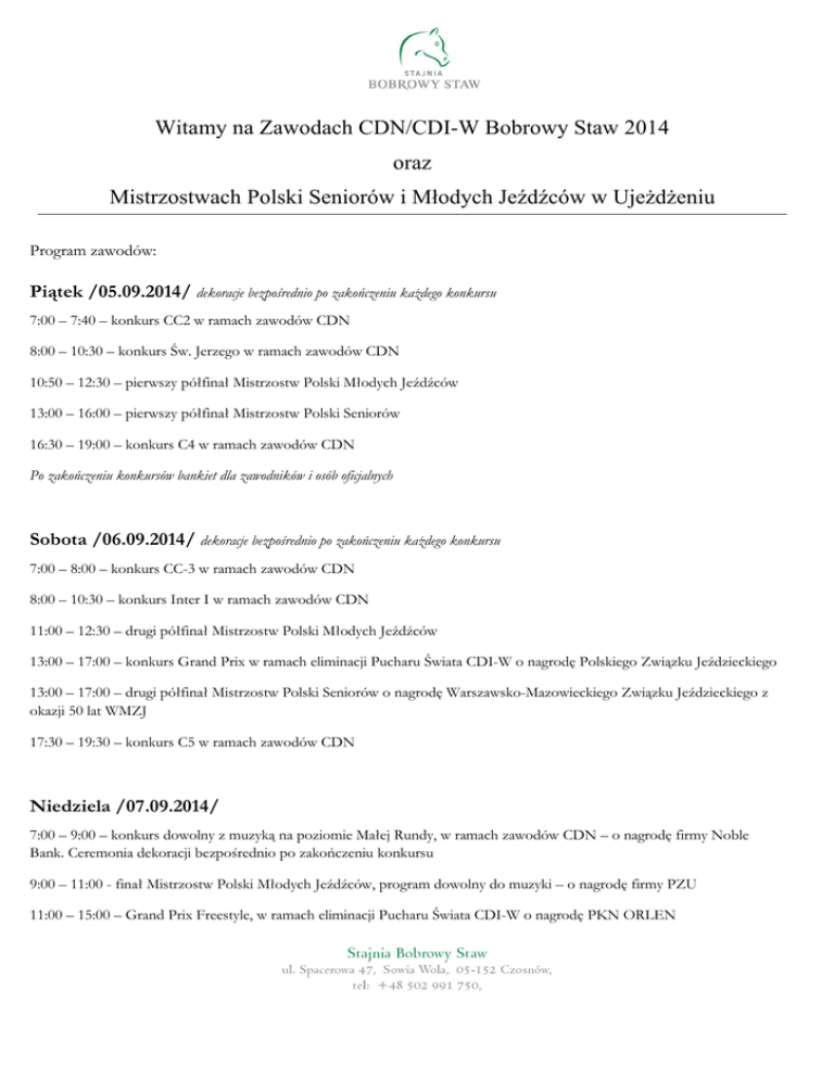 Witamy na Zawodach CDN/CDI-W Bobrowy Staw 2014 oraz Mistrzostwach Polski Seniorów i Młodych Jeźdźców w Ujeżdżeniu Program zawodów: Piątek /05.09.2014/ dekoracje bezpośrednio po zakończeniu każdego konkursu 7:00 – 7:40 – konkurs CC2 w ramach zawodów CDN 8:00 – 10:30 – konkurs Św. Jerzego w ramach zawodów CDN 10:50 – 12:30 – pierwszy półfinał Mistrzostw Polski Młodych Jeźdźców 13:00 – 16:00 – pierwszy półfinał Mistrzostw Polski Seniorów 16:30 – 19:00 – konkurs C4 w ramach zawodów CDN Po zakończeniu konkursów bankiet dla zawodników i osób oficjalnych Sobota /06.09.2014/ dekoracje bezpośrednio po zakończeniu każdego konkursu 7:00 – 8:00 – konkurs CC-3 w ramach zawodów CDN 8:00 – 10:30 – konkurs Inter I w ramach zawodów CDN 11:00 – 12:30 – drugi półfinał Mistrzostw Polski Młodych Jeźdźców 13:00 – 17:00 – konkurs Grand Prix w ramach eliminacji Pucharu Świata CDI-W o nagrodę Polskiego Związku Jeździeckiego 13:00 – 17:00 – drugi półfinał Mistrzostw Polski Seniorów o nagrodę Warszawsko-Mazowieckiego Związku Jeździeckiego z okazji 50 lat WMZJ 17:30 – 19:30 – konkurs C5 w ramach zawodów CDN Niedziela /07.09.2014/ 7:00 – 9:00 – konkurs dowolny z muzyką na poziomie Małej Rundy, w ramach zawodów CDN – o nagrodę firmy Noble Bank. Ceremonia dekoracji bezpośrednio po zakończeniu konkursu 9:00 – 11:00 - finał Mistrzostw Polski Młodych Jeźdźców, program dowolny do muzyki – o nagrodę firmy PZU 11:00 – 15:00 – Grand Prix Freestyle, w ramach eliminacji Pucharu Świata CDI-W o nagrodę PKN ORLEN 11:00 – 15:00 – finał Mistrzostw Polski Seniorów o nagrodę Prezesa SSKJ Bobrowy Staw 15:00 – 15:40 – ceremonia dekoracji Mistrzostw Polski Seniorów i Młodych jeźdźców, oraz zawodów międzynarodowych z udziałem przedstawicieli sponsorów PKN ORLEN, PZU, Noble Bank 16:00 – 16:30 – konkurs CC-6 w ramach zawodów CDN – o nagrodę firmy Equipe 17:00 – 19:00 – konkurs C-6 w ramach zawodów CDN – o nagrodę Wójta Gminy Czosnów