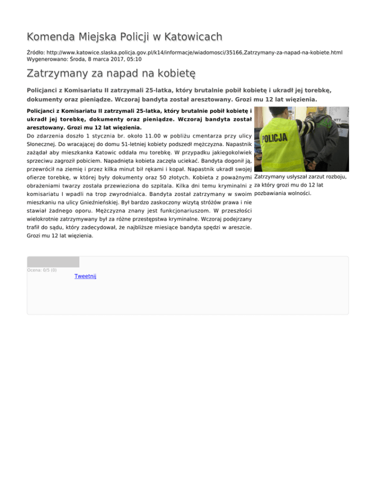 Komenda Miejska Policji w Katowicach Źródło: http://www.katowice.slaska.policja.gov.pl/k14/informacje/wiadomosci/35166,Zatrzymany-za-napad-na-kobiete.html Wygenerowano: Środa, 8 marca 2017, 05:10 Zatrzymany za napad na kobietę Policjanci z Komisariatu II zatrzymali 25-latka, który brutalnie pobił kobietę i ukradł jej torebkę, dokumenty oraz pieniądze. Wczoraj bandyta został aresztowany. Grozi mu 12 lat więzienia. Policjanci z Komisariatu II zatrzymali 25-latka, który brutalnie pobił kobietę i ukradł jej torebkę, dokumenty oraz pieniądze. Wczoraj bandyta został aresztowany. Grozi mu 12 lat więzienia. Do zdarzenia doszło 1 stycznia br. około 11.00 w pobliżu cmentarza przy ulicy Słonecznej. Do wracającej do domu 51-letniej kobiety podszedł mężczyzna. Napastnik zażądał aby mieszkanka Katowic oddała mu torebkę. W przypadku jakiegokolwiek sprzeciwu zagroził pobiciem. Napadnięta kobieta zaczęła uciekać. Bandyta dogonił ją, przewrócił na ziemię i przez kilka minut bił rękami i kopał. Napastnik ukradł swojej ofierze torebkę, w której były dokumenty oraz 50 złotych. Kobieta z poważnymi Zatrzymany usłyszał zarzut rozboju, obrażeniami twarzy została przewieziona do szpitala. Kilka dni temu kryminalni z za który grozi mu do 12 lat komisariatu I wpadli na trop zwyrodnialca. Bandyta został zatrzymany w swoim pozbawiania wolności. mieszkaniu na ulicy Gnieźnieńskiej. Był bardzo zaskoczony wizytą stróżów prawa i nie stawiał żadnego oporu. Mężczyzna znany jest funkcjonariuszom. W przeszłości wielokrotnie zatrzymywany był za różne przestępstwa kryminalne. Wczoraj podejrzany trafił do sądu, który zadecydował, że najbliższe miesiące bandyta spędzi w areszcie. Grozi mu 12 lat więzienia. Ocena: 0/5 (0) Tweetnij