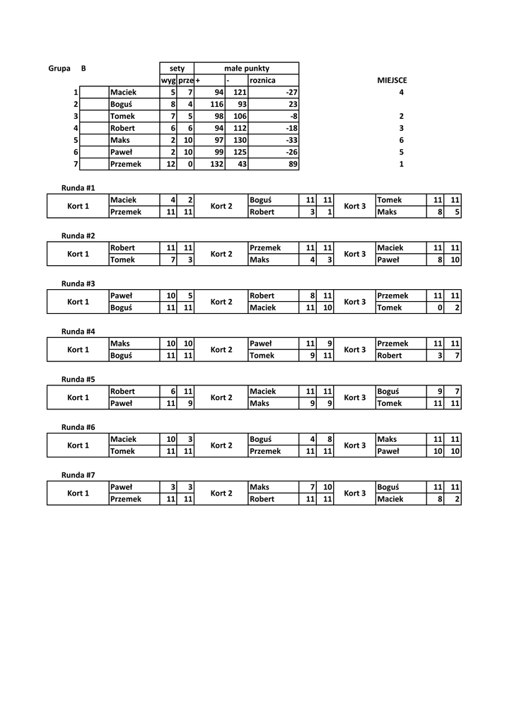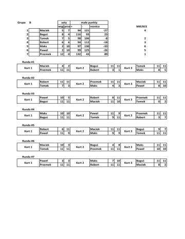 Grupa B 1 2 3 4 5 6 7 Maciek Boguś Tomek Robert Maks Paweł Przemek sety małepunkty wygrane przegrane + roznica 5 7 94 121 8 4 116 93 7 5 98 106 6 6 94 112 2 10 97 130 2 10 99 125 12 0 132 43 MIEJSCE 4 -27 23 -8 -18 -33 -26 89 2 3 6 5 1 Runda#1 Kort1 Maciek Przemek 4 2 11 11 Kort2 Boguś Robert 11 11 3 1 Kort3 Tomek Maks 11 11 8 5 Robert Tomek 11 11 7 3 Kort2 Przemek Maks 11 11 4 3 Kort3 Maciek Paweł 11 11 8 10 Paweł Boguś 10 5 11 11 Kort2 Robert Maciek 8 11 11 10 Kort3 Przemek Tomek 11 11 0 2 Maks Boguś 10 10 11 11 Kort2 Paweł Tomek 11 9 9 11 Kort3 Przemek Robert 11 11 3 7 Robert Paweł 6 11 11 9 Kort2 Maciek Maks 11 11 9 9 Kort3 Boguś Tomek 9 7 11 11 Maciek Tomek 10 3 11 11 Kort2 Boguś Przemek 4 8 11 11 Kort3 Maks Paweł 11 11 10 10 Paweł Przemek 3 3 11 11 Kort2 Maks Robert 7 10 11 11 Kort3 Boguś Maciek 11 11 8 2 Runda#2 Kort1 Runda#3 Kort1 Runda#4 Kort1 Runda#5 Kort1 Runda#6 Kort1 Runda#7 Kort1