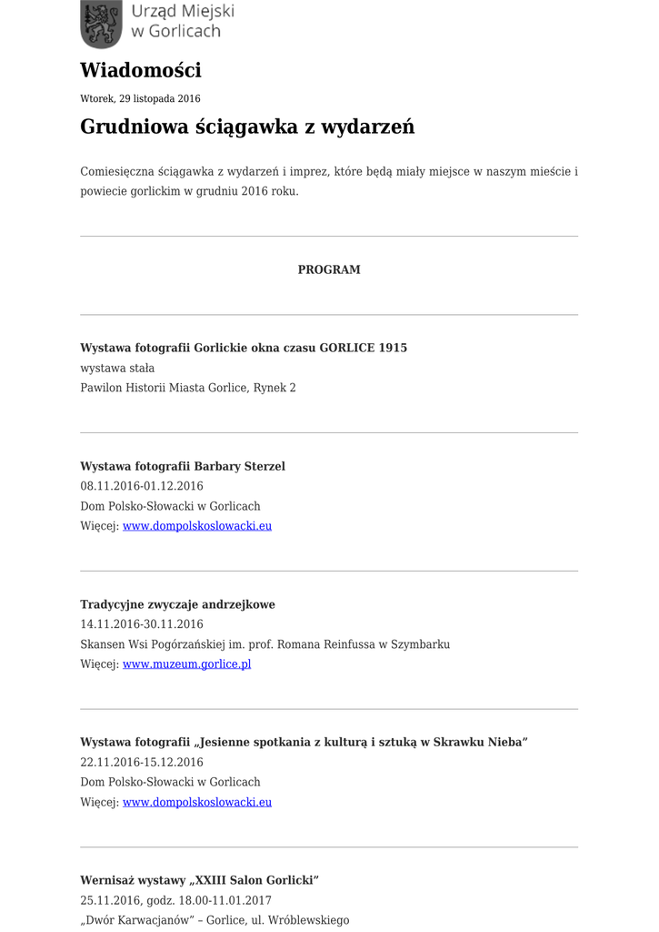 Wiadomości Wtorek, 29 listopada 2016 Grudniowa ściągawka z wydarzeń Comiesięczna ściągawka z wydarzeń i imprez, które będą miały miejsce w naszym mieście i powiecie gorlickim w grudniu 2016 roku. PROGRAM Wystawa fotografii Gorlickie okna czasu GORLICE 1915 wystawa stała Pawilon Historii Miasta Gorlice, Rynek 2 Wystawa fotografii Barbary Sterzel 08.11.2016-01.12.2016 Dom Polsko-Słowacki w Gorlicach Więcej: www.dompolskoslowacki.eu Tradycyjne zwyczaje andrzejkowe 14.11.2016-30.11.2016 Skansen Wsi Pogórzańskiej im. prof. Romana Reinfussa w Szymbarku Więcej: www.muzeum.gorlice.pl Wystawa fotografii „Jesienne spotkania z kulturą i sztuką w Skrawku Nieba” 22.11.2016-15.12.2016 Dom Polsko-Słowacki w Gorlicach Więcej: www.dompolskoslowacki.eu Wernisaż wystawy „XXIII Salon Gorlicki” 25.11.2016, godz. 18.00-11.01.2017 „Dwór Karwacjanów” – Gorlice, ul. Wróblewskiego Więcej: www.muzeum.gorlice.pl Wystawa fotografii Jacka Kosiby 25.11.2016-11.01.2017 „Dwór Karwacjanów” – Gorlice, ul. Wróblewskiego Więcej: www.muzeum.gorlice.pl „Tradycje łemkowskie w życiu i sztuce Jerzego Nowosielskiego” 27.11.2016, godz. 17.00 Centrum Kultury im. B.I. Antonycza, P. Dworzysko 5, Gorlice Wystawa "II wojna światowa. Epizody z udziałem mieszkańców Ziemi Gorlickiej. Tajne nauczanie." 29.11.2016-10.02.2017 Muzeum Regionalne PTTK w Gorlicach Więcej: www.gorlice.pttk.pl Święta w Zagrodzie 01.12.2016-23.12.2016 Zagroda Maziarska w Łosiu Więcej: www.muzeum.gorlice.pl Mikołajowe spotkania z dźwiękiem i kolorem 01.12.2016-09.12.2016 „Dwór Karwacjanów” – Gorlice, ul. Wróblewskiego Więcej: www.muzeum.gorlice.pl Warsztaty „Pleciemy” 01.12.2016, godz.18.00; 02.12.2016, godz. 18.00 Dom Polsko-Słowacki w Gorlicach Więcej: www.gck.gorlice.pl Spotkanie z Mikołajem w świetlicy GCK "Sokół" 02.12.2016, godz. 16.30 Świetlica GCK "Sokół" Więcej: www.gck.gorlice.pl Spotkanie z Mikołajem 04.12.2016, godz. 15.00 Gorlickie Centrum Kultury Więcej: www.gorlice.pl Bezpłatne konsultacje dla mieszkańców z pozyskiwania dofinansowania z Funduszy Europejskich 05.12.2016, godz. 08.30 Urząd Gminy Gorlice (Sala Konferencyjna), ul. 11 Listopada 2 Więcej: www.gorlice.pl Spotkanie Mikołajkowe w Bibliotece 05.12.2016, godz. 17.00 Miejska i Gminna Biblioteka Publiczna w Bieczu Więcej: www.biecz.pl Warsztaty „Tradycyjne ozdoby bożonarodzeniowe” 05.12.2016-22.12.2016 Skansen w Szymbarku Więcej: www.muzeum.gorlice.pl Mikołajkowe zawody pływackie dla dzieci 6.12.2016 Kryta pływalnia FALA w Gorlicach Więcej: www.osir.gorlice.pl Wystawa fotografii "Mój Beskid Niski" 07.12.2016-03.01.2017 Dom Polsko-Słowacki w Gorlicach Więcej: www.gck.gorlice.pl Kabaret Ani Mru Mru 09.12.2016, godz. 17.00 i 19.30 Gorlickie Centrum Kultury Więcej: www.gck.gorlice.pl Akcja "Szlachetna Paczka" 09.12.2016-11.12.2016 Pawilon Historii Miasta Gorlice, Rynek 2 Wernisaż wystawy „Nowe życie drewna” 10.12.2016, godz. 16.00 Wiejski Dom Kultury i Turystyki w Klimkówce Więcej: www.muzeum.gorlice.pl Warsztaty bożonarodzeniowe 13.12.2016-14.12.2016 Warsztaty Terapii Zajęciowej przy Stowarzyszeniu Na Rzecz Pomocy Rodzinie „Nadzieja” w Bieczu ul. Parkowa 1. Więcej: www.biecz.pl II Gorlicki Jarmark Bożonarodzeniowy 17.12.2016-20.12.2016 Gorlicki Rynek Więcej: www.gorlice.pl Turniej mikołajkowy i Festyn zimowy 17.12.2016, godz. 9.00-19.00 Hala sportowa OSiR w Gorlicach Więcej: www.gorlice.pl V Gorlicka Wigilia 18.12.2016, godz. 14.00 Gorlicki Rynek XXVI Gorlicki Bieg Sylwestrowy 31.12.2016, godz. 11.00 Gorlice Więcej: www.osir.gorlice.pl Dziecięcy Sylwester na lodzie 31.12.2016 Lodowisko Więcej: www.osir.gorlice.pl Sylwester na gorlickim Rynku 31.12.2016 Gorlicki Rynek Więcej: www.gorlice.pl Aktualne informacje o organizowanych w naszym regionie imprezach znajdziecie Państwo w zakładce WYDARZENIA.