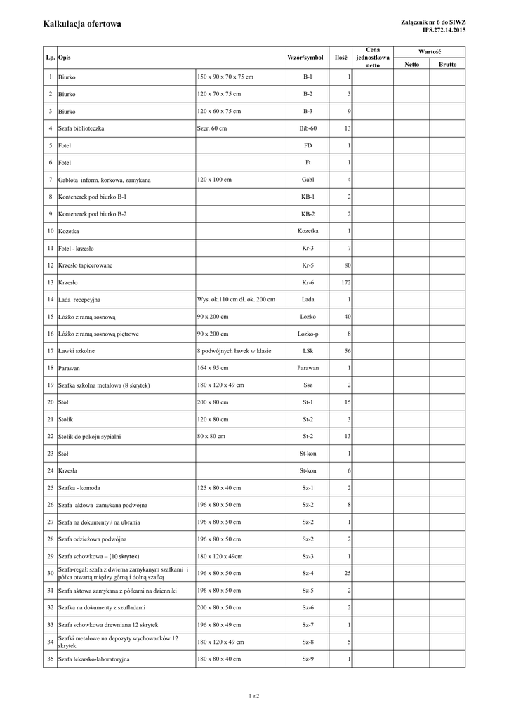 Załącznik nr 6 do SIWZ IPS.272.14.2015 Kalkulacja ofertowa Wzór/symbol Lp. Opis Cena jednostkowa netto Ilość 1 Biurko 150 x 90 x 70 x 75 cm B-1 1 2 Biurko 120 x 70 x 75 cm B-2 3 3 Biurko 120 x 60 x 75 cm B-3 9 4 Szafa biblioteczka Szer. 60 cm Bib-60 13 5 Fotel FD 1 6 Fotel Ft 1 Gabl 4 8 Kontenerek pod biurko B-1 KB-1 2 9 Kontenerek pod biurko B-2 KB-2 2 Kozetka 1 11 Fotel - krzesło Kr-3 7 12 Krzesło tapicerowane Kr-5 80 13 Krzesło Kr-6 172 7 Gablota inform. korkowa, zamykana 120 x 100 cm 10 Kozetka 14 Lada recepcyjna Wys. ok.110 cm dł. ok. 200 cm Lada 1 15 Łóżko z ramą sosnową 90 x 200 cm Lozko 40 16 Łóżko z ramą sosnową piętrowe 90 x 200 cm Lozko-p 8 17 Ławki szkolne 8 podwójnych ławek w klasie LSk 56 18 Parawan 164 x 95 cm Parawan 1 19 Szafka szkolna metalowa (8 skrytek) 180 x 120 x 49 cm Ssz 2 20 Stół 200 x 80 cm St-1 15 21 Stolik 120 x 80 cm St-2 3 22 Stolik do pokoju sypialni 80 x 80 cm St-2 13 23 Stół St-kon 1 24 Krzesła St-kon 6 25 Szafka - komoda 125 x 80 x 40 cm Sz-1 2 26 Szafa aktowa zamykana podwójna 196 x 80 x 50 cm Sz-2 8 27 Szafa na dokumenty / na ubrania 196 x 80 x 50 cm Sz-2 1 28 Szafa odzieżowa podwójna 196 x 80 x 50 cm Sz-2 2 29 Szafa schowkowa – (10 skrytek) 180 x 120 x 49cm Sz-3 1 196 x 80 x 50 cm Sz-4 25 31 Szafa aktowa zamykana z półkami na dzienniki 196 x 80 x 50 cm Sz-5 2 32 Szafka na dokumenty z szufladami 200 x 80 x 50 cm Sz-6 2 33 Szafa schowkowa drewniana 12 skrytek 196 x 80 x 49 cm Sz-7 1 180 x 120 x 49 cm Sz-8 5 180 x 80 x 40 cm Sz-9 1 30 34 Szafa-regał: szafa z dwiema zamykanym szafkami i półka otwartą między górną i dolną szafką Szafki metalowe na depozyty wychowanków 12 skrytek 35 Szafa lekarsko-laboratoryjna 1z2 Wartość Netto Brutto Załącznik nr 6 do SIWZ IPS.272.14.2015 Kalkulacja ofertowa 36 Szafa sosnowa /półki/szuflady Szer. 47 cm Szs-47 13 37 Szafa sosnowa wieszak/4 półki 2 drzwiowa Szer. 80 cm Szs-80 13 38 Dywanik -chodnik 200 x 150 cm 13 39 Lampki nocne Kinkiety lub żabki 56 40 Ławki gimnastyczne z drewnianymi nogami 400 cm 41 Materac 90 x 200 cm 56 42 Maty/materace do ćwiczeń 200 x 120 cm 8 43 Regał z pólkami zamykanymi i otwartymi 196 x 80 x 40 cm 1 44 Stolik roboczy metalowy 180 x 80 cm 1 45 Stół kuchenny 180 x 80 cm 1 46 Stół długi składany konferencyjny 180 x 800 cm 1 47 Szafka kuchenna zamykana 124 x 80 x 40 cm 1 48 Szafka pod zlewozmywak 80 cm 2 49 Szuflada sosnowa na pościel Pod łóżko 50 Tablica biała 150 x 120 cm Na mazaki suchościeralne 7 51 Tablica korkowa 200 x 150 cm 2 8 56 Razem: 2z2 ……………….. …………………………………………….. Miejsce, data Podpis i pieczątka (uprawniony przedstawiciel Wykonawcy)