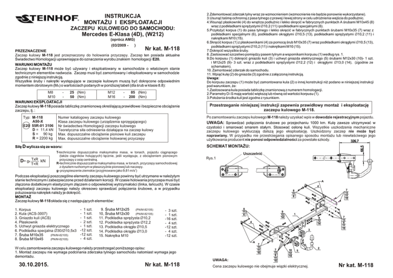 INSTRUKCJA MONTA¯U I EKSPLOATACJI ZACZEPU KULOWEGO DO SAMOCHODU: Mercedes E-Klasa (4D), (W212) (oprócz AMG) (03/2009 - ®) Nr kat. M-118 PRZEZNACZENIE Zaczep kulowy M-118 jest przeznaczony do holowania przyczepy. Zaczep ten posiada aktualne Œwiadectwo Homologacji uprawniaj¹ce do oznaczenia wyrobu znakiem homologacji E20. WARUNKI MONTA¯U Zaczep kulowy M-118 mo¿e byæ u¿ywany i eksploatowany w samochodzie o w³aœciwym stanie technicznym elementów nadwozia. Zaczep musi byæ zamontowany i eksploatowany w samochodzie zgodnie z niniejsz¹ instrukcj¹. Wszystkie œruby i nakrêtki wystêpuj¹ce w zaczepie kulowym musz¹ byæ dokrêcone odpowiednim momentem obrotowym (Mo) o wartoœciach podanych w poni¿szej tabeli (dla œrub w klasie 8.8): M8 25 (Nm) M12 85 (Nm) M10 50 (Nm) M16 - 200 (Nm) WARUNKI EKSPLOATACJI Zaczep kulowy M-118 posiada tabliczkê znamionow¹ okreœlaj¹c¹ prawid³owe i bezpieczne obci¹¿enie zaczepu, tj. : Po zamontowaniu zaczepu kulowego M-118 nale¿y uzyskaæ wpis w dowodzie rejestracyjnym pojazdu. Numer katalogowy zaczepu kulowego Klasa zaczepu kulowego (urz¹dzenia sprzêgaj¹cego) Nr œwiadectwa Homologacji zaczepu kulowego Teoretyczna si³a odniesienia dzia³aj¹ca na zaczep kulowy Max. dopuszczalne obci¹¿enie pionowe kuli zaczepu Max. dopuszczalne obci¹¿enie holowanej przyczepy UWAGA: Sprawdzaæ po³¹czenia œrubowe po przejechaniu 1000 km. Kulê zawsze utrzymywaæ w czystoœci i smarowaæ smarem sta³ym. Stosowaæ os³onê kuli. Wszystkie uszkodzenia mechaniczne zaczepu kulowego wykluczaj¹ dalsz¹ jego eksploatacjê. Uszkodzony zaczep nie mo¿e byæ naprawiany. W przypadku nie przestrzegania opisanego sposobu monta¿u lub niew³aœciwego jego u¿ytkowania producent nie ponosi odpowiedzialnoœci za powsta³e szkody. 326,7 Si³ê D wylicza siê ze wzoru: D= gx TxR kN T+R Przestrzeganie niniejszej instrukcji zapewnia prawid³owy monta¿ i eksploatacjê zaczepu kulowego M-118. SCHEMAT MONTA¯U: T-technicznie dopuszczalna maksymalna masa, w tonach, pojazdu ci¹gn¹cego (tak¿e ci¹gników holuj¹cych) ³¹cznie, jeœli wystêpuje, z obci¹¿eniem pionowym przyczepy z osiê centraln¹. R-technicznie dopuszczalna maksymalna masa, w tonach, przyczepy samochodowej z dyszlem ruchomym w p³aszczyŸnie pionowej lub naczepy. g- przyspieszenie ziemskie (przyjmowane jako 9,81 m/s2) 66,5 Typ: M-118 A50-X E20 55R-01 3106 D = 11,4 kN S = 90 kg R = 2200 kg 2.Zdemontowaæ zderzak tylny wraz ze wzmocnieniem (wzmocnienie nie bêdzie ponownie wykorzystane). 3.Usun¹æ taœmê ochronn¹ z pasa tylnego z prawej i lewej strony w celu udro¿nienia wejœcia do pod³u¿nic. 4.Wsun¹æ p³askowniki (4) do wnêtrza pod³u¿nic i lekko skrêciæ w fabrycznych punktach A œrubami M10x45 (8) wraz z podk³adkami sprê¿ystymi Ø10,2 (11) i podk³adkami specjalnymi (6). 5.Przy³o¿yæ korpus (1) do pasa tylnego i lekko skrêciæ w fabrycznych punktach œrubami M10x35 (7) wraz z podk³adkami specjalnymi (6), podk³adkami okr¹g³ymi Ø10,5 (13), podk³adkami sprê¿ystymi Ø10,2 (11) i nakrêtkami M10 (15). 6.Skrêciæ korpus (1) z p³askownikami (4) za pomoc¹ œrub M10x35 (7) wraz podk³adkami okr¹g³ymi Ø10,5 (13), podk³adkami sprê¿ystymi Ø10,2 (11) i nakrêtkami M10 (15). 7.Dokrêciæ wszystkie œruby. 8. Zastosowaæ szczeliwo pomiêdzy pasem tylnym a wspornikami korpusu (1) wed³ug rys. 1. 9.Do korpusu (1) dokrêciæ gniazdo kuli (3) i uchwyt gniazda elektrycznego (5) œrubami M12x30 (10)- 1 szt. i M12x25 (9)- 3 szt. wraz z podk³adkami sprê¿ystymi Ø12,2 (12) i okr¹g³ymi Ø13,0 (14), (zgodnie ze schematem). 10. Zamontowaæ zderzak do samochodu. 11. Wpi¹æ kulê (2) do gniazda (3) zgodnie z za³¹czon¹ instrukcj¹. Uwaga: Do korpusu zaczepu (1) mo¿e byæ zamontowana kula (2) o innej konstrukcji ni¿ podano w niniejszej instrukcji pod warunkiem, ¿e: 1.Zastosowana kula posiada tabliczkê znamionow¹ z numerem homologacji. 2.Parametry D i S maj¹ wartoœæ wiêksz¹ lub równ¹ od wartoœci korpusu (1). 3.Po³o¿enia œrodka kuli jest zgodne z rysunkiem. Uszczelniæ Rys.1 Podczas eksploatacji poszczególne elementy zaczepu kulowego powinny byæ utrzymane w nale¿ytym stanie technicznym i zabezpieczone przed dzia³aniem korozji. W czasie holowania przyczepa musi byæ z³¹czona dodatkowym elastycznym z³¹czem o odpowiedniej wytrzyma³oœci (linka, ³añcuch). W czasie eksploatacji zaczepu kulowego nale¿y okresowo sprawdzaæ po³¹czenia œrubowe, a w przypadku poluzowania nakrêtek nale¿y je dokrêciæ. MONTA¯ Zaczep kulowy M-118 sk³ada siê z nastêpuj¹cych elementów: 1. Korpus 2. Kula (ACS-3007) 3. Gniazdo kuli (ACS) 4. P³askownik 5. Uchwyt gniazda elektrycznego 6. Podk³adka specjalna Ø30/Ø10,5x3 7. Œruba M10x35 (PN/M-82105) 8. Œruba M10x45 (PN/M-82105) - 1 szt. - 1 szt. - 1 szt. - 2 szt. - 1 szt. -12 szt. -12 szt. - 4 szt. 9. Œruba M12x25 (PN/M-82105) 10, Œruba M12x30 (PN/M-82105) 11. Podk³adka sprê¿ysta Ø10,2 12. Podk³adka sprê¿ysta Ø12,2 13. Podk³adka okr¹g³a Ø10,5 14. Podk³adka okr¹g³a Ø13,0 15. Nakrêtka M10 A 4 8 11 6 - 3 szt. - 1 szt. -16 szt. - 4 szt. -12 szt. - 4 szt. -12 szt. 9 12 14 9 12 14 3 A UWAGA: Nr kat. M-118 1 4 W celu zamontowania zaczepu kulowego nale¿y przestrzegaæ poni¿szego opisu: 1. Monta¿ zaczepu nie wymaga podcinania zderzaka tylnego samochodu natomiast wymaga jego demonta¿u. 30.10.2015. 7 13 11 15 8 11 6 7 13 11 15 7 13 6 11 15 10 12 14 5 Cena zaczepu kulowego nie obejmuje wi¹zki elektrycznej. 7 13 6 11 15 2 Nr kat. M-118 TOW BAR FOR Mercedes E-Class (4D), (W212) (except AMG) (03/2009 - ®) FITTING AND OPERATION MANUAL Cat. No.M-118 DESTINATION Tow bar M-118 is designed for towing a trailer. This ball hook has a current certification of approval authorizing the product with E20 certification sign. FITTING CONDITIONS Tow bar M-118 can be used and operated in a car with proper technical conditions of body elements. Those parts cannot be mechanically damaged . The ball hook has to be installed and operated in a 
