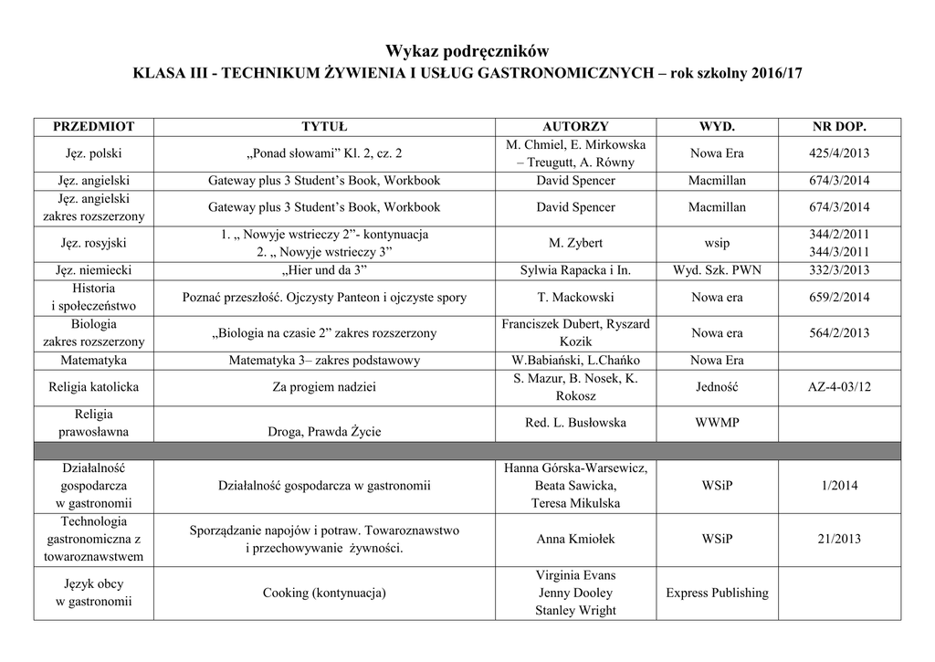 Wykaz podręczników KLASA III - TECHNIKUM ŻYWIENIA I USŁUG GASTRONOMICZNYCH – rok szkolny 2016/17 PRZEDMIOT TYTUŁ Jęz. polski „Ponad słowami” Kl. 2, cz. 2 Jęz. angielski Jęz. angielski zakres rozszerzony Jęz. rosyjski Jęz. niemiecki Historia i społeczeństwo Biologia zakres rozszerzony Matematyka Gateway plus 3 Student’s Book, Workbook AUTORZY M. Chmiel, E. Mirkowska – Treugutt, A. Równy David Spencer Gateway plus 3 Student’s Book, Workbook Nowa Era 425/4/2013 Macmillan 674/3/2014 David Spencer Macmillan 674/3/2014 M. Zybert wsip Sylwia Rapacka i In. Wyd. Szk. PWN 344/2/2011 344/3/2011 332/3/2013 Poznać przeszłość. Ojczysty Panteon i ojczyste spory T. Mackowski Nowa era 659/2/2014 „Biologia na czasie 2” zakres rozszerzony Franciszek Dubert, Ryszard Kozik W.Babiański, L.Chańko S. Mazur, B. Nosek, K. Rokosz Nowa era 564/2/2013 Nowa Era Red. L. Busłowska WWMP Działalność gospodarcza w gastronomii Hanna Górska-Warsewicz, Beata Sawicka, Teresa Mikulska WSiP 1/2014 Sporządzanie napojów i potraw. Towaroznawstwo i przechowywanie żywności. Anna Kmiołek WSiP 21/2013 Cooking (kontynuacja) Virginia Evans Jenny Dooley Stanley Wright Express Publishing Matematyka 3– zakres podstawowy Za progiem nadziei Religia prawosławna Droga, Prawda Życie Język obcy w gastronomii NR DOP. 1. „ Nowyje wstrieczy 2”- kontynuacja 2. „ Nowyje wstrieczy 3” „Hier und da 3” Religia katolicka Działalność gospodarcza w gastronomii Technologia gastronomiczna z towaroznawstwem WYD. Jedność AZ-4-03/12 Zasady żywienia Organizacja produkcji gastronomicznej Usługi gastronomiczne Procesy technologiczne w gastronomii Planowanie żywienia i produkcji gastronomicznej Obsługa klientów w gastronomii Zasady żywienia. Planowanie i ocena H. Kunachowicz wsip Organizacja produkcji gastronomicznej Anna Kmiołek WSiP 23/2013 Usługi gastronomiczne Renata Szajna, Danuta Ławniczak WSiP, REA 33/2015 „Sporządzanie i ekspedycja potraw i napojów” cześć 2 Anna Kmiołek WSiP 65/2013 Renata Szajna, Danuta Ławniczak WSiP, REA Brak podręcznika Obsługa klientów w gastronomii. Zeszyt ćwiczeń.