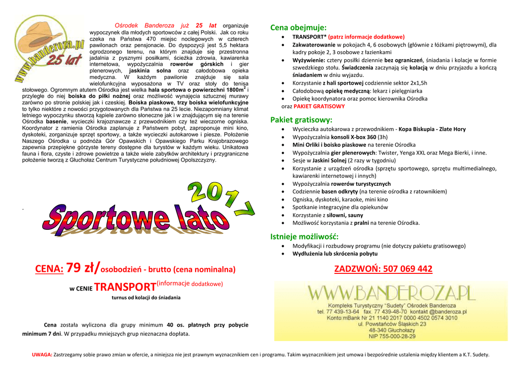 Ośrodek Banderoza już 25 lat organizuje wypoczynek dla młodych sportowców z całej Polski. Jak co roku czeka na Państwa 470 miejsc noclegowych w czterech pawilonach oraz pensjonacie. Do dyspozycji jest 5,5 hektara ogrodzonego terenu, na którym znajduje się przestronna jadalnia z pysznymi posiłkami, ścieżka zdrowia, kawiarenka internetowa, wypożyczalnia rowerów górskich i gier plenerowych, jaskinia solna oraz całodobowa opieka medyczna. W każdym pawilonie znajduje się sala wielofunkcyjna wyposażona w TV oraz stoły do tenisa 2 stołowego. Ogromnym atutem Ośrodka jest wielka hala sportowa o powierzchni 1800m i przyległe do niej boiska do piłki nożnej oraz możliwość wynajęcia sztucznej murawy zarówno po stronie polskiej jak i czeskiej. Boiska piaskowe, trzy boiska wielofunkcyjne to tylko niektóre z nowości przygotowanych dla Państwa na 25 lecie. Niezapomniany klimat letniego wypoczynku stworzą kąpiele zarówno słoneczne jak i w znajdującym się na terenie Ośrodka basenie, wycieczki krajoznawcze z przewodnikiem czy też wieczorne ogniska. Koordynator z ramienia Ośrodka zaplanuje z Państwem pobyt, zaproponuje mini kino, dyskoteki, zorganizuje sprzęt sportowy, a także wycieczki autokarowe i piesze. Położenie Naszego Ośrodka u podnóża Gór Opawskich i Opawskiego Parku Krajobrazowego zapewnia przepiękne górzyste tereny dostępne dla turystów w każdym wieku. Unikatowa fauna i flora, czyste i zdrowe powietrze a także wiele zabytków architektury i przygraniczne położenie tworzą z Głuchołaz Centrum Turystyczne południowej Opolszczyzny. Cena obejmuje: TRANSPORT* (patrz informacje dodatkowe) Zakwaterowanie w pokojach 4, 6 osobowych (głównie z łóżkami piętrowymi), dla kadry pokoje 2, 3 osobowe z łazienkami Wyżywienie: cztery posiłki dziennie bez ograniczeń, śniadania i kolacje w formie szwedzkiego stołu. Świadczenia zaczynają się kolacją w dniu przyjazdu a kończą śniadaniem w dniu wyjazdu. Korzystanie z hali sportowej codziennie sektor 2x1,5h Całodobową opiekę medyczną: lekarz i pielęgniarka Opiekę koordynatora oraz pomoc kierownika Ośrodka oraz PAKIET GRATISOWY Pakiet gratisowy: . Wycieczka autokarowa z przewodnikiem - Kopa Biskupia - Zlate Hory Wypożyczalnia konsoli X-box 360 (3h) Mini Orliki i boisko piaskowe na terenie Ośrodka Wypożyczalnia gier plenerowych: Twister, Yenga XXL oraz Mega Bierki, i inne. Sesje w Jaskini Solnej (2 razy w tygodniu) Korzystanie z urządzeń ośrodka (sprzętu sportowego, sprzętu multimedialnego, kawiarenki internetowej i innych) Wypożyczalnia rowerów turystycznych Codziennie basen odkryty (na terenie ośrodka z ratownikiem) Ogniska, dyskoteki, karaoke, mini kino Spotkanie integracyjne dla opiekunów Korzystanie z siłowni, sauny Możliwość korzystania z pralni na terenie Ośrodka. Istnieje możliwość: CENA: 79 zł/osobodzień - brutto (cena nominalna) w CENIE Modyfikacji i rozbudowy programu (nie dotyczy pakietu gratisowego) Wydłużenia lub skrócenia pobytu ZADZWOŃ: 507 069 442 TRANSPORT(informacje dodatkowe) turnus od kolacji do śniadania Cena została wyliczona dla grupy minimum 40 os. płatnych przy pobycie minimum 7 dni. W przypadku mniejszych grup nieznaczna dopłata. UWAGA: Zastrzegamy sobie prawo zmian w ofercie, a niniejsza nie jest prawnym wyznacznikiem cen i programu. Takim wyznacznikiem jest umowa i bezpośrednie ustalenia między klientem a K.T. Sudety. Dodatkowo możemy zorganizować: 1. Uwagi dotyczące TRANSPORTU autokarami Ośrodka. Transport w cenie obowiązuje dla grupy minimum 40 os. płatnych oddalonych od Ośrodka w promieniu 150 km. Dla grup z województw oddalonych od Ośrodka więcej niż 150 km możliwy odbiór z PKP w Gliwicach, Opolu i Wrocławiu. Transport może być łączony i jest odgórnie ustalany przez Ośrodek. Rezygnacja z naszego transportu nie wpływa na cenę (w zamian proponujemy dodatkową atrakcję dla uczestników). 2. Wszelkie dokumenty potrzebne do zgłoszenia wyjazdu odpowiednim jednostkom zamieszczone są na naszej stronie www.banderoza.pl w zakładce do pobrania. 3. Doba w naszym Ośrodku rozpoczyna się kolacją w dniu przyjazdu a kończy śniadaniem w dniu wyjazdu, chyba że w umowie są ustalenia indywidualne. 4. Przy wycieczkach do Czech każdy uczestnik musi posiadać dokument uprawniający do przekroczenia granicy (dowód osobisty, paszport). Legitymacja szkolna nie jest takim dokumentem. W razie zainteresowania ofertą prosimy o kontakt: Jacek Laskowski - właściciel Ośrodka tel. 507 069 442 Lub RECEPCJA tel. 77 439 13 64 oraz na [email protected] www.banderoza.pl Sektor hala sportowa – 150 zł/1,5h Animacja gier i zabaw – 70 zł/grupa Płukanie złota z Górskim Gawędziarzem – 60 zł/grupa Warsztaty na bębnach afrykańskich „DJEMBE” – 140 zł/grupa (max 20 os.) SEGWAY i SLALOM EXTREME – 16 zł/os. Mini Turniej Łuczniczy – 60 zł/grupa (max 25 os.) SLAKLINE – 70 zł/grupa (max 30 os.) KINBALL – 140 zł/grupa (max 25 os.) Basen kryty – 16 zł/os. Paintball – 35 zł/os. (100 kulek, mundur, marker) Wycieczki autokarowe: Nysa – z przewodnikiem – 15 zł/os. Nysa – Przejażdżka wesołą ciuchcią z przewodnikiem – 25 zł/os. Nysa – Rejs stateczkiem "Gracja" po jeziorze Nyskim – 25 zł/os. Jesenik – z przewodnikiem – 20 zł/os. Jeseník (Czechy) + Jaskinie na Pomezí – 25 zł/os. + bilety wstępu: 60 Kč/dzieci (9 zł), 110 Kč/dorośli (18 zł).* Zaginione miasto RESNAU – interaktywny park rozrywki – 200zł/grupa + bilety wstępu 20 zł/os. JURAPARK KRASIEJÓW – 60 zł/os. Park Linowy (Czechy lub Polska) – 35 zł/os. Stadnina koni – 25 zł/os. Wycieczki piesze: Pieszy rajd na Górę Chrobrego – 5 zł/os. Zwiedzanie Głuchołaz z przewodnikiem – 5 zł/os. Rajd nocny z pochodniami – 3 zł/os. Wodę butelkowaną – 1 zł/butelka Prowiant – 7 zł/os. *UWAGA!. Ceny atrakcji obowiązują przy minimum 40 osobach płacących, przy mniejszej liczbie uczestników nieznaczn