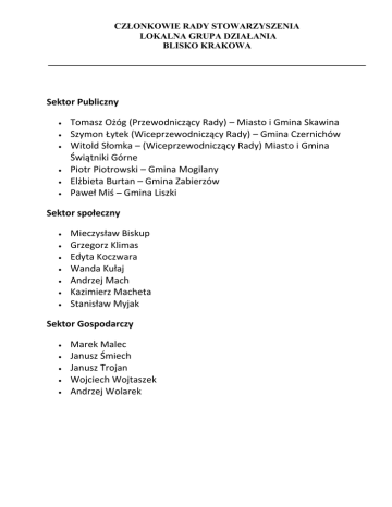 CZŁONKOWIE RADY STOWARZYSZENIA LOKALNA GRUPA DZIAŁANIA BLISKO KRAKOWA Sektor Publiczny Tomasz Ożóg (Przewodniczący Rady) – Miasto i Gmina Skawina Szymon Łytek (Wiceprzewodniczący Rady) – Gmina Czernichów Witold Słomka – (Wiceprzewodniczący Rady) Miasto i Gmina Świątniki Górne Piotr Piotrowski – Gmina Mogilany Elżbieta Burtan – Gmina Zabierzów Paweł Miś – Gmina Liszki Sektor społeczny Mieczysław Biskup Grzegorz Klimas Edyta Koczwara Wanda Kułaj Andrzej Mach Kazimierz Macheta Stanisław Myjak Sektor Gospodarczy Marek Malec Janusz Śmiech Janusz Trojan Wojciech Wojtaszek Andrzej Wolarek