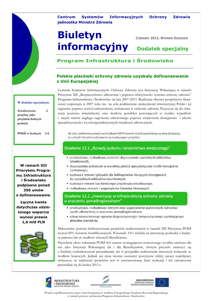 Centrum Systemów Informacyjnych jednostka Ministra Zdrowia Biuletyn informacyjny Ochrony Zdrowia CZERWIEC 2013, WYDANIE DZIESIĄTE Dodatek specjalny Program Infrastruktura i Środowisko Polskie placówki ochrony zdrowia uzyskały dofinansowanie z Unii Europejskiej W dodatku specjalnym: Zrealizowane projekty jako przykład dobrych praktyk 2 POIiŚ w liczbach 3-4 Centrum Systemów Informacyjnych Ochrony Zdrowia jest Instytucją Wdrażającą w ramach Priorytetu XII „Bezpieczeństwo zdrowotne i poprawa efektywności systemu ochrony zdrowia” Programu Infrastruktura i Środowisko na lata 2007-2013. Realizacja obecnej perspektywy finansowej rozpoczęta w 2007 roku ma na celu podniesienie atrakcyjności inwestycyjnej Polski i jej regionów poprzez rozwój infrastruktury technicznej w ochronie zdrowia. Przyczyni się do obniżenia poziomu śmiertelności oraz skutków powikłań powstających w wyniku wypadków i nnych stanów nagłego zagrożenia zdrowotnego poprzez zwiększenie dostępności i jakości specjalistycznych i wysokospecjalistycznych świadczeń zdrowotnych. W ramach XII Priorytetu Programu Infrastruktura i Środowisko podpisano ponad 350 umów o dofinansowanie. Łączna kwota dotychczas udzielonego wsparcia wynosi prawie 1,6 mld PLN Maksymalny poziom dofinansowania projektów realizowanych w ramach XII Priorytetu POIiŚ wynosi 85% kosztów kwalifikowanych. Pozostałe 15% wkładu na inwestycję pochodzi z budżetu państwa lub ze środków własnych Beneficjenta. Pięcioletni okres wdrażania POIiŚ był czasem wymagającym wzmożonego wysiłku zarówno dla nas jako Instytucji Wdrażającej jak i dla Beneficjentów, którym przyszło zmierzyć się z bardziej rozbudowanymi procedurami, niż w przypadku realizowania inwestycji wyłącznie ze środków krajowych. Jednak już teraz można zauważyć pozytywne efekty naszej współpracy zwłaszcza, że większość projektów jest w zaawansowanej fazie realizacji i ich zakończenie przewiduje się do końca 2013 r. Projekt współfinansowany przez Unię Europejską ze środków Europejskiego Funduszu Rozwoju Regionalnego w ramach pomocy technicznej Programu Infrastruktura i Środowisko. STR. 2 BIULETYN INFORMACYJNY Zrealizowane projekty jako przykład dobrych praktyk Budowa lądowiska dla helikopterów w Regionalnym Szpitalu Specjalistycznym w Grudziądzu. Poziom dofinansowania z Europejskiego Funduszu Rozwoju Regionalnego dla projektu wyniósł: 3 957 658,23 zł. Alokacja dla XII priorytetu Programu Infrastruktura i Środowisko wynosi ponad 395 mln euro. Rozbudowa, przebudowa i doposażenie NZOZ "Szpital w Puszczykowie im. prof. Stefana Tytusa Dąbrowskiego" Sp. z o.o. celem utworzenia SOR”. Poziom dofinansowania z Europejskiego Funduszu Rozwoju Regionalnego dla projektu wyniósł: 5 570 484,18 zł. Poprawa efektywności systemu ochrony zdrowia poprzez zakup Karetki typu "S" przez Szpital Powiatowy w Chełmży. Poziom dofinansowania z Europejskiego Funduszu Rozwoju Regionalnego dla projektu wyniósł: 356 013,49 zł. 2012, WYDANIE DZIESIĄTE, DODATEK SPECJALNY STR. 3 POIiŚ w liczbach Dzięki wsparciu finansowemu z Programu Infrastruktura i Środowisko zakupiono 322 nowoczesne ambulanse, trwa modernizacja i doposażenie 158 szpitali w kraju. Wsparcie unijne pozwoliło na podpisanie 36 umów o dofinansowanie projektów w zakresie remontu i budowy lądowisk dla helikopterów. Poza projektami konkursowymi nasi Beneficjenci realizują 30 projektów indywidualnych. Ogromne znaczenie ma projekt indywidualGdańsk ny realizowany przez Lotnicze Pogotowie Ratunkowe (LPR) polegający na budowie, remoncie oraz doposażeniu w nowoczesne Szczecin systemy 15 baz LPR (Mapa 1). Suwałki Wykonane prace zwiększą skuteczność Bydgoszcz funkcjonowania lotniczych służb ratownicBiałystok twa medycznego, skrócą czas dotarcia do zdarzenia oraz zwiększą zasięg oddziaływaPoznań Warszawa Zielona nia, przyczyniając się tym samym do Góra zmniejszenia liczby ofiar śmiertelnych. Łódź Obecne zakończono projekt budowy i remontu 6 baz. Lublin Wrocław Kielce Wartość dofinansowania projektu wynosi 58 mln PLN Gliwice Kraków Mapa 1. Lokalizacja baz Lotniczego Pogotowia Ratunkowego. Sanok STR. 4 BIULETYN INFORMACYJNY Centrum Systemów Informacyjnych Ochrony Zdrowia Adres: Centrum Systemów Informacyjnych Ochrony Zdrowia ul. Stanisława Dubois 5A 00-184 Warszawa tel. +48(22) 597-09-27 fax +48(22) 597-09-47 e-mail: [email protected] www.csioz.gov.pl Centrum działa na podstawie Zarządzenia Ministra Zdrowia z dnia 1 lipca 2010 r. w sprawie Centrum Systemów Informacyjnych Ochrony Zdrowia (Dz. Urz. Min. Zdrow. Nr 9, poz. 56). W 2012 roku na Dyrektora Centrum został powołany Pan Marcin Kędzierski. Przedmiotem działalności CSIOZ jest między innymi wypełnianie na rzecz ministra właściwego do spraw zdrowia zadań Instytucji Wdrażającej w ramach Priorytetu XII „Bezpieczeństwo zdrowotne i poprawa efektywności systemu ochrony zdrowia” Programu Operacyjnego Infrastruktura i Środowisko na lata 2007-2013. Realizacją zadań związanych z wdrażaniem XII Priorytetu Programu Infrastruktura i Środowisko zajmuje się Wydział Funduszy Europejskich. Kolejnym istotnym obszarem, który otrzymał finansowe wsparcie są Centra Urazowe. W ramach realizowanego projektu nastąpi rozbudowa, remont i wyposażenie 13 wielospecjalistycznych placówek (Mapa 2), które posiadają m.in. szpitalny oddział ratunkowy, oddział anestezjologii i intensywnej terapii, blok operacyjny oraz oddziały chirurgiczne i neurochirurgiczne, przystosowane doInfrastruktura leczenia urazów wielonarządowych. XII Priorytet Programu i Środowisko, Działanie 12.2 „Inwestycje w infrastrukturę ochrony zdrowia o znaczeniu ponadregionalnym” Centra zostaną wyposażone w nowoczesny sprzęt medyczny Projekty Indywidualne dzięki czemu zmniejszy się liczba powikłań u ofiar wypadków, a także obniży śmiertelność i przypadki kalectwa pourazowego. W ramach projektu powst