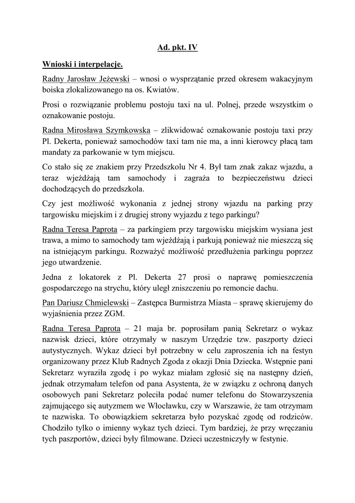 Ad. pkt. IV Wnioski i interpelacje. Radny Jarosław JeŜewski – wnosi o wysprzątanie przed okresem wakacyjnym boiska zlokalizowanego na os. Kwiatów. Prosi o rozwiązanie problemu postoju taxi na ul. Polnej, przede wszystkim o oznakowanie postoju. Radna Mirosława Szymkowska – zlikwidować oznakowanie postoju taxi przy Pl. Dekerta, poniewaŜ samochodów taxi tam nie ma, a inni kierowcy płacą tam mandaty za parkowanie w tym miejscu. Co stało się ze znakiem przy Przedszkolu Nr 4. Był tam znak zakaz wjazdu, a teraz wjeŜdŜają tam samochody i zagraŜa to bezpieczeństwu dzieci dochodzących do przedszkola. Czy jest moŜliwość wykonania z jednej strony wjazdu na parking przy targowisku miejskim i z drugiej strony wyjazdu z tego parkingu? Radna Teresa Paprota – za parkingiem przy targowisku miejskim wysiana jest trawa, a mimo to samochody tam wjeŜdŜają i parkują poniewaŜ nie mieszczą się na istniejącym parkingu. RozwaŜyć moŜliwość przedłuŜenia parkingu poprzez jego utwardzenie. Jedna z lokatorek z Pl. Dekerta 27 prosi o naprawę pomieszczenia gospodarczego na strychu, który uległ zniszczeniu po remoncie dachu. Pan Dariusz Chmielewski – Zastępca Burmistrza Miasta – sprawę skierujemy do wyjaśnienia przez ZGM. Radna Teresa Paprota – 21 maja br. poprosiłam panią Sekretarz o wykaz nazwisk dzieci, które otrzymały w naszym Urzędzie tzw. paszporty dzieci autystycznych. Wykaz dzieci był potrzebny w celu zaproszenia ich na festyn organizowany przez Klub Radnych Zgoda z okazji Dnia Dziecka. Wstępnie pani Sekretarz wyraziła zgodę i po wykaz miałam zgłosić się na następny dzień, jednak otrzymałam telefon od pana Asystenta, Ŝe w związku z ochroną danych osobowych pani Sekretarz poleciła podać numer telefonu do Stowarzyszenia zajmującego się autyzmem we Włocławku, czy w Warszawie, Ŝe tam otrzymam te nazwiska. To obowiązkiem sekretarza było pozyskać zgodę od rodziców. Chodziło tylko o imienny wykaz tych dzieci. Tym bardziej, Ŝe przy wręczaniu tych paszportów, dzieci były filmowane. Dzieci uczestniczyły w festynie. Od pewnego czasu zmieniła się współpraca pani Sekretarz z radnymi. Pani Burmistrz tak bardzo negowała uzasadnienie do uchwały w sprawie ustalenia wynagrodzenia pani Burmistrz, gdzie poruszono złą współpracę z radnymi, a czy to podejście pani Sekretarz nie jest dowodem tego, Ŝe ta współpraca nie jest najlepsza. Do decyzji Burmistrza naleŜy, czy wyciągnie z tego konsekwencje, czy nie. Osobiście, podejście pani Sekretarz oceniam bardzo negatywnie. Ponadto poinformowała mieszkańców o przeznaczeniu środków z diet Klubu Radnych Zgoda i radnego Grzegorza Koszczki do końca maja i tak pomoc otrzymali: - Uniwersytet Trzeciego Wieku, Stowarzyszenie „Nuta i Pióro”, Klub Seniora „Nawojka”, Lipnowski Związek Niewidomych, ufundowana została wycieczka dla uczennicy ze Szkoły Podstawowej Nr 3, dofinansowano memoriał W.Witeckiego, zorganizowany został festyn z okazji „Dnia Dziecka”, Stowarzyszenie „Nadzieja”. Pani Dorota Łańcucka – Burmistrz Miasta – zgodnie z ustawą o Ochronie danych osobowych, pani Sekretarz zachowała się tak, jak powinna. My pozyskaliśmy dane dzieci w określonym celu, poniewaŜ to Urząd wydawał paszporty. Dane te uzyskaliśmy z Towarzystwa Autyzmu w Toruniu, z którym współpracujemy. Udało się sporo fajnych rzeczy zrealizować. Z panią Prezes omawiane są kolejne plany, aby ułatwić tym rodzinom funkcjonowanie na terenie naszego miasta. Towarzystwo Autyzmu ma swoją stronę internetową i tam jest numer telefonu do pani Prezes i nic nie stoi na przeszkodzie, aby uzyskać takie dane. O dane zgłasza się organizator festynu. Pan Dariusz Galek – Radca Prawny – jeŜeli Urząd uzyskał nazwiska, to dostał te dane w jednym, konkretnym celu. Nie wierzy, aby nazwiska moŜna było udostępniać dalej. Ustawa o ochronie danych osobowych jest bardzo skomplikowana. Radna Maria Bautembach – pani Sekretarz potwierdziła, Ŝe da taką listę. Przy nadawaniu paszportów pominięto dwoje dzieci, a bardzo mi zaleŜało, Ŝeby dzieci dostały paszport i podałem te nazwiska. Pracownik Urzędu powinien znać przepisy i od razu mógł powiedzieć, Ŝe nie udostępni danych. Pani Alicja Letkiewicz-Sulińska – Sekretarz Miasta – jest to potwierdzenie tego, jak jestem prospołecznie nastawiona do tego, bo najpierw chciałam udostępnić te dane, a później przemyślałam to, Ŝe jest to ochrona danych osobowych, dlatego wskazałam, gdzie moŜna uzyskać te dane. Radna Teresa Paprota – czy pracownik urzędu współpracujący z radnym powinien odsyłać do kogoś innego? Czy nie powinien zadzwonić do kaŜdego z rodziców i zapytać o zgodę na podanie nazwiska? Radny Piotr Rogeński – rzeka na terenie miasta jest bardzo zanieczyszczona poniewaŜ wiele szamb jest podłączonych do rzeki. NaleŜałoby zlokalizować dzikie podłączenia i zmusić właścicieli do podłączenia do kanalizacji miejskiej. Radna Maria Bautembach – prosi o przedstawienie sprawy naboru do szkół gimnazjalnych. Pani Barbara Drzewicka – Inspektor UM – nabór do Gimnazjum Publicznego jest na 4 klasy, jest jednak nadzieja na 5 klas. Klasa mundurowa ma nabór na 26 uczniów. Nie ma natomiast chętnych na klasę wychowania fizycznego. Być moŜe powstanie jeszcze klasa integracyjna, ale jest to w trakcie załatwiania. Pomimo upływu terminu, podania są jeszcze składane i ta sytuacja moŜe ulec zmianie. Planowane są klasy 26-27 osobowe. Odchodzi 5 klas, natomiast w organizacji planowane są 4 klasy. Radny Zbigniew Golubiński – podziękował za ul. Cichą oraz łącznika Krótka – Wyszyńskiego. Prosi o dokończenie budowy chodnika i wjazdu, który nie został wykonany z uwagi na brak środków finansowych. Chce się równieŜ upewnić, czy będą zamontowane lampy na ul. Kusocińskiego. Radny Grzegorz Koszczka – podziękował za oznakowanie osiedla J.P.II, połączenie ulicy Boc