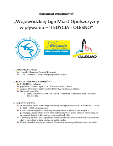 Komunikat Organizacyjny „Wojewódzkiej Ligii Miast Opolszczyzny w pływaniu – II EDYCJA - OLESNO” 1. ORGANIZATORZY: Opolski Okręgowy Związek Pływacki UKS „Gwiazda” Olesno sekcja pływania Dwójka 2. TERMIN I MIEJSCE ZAWODÓW: 21.02.2015r. (sobota) pływalnia “Oleska Laguna”, ul. Wachowska 10a, Olesno długość pływalni 25 metrów, ilość torów 6, pomiar czasu ręczny. Naczelnik zawodów: o Jerzy Jeziorowski: 605 316 101 lub Katarzyna Adamczyk-Buła – kontakt: 696 415 286 3. UCZESTNICTWO: W zawodach prawo startu mają zawodnicy szkół podstawowych, w wieku 10 – 12 lat, tj. 2005 – 2003 rok urodzenia. Prawo startu mają tylko zawodnicy zarejestrowani w klubach sportowych i posiadający licencje PZP oraz ważne badania lekarskie (kartę zdrowia sportowca), za co odpowiedzialni są kierownicy poszczególnych ekip. Zawodnicy 10-letni muszą posiadać oświadczenie rodziców o zdrowiu i zezwolenie na start w zawodach (z datą, osobno na każdą rundę). Każdy zawodnik ma prawo startu w 2 konkurencjach indywidualnych oraz sztafecie. 4. ZASADY FINANSOWANIA: koszty organizacyjne zawodów pokrywa organizator; koszty uczestnictwa ponoszą Kluby; opłata startowa wynosi 20 zł. od każdego zawodnika. 5. ZGŁOSZENIA DO ZAWODÓW: Zgłoszenia do zawodów prosimy przesłać w nieprzekraczalnym terminie do dnia 16.02.2015r. na adres: [email protected] tylko w formie elektronicznej w pliku.lxf. Potwierdzenie przyjęcia zgłoszenia zostanie przesłane pocztą zwrotną w ciągu 24 godzin. W przypadku jego braku należy skontaktować się telefonicznie pod podany niżej numer telefonu. Kontakt: +48 792 821 903 – p. Witold Koszil. 6. PROGRAM ZAWODÓW I BLOK 21.02.2015r rozgrzewka: godz. 9.00 zawody: godz. 10.00 konkurencje dziewcząt i chłopców rocznik 2005-2003 Kon. Dziewczęta Kon. Chłopcy 1. 50m styl motylkowy 2. 50m styl motylkowy 3. 100m styl dowolny 4. 100m styl dowolny 5. Sztafeta 8 x 50m styl grzbietowy mix 7. NAGRODY: Dyplomy za trzy pierwsze miejsca w poszczególnych konkurencjach oraz rocznikach. 9. SPRAWY RÓŻNE: Za posiadanie ważnych badań lekarskich i kart zgłoszeniowych do PZP odpowiedzialność ponoszą kierownicy ekip. Również za ubezpieczenie zawodników biorących udział w zawodach odpowiadają kierownicy ekip. Odprawa techniczna odbędzie się dnia 21.02.2015r. (sobota ) o godz. 9.30 w biurze zawodów (na terenie basenu). 10. POSTANOWIENIA KOŃCOWE: Zawody będą przeprowadzone wg przepisów FINA. W sprawach nieobjętych regulaminem decyduje Sędzia Główny i Naczelnik Zawodów. SERDECZNIE ZAPRASZAMY