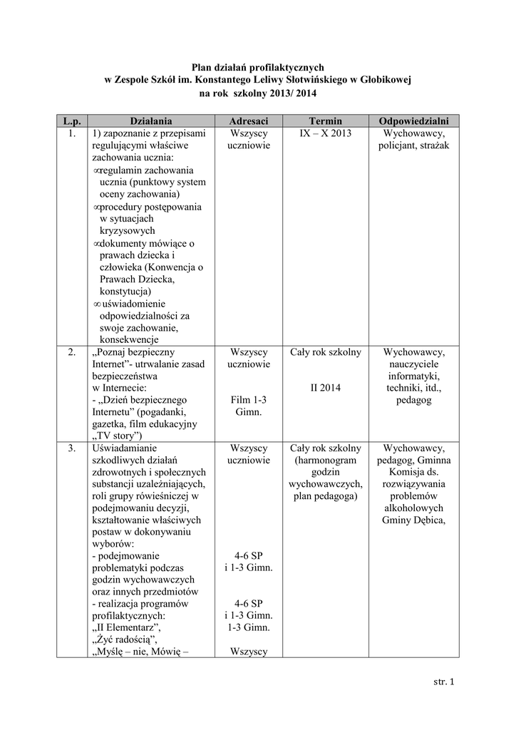 Plan działań profilaktycznych w Zespole Szkół im. Konstantego Leliwy Słotwińskiego w Głobikowej na rok szkolny 2013/ 2014 L.p. 1. 2. 3. Działania 1) zapoznanie z przepisami regulującymi właściwe zachowania ucznia: • regulamin zachowania ucznia (punktowy system oceny zachowania) • procedury postępowania w sytuacjach kryzysowych • dokumenty mówiące o prawach dziecka i człowieka (Konwencja o Prawach Dziecka, konstytucja) • uświadomienie odpowiedzialności za swoje zachowanie, konsekwencje „Poznaj bezpieczny Internet”- utrwalanie zasad bezpieczeństwa w Internecie: - „Dzień bezpiecznego Internetu” (pogadanki, gazetka, film edukacyjny „TV story”) Uświadamianie szkodliwych działań zdrowotnych i społecznych substancji uzależniających, roli grupy rówieśniczej w podejmowaniu decyzji, kształtowanie właściwych postaw w dokonywaniu wyborów: - podejmowanie problematyki podczas godzin wychowawczych oraz innych przedmiotów - realizacja programów profilaktycznych: „II Elementarz”, „Żyć radością”, „Myślę – nie, Mówię – Adresaci Wszyscy uczniowie Termin IX – X 2013 Odpowiedzialni Wychowawcy, policjant, strażak Wszyscy uczniowie Cały rok szkolny Wychowawcy, nauczyciele informatyki, techniki, itd., pedagog II 2014 Film 1-3 Gimn. Wszyscy uczniowie Cały rok szkolny (harmonogram godzin wychowawczych, plan pedagoga) Wychowawcy, pedagog, Gminna Komisja ds. rozwiązywania problemów alkoholowych Gminy Dębica, 4-6 SP i 1-3 Gimn. 4-6 SP i 1-3 Gimn. 1-3 Gimn. Wszyscy str. 1 4. 5. 6. nie”, „Dziękuję – nie”, „Zanim spróbujesz” - udział w konkursach „Zachowaj trzeźwy umysł”, „Wybieram trzeźwość” - udział w spektaklach profilaktycznych - wykorzystanie filmów edukacyjnych: „Obietnica”, „Życie pod murem”, „Żyję bez ryzyka AIDS” Jesteśmy Szkołą bez przemocy - profilaktyka zachowań nieakceptowanych społecznie (zachowania agresywne, przemoc, subkultury, wandalizm): - prelekcja policjanta „Przestępczość nieletnich i jej prawne konsekwencje” - spektakl profilaktyczny – Teatr profilaktyczny Kurtyna - realizacja programów profilaktycznych: „Spójrz inaczej”, „Saper”, „Program profilaktyczno – terapeutyczny dla dzieci z zespołem nadpobudliwości psychoruchowej” - film edukacyjny „Oni”, „W sidłach” Propagowanie aktywnych form spędzania czasu wolnego, jako alternatywy wyboru zachowań nieakceptowanych społecznie: - zajęcia pozalekcyjne - wycieczki, wyjazdy - udział w konkursach, zawodach - oferta zajęć podczas ferii i wakacji Wyrównywanie szans społecznych poprzez - analizę sytuacji materialnej i społecznej uczniowie 1-3 Gimn. 1-6 SP i 1-3 Gimn. Cały rok szkolny IX – X 2013 6 SP i 1-3 Gimn. Wszyscy uczniowie Po uzgodnieniu z Gminną Komisją Wg planu pracy pedagoga oraz zastepstw 4-6 SP i 1-3 Gimn. Kl.0 i 1-3 SP Wszyscy uczniowie wychowawcy, nauczyciele przedmiotowi, pedagog, studenci wolontariusze Cały rok szkolny II i VI 2014 Uczniowie kwalifikujący się do pomocy Na bieżąco, cały rok szkolny Wychowawcy, pedagog, pracownicy instytucji str. 2 7. 8. rodzin uczniów - organizowanie bezpłatnego żywienia, stypendiów, wyprawek szkolnych - korzystanie z programów rządowych oferujących pomoc - zgłaszanie niepokojących sygnałów do właściwych instytucji (sąd rodzinny, policja, procedura Niebieskich Kart) Wyrównywanie szans edukacyjnych uczniów poprzez organizację pomocy psychologiczno – pedagogicznej: - zajęcia wyrównawcze, wspomagające - rozwijające zdolności Współpraca z instytucjami wspomagającymi działania profilaktyczne • GOPS w Dębicy, Ropczycach, Brzostku, Pilźnie • PCPR w Dębicy • Komenda Powiatowa Policji w Dębicy • Ośrodek Zdrowia w Gumniskach • Gminna Komisja ds. profilaktyki i rozwiązywania problemów alkoholowych Gminy Dębica • Wolontariat Studencki • Urząd Gminy Dębicy • Poradnia Psychologiczno – Pedagogiczna w Dębicy • Sanepid Dębica wspomagających szkołę Wszyscy uczniowie wymagający indywidualne go wsparcia Według założeń zawartych Planach Działań Wspierających Wszyscy nauczyciele i specjaliści pracujący z uczniami Wszyscy uczniowie wymagający wsparcia lub pomocy Cały rok, na bieżąco Wychowawcy, pedagog, pracownicy instytucji str. 3
