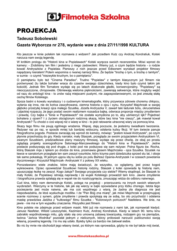 PROJEKCJA Tadeusz Sobolewski Gazeta Wyborcza nr 278, wydanie waw z dnia 27/11/1998 KULTURA Kto jeszcze w kinie polskim tak rozmawia z widzem? Jak przedtem Kutz czy Andrzej Kondratiuk, Kolski narzuca nam swoj legend. W krótkim prologu do "Historii kina w Popielawach" Kolski wyrcza swoich recenzentów. Mówi wprost do kamery: - Zrobilimy ten film i jestemy z niego zadowoleni. Wiemy ju, o czym bdzie historia - o rodzie kowali Andryszków z Popielaw. Pierwszy z nich jeszcze przed Edisonem wynalaz projektor filmowy napdzany kieratem! Potem wspomina o rwanej narracji filmu. e bdzie "troch o tym, a troch o tamtym", w sumie - o czym "niezwykle kruchym, bo o pamitaniu". O pamitaniu byo te "Cinema Paradiso". Trudno "Popielaw" z tamtym klasycznym ju filmem nie porównywa (tu take bohater wraca do czasów swojego dziecistwa, kiedy kino byo czym takim jak koció). Jednak film Tornatore wydaje si po latach doskonale gadki, konwencjonalny. "Popielawy" s nieoczyszczone, chropowate. Olniewaj wieloma piknociami, zawieraj sekwencje, które mogyby wej od razu do antologii kina - to znów ra miejscami pustymi, nie zagospodarowanymi, co jest zreszt sta cech filmów Kolskiego. Spoza bani o kowalu wynalazcy i o cudownym kinematografie, który przywraca zdrowie choremu chopcu, wyania si inna, nie do koca zaszyfrowana, ciemna historia o ojcu i synu. Krzysztof Majchrzak w swojej gboko przeytej kreacji ojca maego Szustka, Józefa Andryszka V, zawar taki adunek bólu, okruciestwa i pijackiej rozpaczy, e jego posta swoim realizmem rozsadza bajk, odwraca proporcje midzy zmyleniem i prawd. Czy bajka o "kinie w Popielawach" nie zostaa wymylona po to, aby umierzy lk? Pojedna bohatera z ojcem? I z yciem obcionym rodzinn skaz, które bez kina "nie cieszy", jak mawia kowal Andryszek? Tu chodzi o co wicej ni o wiar w kino - to jest ratowanie utraconej wiary za pomoc kina. Skazy tego filmu nie psuj ogólnego wraenia. Wicej, daj poczucie, e jestemy wiadkami tworzenia. Reyser raz po raz, w sposób mniej lub bardziej widoczny, odsania kulisy fikcji. W tym wiecie panuje fotograficzna pogoda. Postacie zwracaj si wprost do kamery, mówic: "jestem kowal Andryszek", po czym pynnie przechodz do gry. Kiedy narrator, may Staszek, przeglda ze swoim przyjacielem Andryszkiem VI, zwanym Szustkiem, pradziadkowe plany maszyny filmowej, wydaje si przez chwil, e obaj po prostu ogldaj projekty scenograficzne Saloniego-Marczewskiego do "Historii kina w Popielawach". Jedne postacie podszywaj si pod drugie, z kolei pod nie podszywa si sam reyser. Polna figura w. Rocha, któr Staszek mija z lkiem po drodze do kina, przemawia gosem Majchrzaka - ojca Szustka. Szustek na awce w sanatorium przeglda ten sam zeszyt rysunków, który trzyma pani dziedziczka sprzed stu lat, i oboje tak samo pokasuj. W jednym ujciu id ku sobie po polu Bartosz Opania-Andryszek I w czasach powstania styczniowego i Krzysztof Majchrzak- Andryszek V z poowy XX wieku. Porozstawiano wiele znaków, które maj wiadczy, e wszystko, co ogldamy, jest przez kogo wykreowane. Ojciec opowiedzia Szustkowi histori rodziny, Staszek z kolei opowiada t histori nam, upuszczajc ezk na zeszyt. Kogo auje? Swojego przyjaciela czy siebie? Wiemy skdind, e Staszek to may Kolski, e Popielawy istniej naprawd i e wujek Kolskiego prowadzi tam kino. Jawne zmylenie i biograficzna prawda splataj si w wze nie do rozstrzygnicia, zmuszajc widza do odbioru naiwnego. Cud kina, który nam demonstruje Kolski, polega na projekcji - przerzucaniu na innych swoich wasnych wyobrae. Wierzymy w te historie, tak jak si wierzy w bajki opowiadane przy óku chorego. Istota tego pocieszenia jest moe naiwna, ale ma co wspólnego z wiar, e adna za diagnoza nie jest niepodwaalna, e kto wysuchuje modlitw. I e "Pan Bóg zna miar", jak mówi Majchrzak w przejmujcej scenie rozmowy z synem, gdzie zmylenie i prawda spotykaj si ze sob, bo oto przychodzi i odsania mask prawdziwa Jadka z "kultowego" filmu Szustka - "Kolorowych poczoch" Nasfetera. We nie, na jawie - nie ma w tym wypadku znaczenia. Wszystko jest filmem. Kino polskie nie zdejmuje przed widzem maski. Nikt ju nie rozmawia z nami tak, jak rozmawiali kiedy: Janusz Nasfeter, Witold Leszczyski, Kazimierz Kutz, Andrzej Kondratiuk. Kiedy w latach 90. temu kinu zabrako wspólnotowego mitu, gdy stao si ono umown zabaw towarzysk, rodzajem gry na pienidze, twórca "Jacia Wodnika" pozosta jednym z nielicznych, którzy próbowali narzuci publicznoci swoj wasn, prywatn legend. I to mu si udao. Byleby tylko za bardzo nie aowa siebie. Bo nic by mnie nie obchodzi jego wasny wiat, po którym nas oprowadza, gdyby to nie by take mój wiat, www.filmotekaszkolna.pl którego nie chc zapomnie . Cho nie mieszkaem na wsi, nie miaem ojca montaysty ani wujka kinooperatora, rozpoznaj ten wiat natychmiast, jak stary grzech, kiedy na ekranie rozlegaj si fanfary Polskiej Kroniki Filmowej. www.filmotekaszkolna.pl