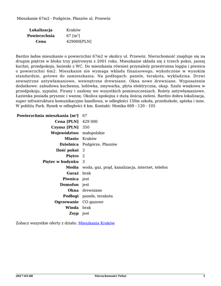 Mieszkanie 67m2 - Podgórze, Płaszów ul. Przewóz Lokalizacja Kraków Powierzchnia 67 [m2] Cena 429000[PLN] Bardzo ładne mieszkanie o powierzchni 67m2 w okolicy ul. Przewóz. Nieruchomość znajduje się na drugim piętrze w bloku trzy piętrowym z 2001 roku. Mieszkanie składa się z trzech pokoi, jasnej kuchni, przedpokoju, łazienki z WC. Do mieszkania również przynależy przestronna loggia i piwnica o powierzchni 6m2. Mieszkanie nie wymaga wkładu finansowego, wykończone w wysokim standardzie, gotowe do zamieszkania. Na podłogach: panele, terakota, wykładzina. Drzwi zewnętrzne antywłamaniowe, wewnętrzne drewniane. Okna nowe drewniane. Wyposażenie dodatkowe: zabudowa kuchenna, lodówka, zmywarka, płyta elektryczna, okap. Szafa wnękowa w przedpokoju, sypialni. Firany i zasłony we wszystkich pomieszczeniach. Rolety antywłamaniowe. Łazienka posiada prysznic i wannę. Okolica spokojna z dużą ilością zieleni. Bardzo dobra lokalizacja, super infrastruktura komunikacyjno handlowa, w odległości 150m szkoła, przedszkole, apteka i inne. W pobliżu Park. Rynek w odległości 4 km. Kontakt: Monika 669 - 120 - 105 Powierzchnia mieszkania [m2] 67 Cena [PLN] 429 000 Czynsz [PLN] 350 Województwo małopolskie Miasto Kraków Dzielnica Podgórze, Płaszów Ilość pokoi 3 Piętro 2 Pięter w budynku 3 Media woda, gaz, prąd, kanalizacja, internet, telefon Garaż brak Piwnica jest Domofon jest Okna drewniane Podłogi panele, terakota Ogrzewanie CO gazowe Winda brak Zsyp jest Zobacz wszystkie oferty z działu: Mieszkania Kraków 2017-03-08 Nieruchomości Feluś 1