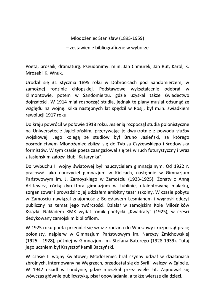 Młodożeniec Stanisław (1895-1959) – zestawienie bibliograficzne w wyborze Poeta, prozaik, dramaturg. Pseudonimy: m.in. Jan Chmurek, Jan Rut, Karol, K. Mrozek i K. Wnuk. Urodził się 31 stycznia 1895 roku w Dobrocicach pod Sandomierzem, w zamożnej rodzinie chłopskiej. Podstawowe wykształcenie odebrał w Klimontowie, potem w Sandomierzu, gdzie uzyskał także świadectwo dojrzałości. W 1914 miał rozpocząć studia, jednak te plany musiał odsunąć ze względu na wojnę. Kilka następnych lat spędził w Rosji, był m.in. świadkiem rewolucji 1917 roku. Do kraju powrócił w połowie 1918 roku. Jesienią rozpoczął studia polonistyczne na Uniwersytecie Jagiellońskim, przerywając je dwukrotnie z powodu służby wojskowej. Jego kolegą ze studiów był Bruno Jasieński, za którego pośrednictwem Młodożeniec zbliżył się do Tytusa Czyżewskiego i środowiska formistów. W tym czasie poeta zaangażował się też w ruch futurystyczny i wraz z Jasieńskim założył klub "Katarynka". Do wybuchu II wojny światowej był nauczycielem gimnazjalnym. Od 1922 r. pracował jako nauczyciel gimnazjum w Kielcach, następnie w Gimnazjum Państwowym im. J. Zamoyskiego w Zamościu (1923-1925). Żonaty z Anną Arlitewicz, córką dyrektora gimnazjum w Lublinie, utalentowaną malarką, zorganizował i prowadził z jej udziałem ambitny teatr szkolny. W czasie pobytu w Zamościu nawiązał znajomość z Bolesławem Leśmianem i wygłosił odczyt publiczny na temat jego twórczości. Działał w zamojskim Kole Miłośników Książki. Nakładem KMK wydał tomik poetycki „Kwadraty” (1925), w części dedykowany zamojskim bibliofilom. W 1925 roku poeta przeniósł się wraz z rodziną do Warszawy i rozpoczął pracę polonisty, najpierw w Gimnazjum Państwowym im. Narcyzy Żmichowskiej (1925 - 1928), później w Gimnazjum im. Stefana Batorego (1928-1939). Tutaj jego uczniem był Krzysztof Kamil Baczyński. W czasie II wojny światowej Młodożeniec brał czynny udział w działaniach zbrojnych. Internowany na Węgrzech, przedostał się do Syrii i walczył w Egipcie. W 1942 osiadł w Londynie, gdzie mieszkał przez wiele lat. Zajmował się wówczas głównie publicystyką, pisał opowiadania, a także wiersze dla dzieci. Do kraju wrócił w 1957 roku, na dwa lata przed śmiercią. Zmarł 21 stycznia 1959 w Warszawie. Twórczość (wybór) 1. Chłopska pieśń [w.] / Stanisław Młodożeniec // Dziennik Ludowy. – 1960, nr 17, s. 5 2. Czekała ziemia…, Dziecko [w.] / Stanisław Młodożeniec // Świetlica. – 1945, nr 5, s. 4-5 3. Dzwony i kwiaty ; Sandomierz ; Warwick [w.] / Stanisław Młodożeniec // Życie. – 1954, nr 51-52, s. 7 4. Futuro-gamy i futuro-pejzaże / Stanisław Młodożeniec. – Warszawa : "Wąkopy", 1934 5. Grunwald / Stanisław Młodożeniec. – Olsztyn : "Pojezierze", 1976 6. Grunwald : słuchowisko w 8 epizodach / Stanisław Młodożeniec. – Londyn : Stronnictwo Ludowe, 1943 7. Heród : ucieszna tragedia w 3 aktach z interludiami. Prapremiera. Warszawa: Teatr Comedia 1934 // Naprzód. – 1934, nr 323 Toż: Robotnik. – 1934, nr 457 ; Wici. – 1934, nr 48-51 ; 1935, nr 1 8. Humor Sienkiewicza / Stanisław Młodożeniec // Ziemia Zamojska. – 1924, nr 30-31, s. 5-9 9. Hymn wiciowy [w.] / Stanisław Młodożeniec // Chłopski Sztandar. – 1945, nr 10, s. 1 10. Julisine kochanie / Stanisław Młodożeniec // Zielony Sztandar. – 1959, nr 40-41, s. 44 11. Kolęda [w.] / Stanisław Młodożeniec // Jutro Polski. – 1951, nr 19, s. 1 Toż.: Gazeta Niedzielna. – 1993, nr 1, s. 10 12. Koniec cywilizacji papieru : wybór publicystyki z lat 1933-1939 / Stanisław Młodożeniec ; zebr., wstępem i przypisami opatrzył Arkadiusz Michał Stasiak. – Sandomierz : Towarzystwo im. Stanisława Młodożeńca w Dobrocicach, 2008 13. Kreski i futureski / Stanisław Młodożeniec. – Klub Futurystów "Katarynka", 1921 14. Kwadraty / Stanisław Młodożeniec. – Zamość : nakł. Zamojskiego Koła Miłośników Książki, 1925 Rec.: Broniewski Władysław. Poezje Młodożeńca // Wiadomości Literackie. – 1926, nr 4, s. 5 ; P.S. Pokłosie // Silva Rerum. – 1925, s. 17-18 15. Kwadraty / Stanisław Młodożeniec. – Kraków : Przedsiębiorstwo Poligraficzne DEKA, 2009 16. Lajkonik w piramidach [fragm. prozy] / Stanisław Młodożeniec // Sycyna. – 1995, nr 4, s. 4 17. Lato [w.] / Stanisław Młodożeniec // Ikar. – 1995, nr 7/8, s. 50 Toż.: Akapit. – 2000, nr 2, s. 33 18. List Stanisława Młodożeńca do Ludowców // Jutro Polski. – 1955, nr 14-15, s. 9 [streszcz. listu otwartego druk. w Słowie Ludowym 1955, nr 2 w Nowym Jorku] 19. Łąka / Stanisław Młodożeniec // Ziemia Kielecka. – 1957, nr 6, s. 9 20. Marja : powieść ukraińska. Cz. 1, Tekst. Cz. 2, Objaśnienia i przypisy / Antoni Malczewski ; oprac. Stanisław Młodożeniec. – Warszawa : "Bibljoteka Polska", [1928] 21. Na Budzeniu : powieść / Stanisław Młodożeniec // Wici. – 1936, nr 13-30, 39-44, 46-51/52 ; 1937, nr 1-8, 10-13, 44-49, ; 1938, nr 4-9 22. Na rocznicę czynu chłopskiego / Stanisław Młodożeniec // Jutro Polski. – 1960, nr 14, s. 2 23. Na Placu Trafalgar / Stanisław Młodożeniec // Kamena. – 1957, nr 8, s. 3 24. Na przedwiośniu [w.] / Stanisław Młodożeniec // Jutro Polski. – 1950, nr 7, s. 3 25. Na Święto Ludowe [w.] / Stanisław Młodożeniec // Jutro Polski. – 1950, nr 10, s. 3 26. Na Wielkanoc [w.] / Stanisław Młodożeniec // Jutro Polski. – 1954, nr 7, s. 1 27. Na Zielone Święta [w.] / Stanisław Młodożeniec // Chłopi i Państwo. – 1947, nr 13, s. 1 Toż: Chłopski Sztandar. – 1947, nr 21, s. 1 ; Piast. – 1947, nr 18, s. 6 28. Niedziela / Stanisław Młodożeniec. – Warszawa : "Europa", 1930 29. O nowy ład : (w poszukiwaniu chłopskiego programu) / Stanisław Młodożeniec // Młoda Myśl Ludowa. – 1935, nr 4/5 ; odb. Warszawa : "Młoda Myśl Ludowa", 1935 30. O wsi [w.] / Stanisław Młodożeniec // Nowa Wieś. – 1989, nr 6, 