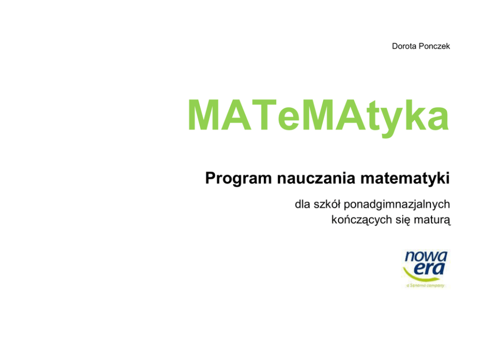 Dorota Ponczek MATeMAtyka Program nauczania matematyki dla szkół ponadgimnazjalnych kończących się maturą MATeMAtyka. Program nauczania Spis treści Podstawa programowa nauczania matematyki na III i IV etapie edukacyjnym 3 Wstęp do programu nauczania 14 Obudowa dydaktyczna programu 16 Ogólne cele kształcenia 17 Cele wychowawcze 18 Procedury osiągania celów 19 Podział treści nauczania i wymagania szczegółowe w poszczególnych klasach 20 Osiągnięcia konieczne absolwenta szkoły ponadgimnazjalnej 43 Ramowy rozkład materiału 45 Propozycja szczegółowego rozkładu materiału 47 2 MATeMAtyka. Program nauczania Podstawa programowa nauczania matematyki na III i IV etapie edukacyjnym Część wstępna podstawy programowej dla gimnazjum i liceum Po ukończeniu szkoły podstawowej uczeń kontynuuje kształcenie ogólne na III i IV etapie edukacyjnym. III etap edukacyjny realizowany jest w gimnazjum, zaś IV etap edukacyjny realizowany jest w szkole ponadgimnazjalnej. Kształcenie ogólne na III i IV etapie edukacyjnym, choć realizowane w dwóch różnych szkołach, tworzy programowo spójną całość i stanowi fundament wykształcenia, umożliwiający zdobycie zróżnicowanych kwalifikacji zawodowych, a następnie ich późniejsze doskonalenie lub modyfikowanie, otwierając proces kształcenia się przez całe życie. Celem kształcenia ogólnego na III i IV etapie edukacyjnym jest: 1) przyswojenie przez uczniów określonego zasobu wiadomości na temat faktów, zasad, teorii i praktyk; 2) zdobycie przez uczniów umiejętności wykorzystania posiadanych wiadomości podczas wykonywania zadań i rozwiązywania problemów; 3) kształtowanie u uczniów postaw warunkujących sprawne i odpowiedzialne funkcjonowanie we współczesnym świecie. Do najważniejszych umiejętności zdobywanych przez ucznia w trakcie kształcenia ogólnego na III i IV etapie edukacyjnym należą: 1) czytanie – umiejętność rozumienia, wykorzystywania i refleksyjnego przetwarzania tekstów, w tym tekstów kultury, prowadząca do osiągnięcia własnych celów, rozwoju osobowego oraz aktywnego uczestnictwa w życiu społeczeństwa; 2) myślenie matematyczne – umiejętność wykorzystania narzędzi matematyki w życiu codziennym oraz formułowania sądów opartych na rozumowaniu matematycznym; 3) myślenie naukowe – umiejętność wykorzystania wiedzy o charakterze naukowym do identyfikowania i rozwiązywania problemów, a także formułowania wniosków opartych na obserwacjach empirycznych dotyczących przyrody i społeczeństwa; 4) umiejętność komunikowania się w języku ojczystym i w językach obcych, zarówno w mowie, jak i w piśmie; 5) umiejętność sprawnego posługiwania się nowoczesnymi technologiami informacyjno-komunikacyjnymi; 6) umiejętność wyszukiwania, selekcjonowania i krytycznej analizy informacji; 7) umiejętność rozpoznawania własnych potrzeb edukacyjnych oraz uczenia się; 8) umiejętność pracy zespołowej. 3 MATeMAtyka. Program nauczania Jednym z najważniejszych zadań szkoły na III i IV etapie edukacyjnym jest kontynuowanie kształcenia umiejętności posługiwania się językiem polskim, w tym dbałości o wzbogacanie zasobu słownictwa uczniów. Wypełnianie tego zadania należy do obowiązków każdego nauczyciela. Ważnym zadaniem szkoły na III i IV etapie edukacyjnym jest przygotowanie uczniów do życia w społeczeństwie informacyjnym. Nauczyciele powinni stwarzać uczniom warunki do nabywania umiejętności wyszukiwania, porządkowania i wykorzystywania informacji z różnych źródeł, z zastosowaniem technologii informacyjno-komunikacyjnych, na zajęciach z różnych przedmiotów. Realizację powyższych celów powinna wspomagać dobrze wyposażona biblioteka szkolna, dysponująca aktualnymi zbiorami, zarówno w postaci księgozbioru, jak i w postaci zasobów multimedialnych. Nauczyciele wszystkich przedmiotów powinni odwoływać się do zasobów biblioteki szkolnej i współpracować z nauczycielami bibliotekarzami w celu wszechstronnego przygotowania uczniów do samokształcenia i świadomego wyszukiwania, selekcjonowania i wykorzystywania informacji. Ponieważ środki społecznego przekazu odgrywają coraz większą rolę, zarówno w życiu społecznym, jak i indywidualnym, każdy nauczyciel powinien poświęcić dużo uwagi edukacji medialnej, czyli wychowaniu uczniów do właściwego odbioru i wykorzystania mediów. Szkoła powinna też poświęcić dużo uwagi efektywności kształcenia w zakresie nauk przyrodniczych i ścisłych – zgodnie z priorytetami Strategii Lizbońskiej. Kształcenie w tym zakresie jest kluczowe dla rozwoju cywilizacyjnego Polski oraz Europy. Ważnym zadaniem szkoły na III i IV etapie edukacyjnym jest także edukacja zdrowotna, której celem jest rozwijanie u uczniów postawy dbałości o zdrowie własne i innych ludzi oraz umiejętności tworzenia środowiska sprzyjającego zdrowiu. W procesie kształcenia ogólnego szkoła na III i IV etapie edukacyjnym kształtuje u uczniów postawy sprzyjające ich dalsze mu rozwojowi indywidualnemu i społecznemu, takie jak: uczciwość, wiarygodność, odpowiedzialność, wytrwałość, poczucie własnej wartości, szacunek dla innych ludzi, ciekawość poznawcza, kreatywność, przedsiębiorczość, kultura osobista, gotowość do uczestnictwa w kulturze, podejmowania inicjatyw oraz do pracy zespołowej. W rozwoju społecznym bardzo ważne jest kształtowanie postawy obywatelskiej, postawy poszanowania tradycji i kultury własnego narodu, a także postawy poszanowania dla innych kultur i tradycji. Szkoła podejmuje odpowiednie kroki w celu zapobiegania wszelkiej dyskryminacji. 4 MATeMAtyka. Program nauczania Wiadomości i umiejętności, które uczeń zdobywa na III i IV etapie edukacyjnym opisane są, zgodnie z ideą europejskich ram kwalifikacji, w języku efektów kształcenia. Cele kształcenia sformułowane są w języku wymagań ogólnych, a treści nauczania oraz oczekiwa