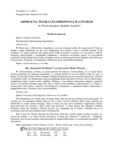 Czwartek, 21.11.2013 Przygotowanie: Bractwo św. Zofii ADORACJA: WIARA CELEBROWANA W LITURGII 14. Przed obrzędem „Redditio Symboli” WPROWADZENIE Śpiew: Upadnij na kolana. Wystawienie Najświętszego Sakramentu. Chwila ciszy. P: Panie nasz i Zbawicielu. Zostaliśmy wezwani słowami pieśni, aby upaść przed Tobą na kolana. Często spełniamy ten akt czci. Pragniemy, aby płynął z serca i wyrażał uznanie Twej wielkości. Ty jesteś godzien, aby upaść przed Tobą na kolana. Czynimy to w łączności z Ojcem Świętym Franciszkiem, z biskupami, kapłanami i wiernymi świeckimi, którzy we wszystkich częściach świata padają przed Tobą, wyznając wiarę, że jesteś prawdziwym Bogiem i prawdziwym Człowiekiem. Przyjmij, wszechmocny i miłosierny Jezu, nasz hołd uwielbienia. Śpiew: Jezusa ukrytego (2 zwrotki). OD „TRADITIO SYMBOLI” NA POCZĄTKU ROKU WIARY… P: Uwierzyliśmy, o Panie, że jesteś pośród nas obecny. Uwierzyliśmy, że w czasie Mszy Świętej dokonała się cudowna przemiana i w świętej Hostii nie ma już chleba, tylko Ty sam, o Panie. Na początku Roku Wiary, biskupi i kapłani przekazali na nowo prawdy objawione, zawarte w Symbolu wiary. Na zakończenie tego szczególnego Roku jesteśmy wezwani, aby tę odnowioną i pogłębioną wiarę wyznać wobec kapłana. Dlatego w tej adoracji pragniemy najpierw spojrzeć wstecz, na minione miesiące tego roku, aby w chwili cichej modlitwy, opowiedzieć Ci, o Panie, o naszej pracy nad wiarą, o naszym zwycięstwach i porażkach, o podjętym trudzie odnowienia i pogłębiania wiary. Przyjmij, Jezu, naszą modlitwę. Chwila ciszy. Śpiew: Com przyrzekł Bogu przy chrzcie raz (2 zwrotki). L1: Dziękujemy Ci, Panie Jezu, za łaskę wiary. Jest ona dla nas skarbem, bezcenną perłą. Ty uczyłeś nas, że największe skarby ukrywa się w sercu. Tam też złożyłeś skarb wiary, którym nas obdarzyłeś w czasie chrztu świętego. Tam, w sercu, ma być coraz czytelniej wypisywany. Nasze serce powinno żyć prawdą o Ojcu, który nas stworzył, o Tobie, któryś nas odkupił, o Duchu Świętym, który nas uświęca. Chcemy jeszcze raz, wpatrując się w Ciebie, wsłuchać się w te wezwania, które do nas kierujesz przez swój Kościół. L2: Z listu św. Pawła Apostoła do Rzymian (10,9-10): „Jeżeli ustami swoimi wyznasz, że Jezus jest Panem, i w sercu swoim uwierzysz, że Bóg Go wskrzesił z martwych - osiągniesz zbawienie. Bo sercem przyjęta wiara prowadzi do usprawiedliwienia, a wyznawanie jej ustami - do zbawienia”. Śpiew aklamacji: Credo, Domine, Credo – Wierzę, Panie mój, wierzę (mel. poniżej). Cre - do, Wie - rzę, Do-mi-ne, Pa-nie mój, cre wie - do. rzę. L1: Z listu apostolskiego Ojca Świętego Benedykta XVI Porta fidei (10): „Serce wskazuje, że pierwszy akt, którym dochodzi się do wiary jest darem Boga i działaniem łaski, która przekształca osobę aż do głębi jej serca. W tym względzie szczególnie wymowny jest przykład Lidii. Św. Łukasz opowiada, że Paweł, kiedy był w Filippi, udał się w szabat, by głosić Ewangelię niektórym kobietom; była wśród nich Lidia a «Pan otworzył jej serce, tak że uważnie słuchała słów Pawła» (Dz 16, 14). Ważny jest sens zawarty w tym wyrażeniu. Św. Łukasz uczy, że znajomość treści, w które należy wierzyć nie wystarcza, jeżeli następnie to serce, autentyczne sanktuarium człowieka, nie jest otwarte na łaskę, która pozwala mieć oczy, aby spoglądać na głębię i zrozumieć, że to, co zostało przepowiedziane jest Słowem Bożym”. Śpiew aklamacji. L2: Z katechez św. Piotra Chryzologa: „Macie przyjąć Symbol, to jest umowę życia, zasadę zbawienia i nierozerwalną więź wiary między wami i Bogiem. Przygotujcie serca, a nie kartkę, wyostrzcie zmysły, nie przyrząd do pisania. Tego, co usłyszycie, nie zapisujcie atramentem, lecz przez posługę ducha. Nie można bowiem ulotnym kartkom i łamliwym narzędziom powierzać odwiecznego niebieskiego sekretu, lecz trzeba go umieścić w skrzyni duszy, w wewnętrznej bibliotece ducha”. Śpiew aklamacji. L1: Z napomnień św. Ambrożego i św. Augustyna: „Ten Symbol jest pieczęcią duchową, jest medytacją naszego serca i jest jego jak gdyby zawsze obecną obroną. Jest niewątpliwie skarbem, którego strzeżemy w naszym sercu”. „Otrzymujecie formułę wiary, zwaną Symbolem. Kiedy już ją przyjmiecie, opieczętujcie nią serce i po cichu powtarzajcie ją codziennie. Zanim zaśniecie, zanim wyjdziecie, uzbrójcie się w wasz Symbol”. Śpiew aklamacji. P: Panie Jezu, Ty najlepiej znasz nasze serca. Ty wiesz, czym ono bije i za czym tęskni, co go cieszy, a co powoduje jego smutek, kiedy się rozpala płomieniem miłości, a kiedy staje się zimne i obojętne. Dziś pragniemy wejrzeć uważniej w nasze serce. Usłyszane słowa św. Pawła i Ojców Kościoła rodzą w nas pytanie, jak mocno odcisnęła się w naszym sercu wiara, jak ono przeżywa prawdę, że Ojciec niebieski uczynił nas swoimi dziećmi, że Ty pozostałeś na zawsze z nami, że Twój Duch prowadzi cały Kościół i każdego z nas. Pomóż nam, Panie, lepiej poznać tajemnice naszego serca. Prosimy o to w cichej modlitwie. Chwila ciszy. Śpiew: Twemu Sercu cześć składamy. … DO „REDDITIO SYMBOLI” NA ZAKOŃCZENIE ROKU WIARY P: Dziękujemy Ci, Panie Jezu, za wszystko, co już się stało naszym udziałem w Roku Wiary. Rozpoczęliśmy go w październiku, miesiącu modlitwy różańcowej. Wiara prowadziła nas drogami Adwentu do Twego żłóbka w Betlejem. Mocą tej wiary podjęliśmy wielkopostny wysiłek nawrócenia, by dobrze przeżyć święte Triduum Paschalne. Dzięki wierze czas wielkanocny, uwieńczony zesłaniem Ducha Świętego, był dla nas ważnym i wielkim wydarzeniem. Z wielką wiarą i zaangażowaniem serca przeżywaliśmy uroczystość Twego Najświętszego Ciała i Krwi, w czasie której szliśmy w eucharystycznej procesji na nasze ulice i place. Czas Ro