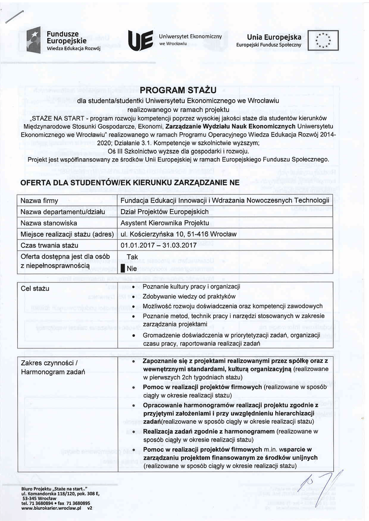 w Fundusze Europejskie Wiedza Edukacja Rozw6j Uniwersytet Ekonomiczny we Wrociawiu Unia EUfOpejska Europejski Fundusz Spoteczny PROGRAM STAZU dla studenta/studentki Uniwersytetu Ekonomicznego we Wroclawiu realizowanego w ramach projektu program kompetencji po1zez wysokiejjako5ci staze dla student6w kierunk6w NA START rozwoju ,,STME Migdzynarodowe Stosunki Gospodarcze, Ekonom| Zarzqdzanie Wydzialu Nauk Ekonomicznych Uniwersytetu Ekonomicznego we Wroclawiu" realizowanego w ramach Programu Operacyjnego Wiedza Edukacja Rozw6j 20142020; Dzialanie 3.1. Kompetencje w szkolnictwie wyZszym; OS lll Szkolnictwo wyZsze dla gospodarki i rozwoju. Projekt jest wsp6lfinansowany ze Srodk6w Unii Europejskiej w ramach Europejskiego Funduszu Spolecznego. OFERTA DLA STUDENTOWEK KIERUNKU ZARZADZANIE NE Nazwa firmy Fundacja Edukacji Innowacji i Wdra2ania Nowoczesnych Technologii Nazwa departamentu/dzialu Dzial Projektow Eu ropejskich Nazwa stanowiska Asystent Kierownika Projektu Miejsce realizacji sta2u (adres) ul. Ko5cierzyhska 10, 51-416 Wroclaw Czas tnryania sta2u 01.01.2017 Oferta dostqpna jest dla os6b z niepeNnosprawnoSciq Cel sta2u - 31.03.2017 Tak | ruie | . o o . r Poznanie kultury pracy i organizacji Zdobywanie wiedzy od praktyk6w Mozliwo66 rozwoju do5wiadczenia oraz kompetencji zawodowych Poznanie metod, technik pracy i narzgdzi stosowanych w zakresie zar zqdzania p roj e kta m i Gromadzenie doSwiadczenia w priorytetyzacji zadah, organizacji czasu pracy, raportowania realizacji zadah Zapoznanie sig z projektami realizowanymi przez sp6lke orazz wewngtrznym i sta nda rdam i, ku ltu rq orga n izacyj nq (rea izowane w pieruvszych 2ch tygodniach sta2u) Zakres czynno5ci / Harmonogram zadafr I Pomoc w realizacji projekt6w firmowych (realizowane w spos6b ciqgly w okresie realizacji stazu) Opracowanie harmonogram6w realizacji projektu zgodnie z przyjqtymi zalo2eniami i przy uwzglgdnieniu hierarchizacji zadafi(realizowane w spos6b ciqgly w okresie realizacji staZu) Reafizacja zadafi zgodnie z harmonogramem (realizowane w spos6b ciqgly w okresie realizacji stazu) Pomoc w realizacji projekt6Wfiinrowych m,in. wsparcie w zarzqdzaniu p roj e ktem f i n a nsowa n y m ze 5 rod k6w u n ij nych (realizowane w spos6b ciqgly w okresie realizacji staZu) Biuro Projektu,,Staie na start,." uf. Komandorskal1.Si12o, pok,308 53-345 Wroclaw tef.71 3680894 clax 7L 3680895 www.biurokarier.wroclaw.pl u2 E, Fundusze E Europejskie UE Wiedza Edukacja Rozw6j n om icznY Unia Europejska Europejski Fundusz Spoteczny . Zapoznanie siq z zasadami realizacji projekt6w realizowanych w ramach program6w operacyjnych (realizowane w spos6b ciqgly w okresie realizacji sta2u) o Tworzenie raport6w oraz prezentacji dotyczqcych realizacji projektow (realizowane w spos6b ciqgly w okresie realizacji staZu) o Realizaqazadari z zakresu rozwoju systemu CRM MS Dynamics (realizowane w sposob ciqgly w okresie realizacji staZu) o Obsluga klient6w zewngtrznych - zwiqzana z realizaqq projektu (realizowane w spos6b ciqgly w okresie realizacji staZu) . Rodzaj uzyskanych kom petencj i, zwiqzany ch z efektami ksztalcenia, zdobywanych podczas realizacji sta2u ko :: ffi'.'-T' Poznanie innowacyjnych narzedzi wvkorzvstvwanvch do zarzadzania proiektami (praktyka, techniki, narzgdzia) . Umieielno56 podejmowania decyzji na podstawie wvkorzystywanvch w sp6lce narzQdzi . UmieiQtno5ci orqanizowania i kierowania praca zespolu, samodzielneqo i krytyczneqo mySlenia oraz rozwiazywania problem6w o . o Zdobvcie kompetencii z zakresu oroanizacii pracv wlasnei, pracv w zespole, kom u n ikatvwno5ci Uczestnictwo w procesie zarzqdzenia projektem, praca na harm onog ra m ie, koordyn acja prac projektowych MoZliwo56 zapoznania siq ze specyfikq dzialalno5ci firmy konsultingowo-doradczej,,od wewnqtrz" Dodatkowe informacje temat sta2u na Forma aplikowania na sta2 | o o Tworzenie raport6w i analiza efektywno6ci podejmowanych dzialafi . Po zakoficzeniu staZu, mozliwoS6 nawiqzania dalszej wsp6lpracy . o Obsluga oprogramowania CRM MS Dynamics CV na adres [email protected] Rozmowa kwalifikacyjna WYMAGAN tA STAWTAN E PRZEZ PRACODAWC E Wiedza Z zakresu zarzadzania UmiejqtnoSci Wymagania/oczekiwania: Biuro Projektu,,Staie na start.." ul. KomandorckatLSlt2O, pok.308 53-345 Wroclaw tef. 71 3680894 o lax 7t 3680895 www.biurokarier.wroclaw.pl v2 . . o . . proj ektam i UmieiQtnoSd pracy w zespole Inicjatwva izaanga2owania KomunikatywnoS6 Samodzielno56 i umiejgtnoSdpodejmowania decyzji UmieiQtnbsc pracy pod presiq czasu IA E, '/ / iwersytet Ekonomiczny wroclawiu t-t Unia EUrOpejska Europejski Fundusz Spoteczny I i.*'i ** | * ** Dobra organizacja pracy Znajomo56 jqzyk6w Znajomo6c program6w komputerowych Bardzo dobra znajomo56 Srodowiska Microsoft Office (Excel, Word, Outlook, Power Point) Prawo jazdy Inne, jakie " <r\P' _fy_nlr.j.r Edukacji, Innowacji t,,^,. vvdrazania Nowoczesnych Techriolcr ul, Pasjonatdw 15, Zaxrzewr 62-070 Dopiewo :, ls\s ^Jiili7792250318 Recott,63462fb, i czytelny Pieczqd firmy lub oo Biuro Projektu,,Staie na start,." ul, Komandorska t1.Sl t2O, pok, 308 53-345 Wrocfaw fax 71 3680895 www,biurokarier.wroclaw.pl v2 tel.71 3680894 0 E, t Pracodawcy upowa2nionej Pracodawcy) I |