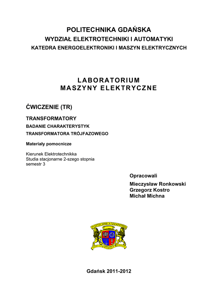 POLITECHNIKA GDAŃSKA WYDZIAŁ ELEKTROTECHNIKI I AUTOMATYKI KATEDRA ENERGOELEKTRONIKI I MASZYN ELEKTRYCZNYCH LABORATORIUM MASZYNY ELEKTRYCZNE ĆWICZENIE (TR) TRANSFORMATORY BADANIE CHARAKTERYSTYK TRANSFORMATORA TRÓJFAZOWEGO Materiały pomocnicze Kierunek Elektrotechnikka Studia stacjonarne 2-szego stopnia semestr 3 Opracowali Mieczysław Ronkowski Grzegorz Kostro Michał Michna Gdańsk 2011-2012 M. Ronkowski, G. Kostro, M. Michna: 1 ĆWICZENIE (TR) TRANSFORMATORY BADANIE CHARAKTERYSTYK TRANSFORMATORA TRÓJFAZOWEGO Program i cel ćwiczenia 1. 2. TEORIA.................................................................................................................................................... 1 BADANIA ................................................................................................................................................ 6 2.1. Oględziny zewnętrzne.......................................................................................................... 6 2.2. Pomiar rezystancji uzwojeń ................................................................................................. 6 2.3. Badanie przekładni............................................................................................................... 8 2.4. Próba stanu jałowego: badanie charakterystyk stanu jałowego......................................... 10 2.5. Próba stanu zwarcia: badanie charakterystyk zwarcia....................................................... 13 2.6. Wyznaczenie sprawności transformatora metodą strat poszczególnych ........................... 18 2.7. Wyznaczenie zmiany napięcia ........................................................................................... 19 2.8. Zadania............................................................................................................................... 20 2.9. Pytania kontrolne ............................................................................................................... 20 2.10. Literatura pomocnicza ................................................................................................... 21 1. TEORIA Budowa, działanie, model fizyczny i model obwodowy transformatora Transformator (TR) jest przetwornikiem elektromagnetycznym (rys. 1.1) o dwóch wrotach (parach zacisków), które fizycznie reprezentują: zaciski uzwojenia pierwotnego „1” i zaciski uzwojenia wtórnego „2”. Moc elektryczna (dostarczana) S1 i moc elektryczna (odbierana) S2 ulegają przemianie elektromagnetycznej za pośrednictwem pola magnetycznego. Energia pola magnetycznego jest energią wewnętrzną TR, gdyż przetwornik nie ma możliwości wymiany tej energii z otoczeniem. I2 > 0 I1 > 0 up I 1 I2 up S2 S1 U1 TRANSFORMATOR U2 S1 > 0 uk uk S2 < 0 Reprezentacja transformatora w ujęciu obwodowym U1 S1 I1 S1 > 0 TRANSFORMATOR U2 I2 S2 S2 < 0 Reprezentacja transformatora w ujęciu grafów wiązań Rys. 1.1a. Transformator – dwuwrotowy przetwornik elektromagnetyczny: wrota (zaciski) obwodu pierwotnego „1” – dopływ mocy elektrycznej S1 przetwarzanej ma moc elektryczną S2, wrota (zaciski) obwodu wtórnego „2” – odpływ mocy elektrycznej S2 2 Ćwiczenie: Transformator trójfazowy Budowę i podstawowe elementy TR 1-fazowego i 3-fazowego przedstawiono na rys. 1.1b. TRAFO składa się z następujących elementów czynnych: rdzenia (obwodu magnetycznego), uzwojenia pierwotnego i uzwojenia wtórnego (obwodów elektrycznych). Rys. 1.1b. Budowa i elementy transformatów 1-fazowego (typu AS2) i 3-fazowego (Lab. ME) Producent AS ELEKTROTECHNIK (http://www.as-elektrotechnik.pl/index3.php) Transformatory jednofazowe typu AS2 (rys. 1.1b) posiadają uzwojenia nawinięte na karkasie lub klatce izolacyjnej, oddzielone warstwą materiału izolacyjnego, umieszczone na dwukolumnowym rdzeniu składanym z blach elektromagnetycznych i impregnowane termoutwardzalną żywicą zabezpieczającą przed korozją i wilgocią. Uzwojenia strony pierwotnej i wtórnej są wyprowadzone na zaciski śrubowe. Na podstawowy model fizyczny transformatora (rozważane zjawiska fizyczne zachodzące w transformatorze) — pokazany na rys. 1.2a — składają się: elementy czynne: rdzeń, uzwojenia pierwotne i wtórne; oraz zmienne fizyczne: napięcia na zaciskach uzwojeń, prądy płynące w uzwojeniach, strumień magnetyczny główny, strumienie rozproszenia uzwojeń, straty w żelazie i straty w miedzi uzwojeń. Wyróżnia się trzy podstawowe stany pracy transformatora: stan jałowy, stan obciążenia i stan zwarcia. Stan jałowy transformatora — stan, w którym uzwojenie pierwotne zasilane jest napięciem przemiennym U1, a uzwojenie wtórnego jest otwarte. Prąd płynący w uzwojeniu pierwotnym nazywa się prądem jałowym Io a jego dwie składowe: składową czynną Iocz i bierną (magnesującą) Im. Wartości prądu jałowego zwykle wyraża się w procentach prądu znamionowego IN transformatora: I I o% = o 100 [%] (1.1) IN W transformatorach energetycznych (mocy) wartość znamionowa prąd stanu jałowego zawiera się w zakresie (1 − 10)% prądu znamionowego. Zasada: im większa moc, tym na ogół mniejszy prąd stanu jałowego. Przemienny przepływ θ1 = Ioz1 wzbudza strumień, w którym wyróżnia się strumień magnesujący (główny) Φm — strumień sprzężony z obydwoma uzwojeniami — oraz strumień rozproszenia Φσ1 — strumień sprzężony tylko z uzwojeniem własnym (zasilanym). M. Ronkowski, G. Kostro, M. Michna: 3 Efektem sprzężenia przemiennego strumienia głównego Φm z uzwojeniami jest indukowanie w nich SEM: (1.2) E1 = 4,44 z1 Φ m f E 2 = 4,44 z 2 Φ m f gdzie: z1, z2 f − liczba zwojów odpowiednio uzwojenia pierwotnego i wtórnego, − częstotliwość napięcia zasilania U1. ΔPFe Φm I2 I1 Φσ 1 z1 U1 z2 Φσ 2 U2 ΔPCu 2 Δ P Cu 1 Rys.1.2a. Podstawowy model fizyczny transformatora jednofazowego: rdzeń; cewki uzwojeń pierwotnego i wtórnego; rozpływ strumienia głównego Φm oraz strumie