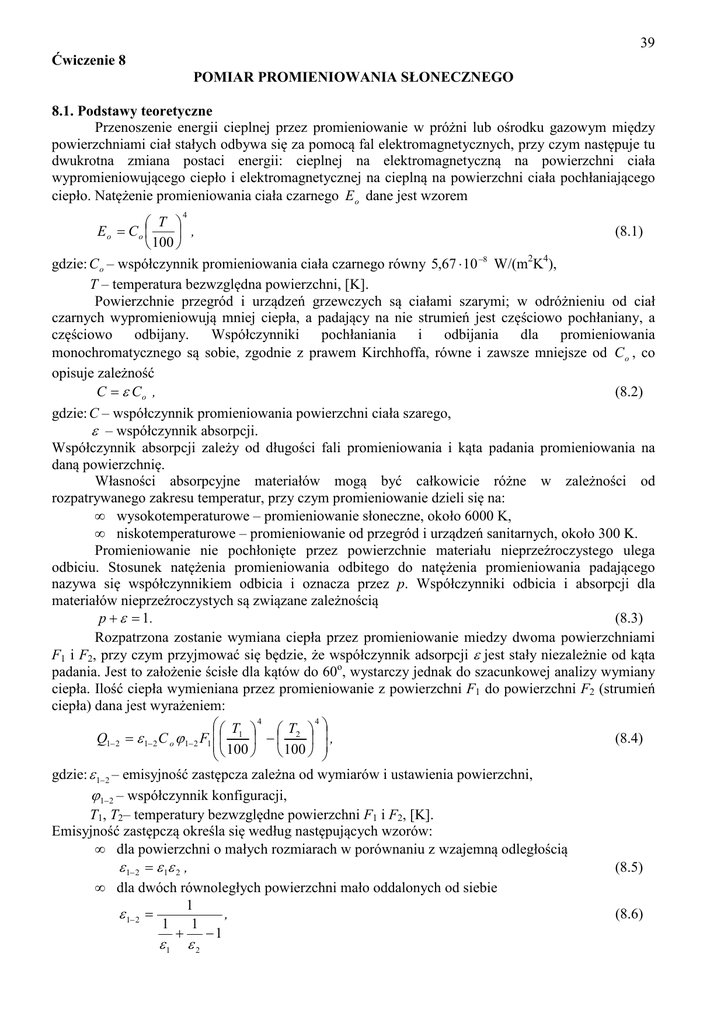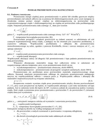 39 Ćwiczenie 8 POMIAR PROMIENIOWANIA SŁONECZNEGO 8.1. Podstawy teoretyczne Przenoszenie energii cieplnej przez promieniowanie w próżni lub ośrodku gazowym między powierzchniami ciał stałych odbywa się za pomocą fal elektromagnetycznych, przy czym następuje tu dwukrotna zmiana postaci energii: cieplnej na elektromagnetyczną na powierzchni ciała wypromieniowującego ciepło i elektromagnetycznej na cieplną na powierzchni ciała pochłaniającego ciepło. Natężenie promieniowania ciała czarnego E o dane jest wzorem 4 T Eo = Co (8.1) , 100 gdzie: C o – współczynnik promieniowania ciała czarnego równy 5,67 ⋅ 10 −8 W/(m2K4), T – temperatura bezwzględna powierzchni, [K]. Powierzchnie przegród i urządzeń grzewczych są ciałami szarymi; w odróżnieniu od ciał czarnych wypromieniowują mniej ciepła, a padający na nie strumień jest częściowo pochłaniany, a częściowo odbijany. Współczynniki pochłaniania i odbijania dla promieniowania monochromatycznego są sobie, zgodnie z prawem Kirchhoffa, równe i zawsze mniejsze od C o , co opisuje zależność C = ε Co , (8.2) gdzie: C – współczynnik promieniowania powierzchni ciała szarego, ε – współczynnik absorpcji. Współczynnik absorpcji zależy od długości fali promieniowania i kąta padania promieniowania na daną powierzchnię. Własności absorpcyjne materiałów mogą być całkowicie różne w zależności od rozpatrywanego zakresu temperatur, przy czym promieniowanie dzieli się na: • wysokotemperaturowe – promieniowanie słoneczne, około 6000 K, • niskotemperaturowe – promieniowanie od przegród i urządzeń sanitarnych, około 300 K. Promieniowanie nie pochłonięte przez powierzchnie materiału nieprzeźroczystego ulega odbiciu. Stosunek natężenia promieniowania odbitego do natężenia promieniowania padającego nazywa się współczynnikiem odbicia i oznacza przez p. Współczynniki odbicia i absorpcji dla materiałów nieprzeźroczystych są związane zależnością p + ε = 1. (8.3) Rozpatrzona zostanie wymiana ciepła przez promieniowanie miedzy dwoma powierzchniami F1 i F2, przy czym przyjmować się będzie, że współczynnik adsorpcji ε jest stały niezależnie od kąta padania. Jest to założenie ścisłe dla kątów do 60o, wystarczy jednak do szacunkowej analizy wymiany ciepła. Ilość ciepła wymieniana przez promieniowanie z powierzchni F1 do powierzchni F2 (strumień ciepła) dana jest wyrażeniem: T 4 T 4 Q1− 2 = ε 1− 2 C o ϕ 1− 2 F1 1 − 2 , (8.4) 100 100 gdzie: ε 1−2 – emisyjność zastępcza zależna od wymiarów i ustawienia powierzchni, ϕ 1−2 – współczynnik konfiguracji, T1, T2– temperatury bezwzględne powierzchni F1 i F2, [K]. Emisyjność zastępczą określa się według następujących wzorów: • dla powierzchni o małych rozmiarach w porównaniu z wzajemną odległością ε 1− 2 = ε 1ε 2 , (8.5) • dla dwóch równoległych powierzchni mało oddalonych od siebie 1 , (8.6) ε 1− 2 = 1 1 + −1 ε1 ε2 40 • dla powierzchni F1 objętej ze wszystkich stron powierzchnią F2 1 ε 1− 2 = . 1 F1 1 − 1 + ε 1 F2 ε 2 (8.7) Współczynnik konfiguracji ϕ 1−2 (zwany również kątowym współczynnikiem promieniowania) określa część całego strumienia ciepła wypromieniowanego przez powierzchnię F1, która pada na powierzchnię F2. Przy wymianie ciepła przez promieniowanie między dwoma nieograniczonymi powierzchniami ϕ 1−2 = ϕ 2−1 = 1. Przy wymianie ciepła między elementem płaszczyzny dF1 równoległym do płaszczyzny nieograniczonej F2 współczynnik konfiguracji ϕ 1−2 = 1. Współczynnik przejmowania ciepła przez promieniowanie jest to stosunek gęstości strumienia cieplnego przekazywanego z powierzchni F1 na powierzchnię F2 do różnicy temperatur tych powierzchni 4 4 Q1−2 q1−2 ε 1−2 C o ϕ1−2 T1 T2 αr = = = (8.8) − , F 1 (T1 − T2 ) (T1 − T2 ) (T1 − T2 ) 100 100 gdzie: α r – współczynnik przejmowania ciepła przez promieniowanie, [J/m2 s K = W/m2 K], Q q1− 2 = 1−2 – gęstość radiacyjnego strumienia ciepła, [J/m2 s = W/m2]. F1 Do pomiarów promieniowania sumarycznego słońca i nieba oraz promieniowania rozproszonego i odbitego (o długości fali od 0,3 do 2,4 mikrona) w warunkach polowych służy albedometr. Przyrząd ten współpracuje z galwanometrem lub integratorem elektrycznym lub innymi podobnymi miernikami elektrycznymi. Intensywność radiacji wyraża się w cal/(cm2 min). Zasada działania albedometru (rys. 8.1) jest oparta na przekształceniu promieniowania w siłę elektromotoryczną. Przekształcenie dokonuje się przy pomocy baterii szeregowo połączonych elementów (1). Nieparzyste spoiny pomiarowe termoelementów są oznaczone na czarno, a parzyste na biało. Padające na termobaterię promieniowanie pochłaniane jest w większym stopniu czarnymi, a w mniejszym stopniu białymi spoinami w wyniku czego powstaje siła elektromotoryczna mierzona galwanometrem. Wychylenie wskazówki galwanometru jest proporcjonalne do różnicy temperatur spoin a tym samym do intensywności odbieranego przez spoiny pomiarowe promieniowania. Ochronę stosu termoelektrycznego od wiatrów i opadów stanowi szkło półkoliste (2), połączone hermetycznie z korpusem przyrządu. Korpus z zamocowanym na nim stosem termoelektrycznym i kołpakiem szklanym stanowi głowicę albedometru. Metalowa pokrywa zamykająca kołpak od góry służy do wyznaczania miejsca zerowego galwanometru. Głowica albedometru nakręcona jest na rurkę (4) podwieszoną na przegubowym zawieszeniu (5, 6), które ustawia ją w położeniu poziomym. Do przegubowego zawieszenia przykręcony jest uchwyt (7). W stanie rozmontowanym albedometr umocowany jest na podstawie metalowego futerału. 1 2 3 4 5 6 7 Rys. 8.1. Budowa albedometru: 1 – bateria termoelementów, 2 – szklany kołpak, 3 – korpus, 4 – rurka, 5, 6 – przegubowe zawieszenie, 7 – uchwyt. 41 8.2. Przebieg badania Przy pomiarach suma