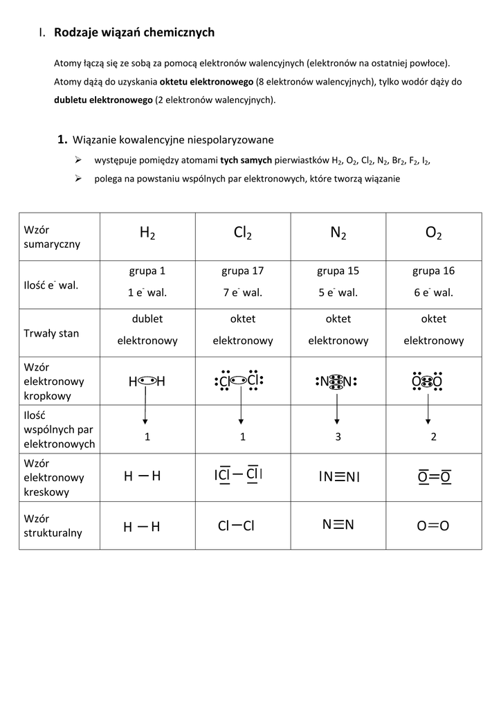 I. Rodzaje wiązań chemicznych Atomy łączą się ze sobą za pomocą elektronów walencyjnych (elektronów na ostatniej powłoce). Atomy dążą do uzyskania oktetu elektronowego (8 elektronów walencyjnych), tylko wodór dąży do dubletu elektronowego (2 elektronów walencyjnych). 1. Wiązanie kowalencyjne niespolaryzowane występuje pomiędzy atomami tych samych pierwiastków H2, O2, Cl2, N2, Br2, F2, I2, polega na powstaniu wspólnych par elektronowych, które tworzą wiązanie Wzór sumaryczny H2 Cl2 N2 O2 grupa 1 grupa 17 grupa 15 grupa 16 1 e- wal. 7 e- wal. 5 e- wal. 6 e- wal. dublet oktet oktet oktet elektronowy elektronowy elektronowy elektronowy - Ilość e wal. Trwały stan Wzór elektronowy kropkowy H H Ilość wspólnych par elektronowych Cl Cl 1 1 N N O O 3 2 Wzór elektronowy kreskowy H H Cl Cl N N O O Wzór strukturalny H H Cl Cl N N O O 2. Wiązanie kowalencyjne spolaryzowane występuje pomiędzy atomami rożnych pierwiastków polega na powstaniu wspólnych par elektronowych, które tworzą wiązanie Wzór sumaryczny HCl H (1 grupa - 1 e- wal.) Ilość e- wal. Trwały stan Wzór elektronowy kropkowy Ilość wspólnych par elektronowych Wzór elektronowy kreskowy Wzór strukturalny NH3 CO2 N (15 grupa - 5 e- wal.) C (14 grupa - 4 e- wal.) Cl (17 grupa - 7 e- wal.) H (1 grupa - 1 e- wal.) O (16 grupa - 6 e- wal.) H - dublet ele. N - oktet ele. C - oktet ele. Cl - oktet ele. H - dublet ele. O - oktet ele. H Cl 1 H Cl H Cl H N H H O C O 3 H N H H H N H H 4 O C O O C O 3. Wiązanie jonowe występuje pomiędzy atomami metalu i niemetalu polega na powstaniu jonów dodatnich (kationów) i ujemnych (anionów), które wzajemnie przyciągają się przykład 1 – NaCl +11 +17 Na - atom sodu Cl – atom chloru 11e- = 11p+ Na Na (1 grupa - 1 e- wal.) + Cl + 1e- = Cl - 10e- Cl Cl (17 grupa - 7 e- wal.) Równanie przedstawiające powstawanie jonów Na - 1e- = Na + Na - kation sodu 17e- = 17p+ krótszy zapis +17 +11 ‹ 11p+ - Cl - anion chloru 18e- › 17p+ przykład 2 – AlF3 atom glinu Al 13e- = 13p+ kation glinu Al 3+ 10e- < 13p+ +9 +9 +13 +13 +9 +9 +9 +9 3 aniony fluoru F 3 atomy fluoru F 9e- = 9p+ 10e- > 9p+ F krótszy zapis Al F F Al (13 grupa - 3 e- wal.) F (17 grupa - 7 e- wal.) Równanie przedstawiające powstawanie jonów Al - 3e- = Al 3+ 3F + 3e- = 3F - - II. Porównanie właściwości związków kowalencyjnych i jonowych. Związki jonowe Związki kowalencyjne stan skupienia: stały, tworzą sieć krystaliczną stan skupienia: stały, ciekły, gazowy wysokie temperatury topnienia i wrzenia niskie temperatury topnienia i wrzenia przewodzą prąd elektryczny nie przewodzą prądu elektrycznego