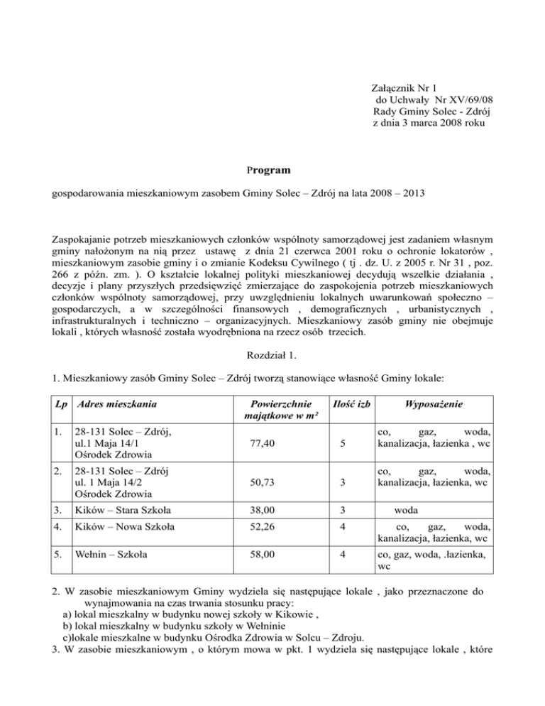 Załącznik Nr 1 do Uchwały Nr XV/69/08 Rady Gminy Solec - Zdrój z dnia 3 marca 2008 roku Program gospodarowania mieszkaniowym zasobem Gminy Solec – Zdrój na lata 2008 – 2013 Zaspokajanie potrzeb mieszkaniowych członków wspólnoty samorządowej jest zadaniem własnym gminy nałożonym na nią przez ustawę z dnia 21 czerwca 2001 roku o ochronie lokatorów , mieszkaniowym zasobie gminy i o zmianie Kodeksu Cywilnego ( tj . dz. U. z 2005 r. Nr 31 , poz. 266 z późn. zm. ). O kształcie lokalnej polityki mieszkaniowej decydują wszelkie działania , decyzje i plany przyszłych przedsięwzięć zmierzające do zaspokojenia potrzeb mieszkaniowych członków wspólnoty samorządowej, przy uwzględnieniu lokalnych uwarunkowań społeczno – gospodarczych, a w szczególności finansowych , demograficznych , urbanistycznych , infrastrukturalnych i techniczno – organizacyjnych. Mieszkaniowy zasób gminy nie obejmuje lokali , których własność została wyodrębniona na rzecz osób trzecich. Rozdział 1. 1. Mieszkaniowy zasób Gminy Solec – Zdrój tworzą stanowiące własność Gminy lokale: Lp Adres mieszkania 1. Powierzchnie majątkowe w m² Ilość izb Wyposażenie 28-131 Solec – Zdrój, ul.1 Maja 14/1 Ośrodek Zdrowia 77,40 5 co, gaz, woda, kanalizacja, łazienka , wc 28-131 Solec – Zdrój ul. 1 Maja 14/2 Ośrodek Zdrowia 50,73 3 co, gaz, woda, kanalizacja, łazienka, wc 3. Kików – Stara Szkoła 38,00 3 4. Kików – Nowa Szkoła 52,26 4 co, gaz, woda, kanalizacja, łazienka, wc 5. Wełnin – Szkoła 58,00 4 co, gaz, woda, .łazienka, wc 2. woda 2. W zasobie mieszkaniowym Gminy wydziela się następujące lokale , jako przeznaczone do wynajmowania na czas trwania stosunku pracy: a) lokal mieszkalny w budynku nowej szkoły w Kikowie , b) lokal mieszkalny w budynku szkoły w Wełninie c)lokale mieszkalne w budynku Ośrodka Zdrowia w Solcu – Zdroju. 3. W zasobie mieszkaniowym , o którym mowa w pkt. 1 wydziela się następujące lokale , które przeznacza się na wynajem jako lokale socjalne: a) Kików – Stara Szkoła 4. Lokal wymieniony w pkt 2 będzie oddawany w najem jako lokal socjalny po jego opróżnieniu przez dotychczasowego najemcę. Rozdział 2 Analiza potrzeb oraz plan remontów i modernizacji wynikający ze stanu technicznego budynków 1. Lokale tworzące mieszkaniowy zasób Gminy znajdują się w budynkach , których wiek wynosi od 20 do 100 lat. 2. Stan techniczny zasobu mieszkaniowego jest zróżnicowany. W przypadku lokali w Ośrodku Zdrowia, w nowej szkole w Kikowie i w szkole w Wełninie stan ten jest dobry i w latach 2008 -2013 przewiduje się w tych obiektach jedynie systematyczne przeprowadzanie prac konserwacyjnych i bieżących napraw i remontów. 3. Na bieżąco wykonywane będą remonty lokali mieszkalnych w zakresie na jaki pozwolą środki finansowe przeznaczone na ten cel w budżecie gminy i pilność wykonania tych remontów. 4. Przewiduje się w każdym roku obowiązywanie programu przeznaczać po 10 tys. zł rocznie na remonty i bieżącą eksploatację zasobów mieszkaniowych gminy. Rozdział 3 Planowana sprzedaż lokali mieszkalnych. 1. Sprzedaż lokali wchodzących w skład mieszkaniowego zasobu gminy odbywać się będzie na zasadach określonych uchwałę Rady Gminy i właściwymi przepisami. 2. Sprzedaż lokali mieszkalnych w budynkach szkół podstawowych powinna nastąpić jedynie w przypadku likwidacji tych szkół podstawowych i po opróżnieniu lokali mieszkalnych przez dotychczasowych najemców. Rozdział 4 Zasady polityki czynszowej. 1. Biorąc pod uwagę obecnie obowiązującą wysokość czynszu w stosunku do wartości odtworzeniowej oraz do potrzeb remontowych lokali , należy przyjąć ,że obecnie obowiązująca stawka czynszu jest za niska w stosunku do potrzeb. Prognozuje się zatem, że zmiana wysokości czynszu będzie zmierzała do jego stałego wzrostu w latach obowiązywania programu. 2. Zmiany czynszu następować będą nie częściej niż co 12 miesięcy. 3. Czynsz mieszkalny wyliczony zostanie w sposób zgodny z obowiązującą ustawą o ochronie praw lokatorów , mieszkaniowym zasobie gminy i o zmianie Kodeksu Cywilnego (tj. Dz.U. z 2005 r. Nr 31,poz.266 z późn. zm.) 4. Ustala się następujące rodzaje czynszów : a) za lokale mieszkalne, b) za lokale socjalne, które opłacają najemcy lokali mieszkalnych i socjalnych stanowiących mieszkaniowy zasób Gminy. Rozdział 5 Sposób i zasady zarządzania lokalami i budynkami wchodzącymi w skład mieszkaniowego zasobu Gminy. Zarząd mieszkaniowym zasobem Gminy sprawowany jest przez Wójta Gminy Solec – Zdrój. W okresie obowiązywania programu nie przewiduje się zmian w zarządzaniu mieszkaniowym zasobem gminy. Rozdział 6 Źródła finansowania gospodarki mieszkaniowej i wysokość wydatków w kolejnych latach. Jako zasadnicze źródło finansowania gospodarki mieszkaniowej w kolejnych latach przyjmuje się wpływy z czynszów , które aktualnie wynoszą rocznie 10 262 zł . Z kwoty tej 54% stanowią koszty remontów lokali mieszkalnych , a 46% to koszty bieżącej eksploatacji . Przewiduje się , że struktura kosztów w najbliższych 5 latach będzie kształtować się przy zachowaniu tych samych proporcji. W okresie obowiązywania programu nie przewiduje się wydatków inwestycyjnych na mieszkaniowy zasób gminy. Rozdział 7 Inne działanie mające na celu poprawę wykorzystania i nacjonalizację gospodarowania mieszkaniowym zasobem gminy. W związku ze stale pogarszającą się sytuacja mieszkaniową rodzin pozbawionych samodzielnego mieszkania , biorąc pod uwagę fakt , że mieszkaniowy zasób Gminy Solec – Zdrój stanowią lokale przeznaczone do wynajmowania na czas trwania stosunku pracy , uznaje się za uzasadnioną możliwość wynajmowania przez Gminę lokali od innych właścicieli i podnajmowanie ich osobom , których sytuacja życiowa i mieszkaniowa będzie dramatyczna. Przewodniczący Rady Zenobiusz Kowalczyk
