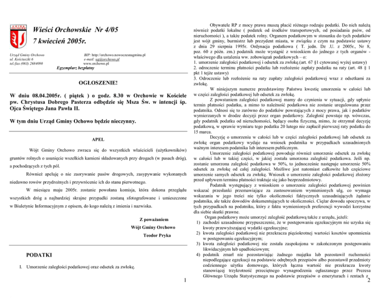 Wieści Orchowskie Nr 4/05 7 kwiecień 2005r. Urząd Gminy Orchowo ul. Kościuszki 6 tel./fax (063) 2684090 BIP: http://orchowo.nowoczesnagmina.pl e-mail: [email protected] www.orchowo.pl Egzemplarz bezpłatny OGŁOSZENIE! W dniu 08.04.2005r. ( piątek ) o godz. 8.30 w Orchowie w Kościele pw. Chrystusa Dobrego Pasterza odbędzie się Msza Św. w intencji śp. Ojca Świętego Jana Pawła II. W tym dniu Urząd Gminy Ochowo będzie nieczynny. APEL Wójt Gminy Orchowo zwraca się do wszystkich właścicieli (użytkowników) gruntów rolnych o usunięcie wszelkich kamieni składowanych przy drogach (w pasach dróg), a pochodzących z tych pól. Również apeluję o nie zaorywanie pasów drogowych, zasypywanie wykonanych niedawno rowów przydrożnych i przywrócenie ich do stanu pierwotnego. W miesiącu maju 2005r. zostanie powołana komisja, która dokona przeglądu wszystkich dróg a najbardziej skrajne przypadki zostaną sfotografowane i umieszczone w Biuletynie Informacyjnym z opisem, do kogo należą z imienia i nazwiska. Z poważaniem Wójt Gminy Orchowo Teodor Pryka PODATKI I. Umorzenie zaległości podatkowej oraz odsetek za zwłokę. 1 Obywatele RP z mocy prawa muszą płacić różnego rodzaju podatki. Do nich należą również podatki lokalne ( podatek od środków transportowych, od posiadania psów, od nieruchomości ), a także podatek rolny. Organem podatkowym w stosunku do tych podatków jest wójt gminy, burmistrz lub prezydent miasta, w związku z czym na podstawie ustawy z dnia 29 sierpnia 1995r. Ordynacja podatkowa ( T. jedn. Dz .U. z 2005r., Nr 8, poz. 60 z późn. zm.) podatnik może wystąpić z wnioskiem do jednego z tych organów właściwego dla ustalenia ww. zobowiązań podatkowych – o: 1. umorzenie zaległości podatkowej i odsetek za zwłokę.(art. 67 §1 cytowanej wyżej ustawy) 2. odroczenie terminu płatności podatku lub rozłożenie zapłaty podatku na raty (art. 48 § 1 pkt 1 tejże ustawy) 3. Odroczenie lub rozłożenie na raty zapłaty zaległości podatkowej wraz z odsetkami za zwłokę. W niniejszym numerze przedstawimy Państwu kwestię umorzenia w całości lub w części zaległości podatkowej lub odsetek za zwłokę. Z powstaniem zaległości podatkowej mamy do czynienia w sytuacji, gdy upłynie termin płatności podatku, a mimo to należność podatkowa nie zostanie uregulowana przez podatnika. Odnosi się to zarówno do podatków powstających z mocy prawa, jak i podatków wymierzanych w drodze decyzji przez organ podatkowy. Zaległość powstaje np. wówczas, gdy podatnik podatku od nieruchomości, będący osoba fizyczną, mimo, że otrzymał decyzję podatkową, w sprawie wymiaru tego podatku 20 lutego nie zapłacił pierwszej raty podatku do 15 marca. Decyzję o umorzeniu w całości lub w części zaległości podatkowej lub odsetek za zwłokę organ podatkowy wydaje na wniosek podatnika w przypadkach uzasadnionych ważnym interesem podatnika lub interesem publicznym. Umorzenie zaległości podatkowej powoduje również umorzenie odsetek za zwłokę w całości lub w takiej części, w jakiej została umorzona zaległość podatkowa. Jeśli np. zostanie umorzona zaległość podatkowa w 50%, to jednocześnie następuje umorzenie 50% odsetek za zwłokę od całej zaległości. Możliwe jest natomiast całkowite lub częściowe umorzenie samych odsetek za zwłokę. Wniosek o umorzenie zaległości podatkowej złożony przed upływem terminu płatności traktuje się jako bezprzedmiotowy. Podatnik występujący z wnioskiem o umorzenie zaległości podatkowej powinien wskazać przesłanki przemawiające za zastosowaniem wymienionych ulg, co wymaga wskazania w jego treści nie tylko okoliczności faktycznych uzasadniających żądanie podatnika, ale także dowodów dokumentujących te okoliczności. Ciężar dowodu spoczywa, w tych przypadkach na podatniku, który z faktu wymienionych preferencji wywodzi korzystne dla siebie skutki prawne. Organ podatkowy może umorzyć zaległość podatkową także z urzędu, jeżeli: 1) zachodzi uzasadnione przypuszczenie, że w postępowaniu egzekucyjnym nie uzyska się kwoty przewyższającej wydatki egzekucyjne; 2) kwota zaległości podatkowej nie przekracza pięciokrotnej wartości kosztów upomnienia w postępowaniu egzekucyjnym; 3) kwota zaległości podatkowej nie została zaspokojona w zakończonym postępowaniu likwidacyjnym lub upadłościowym; 4) podatnik zmarł nie pozostawiając żadnego majątku lub pozostawił ruchomości niepodlegające egzekucji na podstawie odrębnych przepisów albo pozostawił przedmioty codziennego użytku domowego, których łączna wartość nie przekracza kwoty stanowiącej trzykrotność przeciętnego wynagrodzenia ogłaszanego przez Prezesa Głównego Urzędu Statystycznego na podstawie przepisów o emeryturach i rentach z 2 Funduszu Ubezpieczeń Społecznych w poprzednim kwartale i jednocześnie brak jest II. LINÓWIEC spadkobierców innych niż Skarb Państwa oraz nie ma możliwości orzeczenia 2. ZESPÓŁ KOŚCIOŁA FIL. P.W. ŚW. MARCINA; odpowiedzialności podatkowej osoby trzeciej. a) KOŚCIÓŁ, drewn., 1749, remont. 1993-1995, Rej. Zab.: A - 265/7 z dnia 30 kwietnia 1984r. WAŻNE: b) DZWONNICA, drewn., 2 poł. XVIII, remont. 1929, Rej. Zab.: A - 265/7 z dnia 30 kwietnia 1984r. 3. KAPLICZKA, mur, koniec XIX w., remont, Wójt Gminy Orchowo informuje, że w przypadku braku możliwości Rej. Zab.: A - 266/8 z dnia 10 kwietnia 1984r. zapłacenia podatków w stosunku, do których jest on organem 4. PARK KRAJOBRAZOWY, 2 poł. XIX w., podatkowym, istnieje możliwość ich odpracowania. Rej. Zab.: A - 267/9 z dnia 30 kwietnia 1984r., III. MYŚLĄTKOWO Kwoty mleczne! 5. Uwaga rolnicy posiadający indywidualne kwoty mleczne dla dostawcy bezpośredniego. W dniu 31.03.2005 r. zakończył się rok kwotowy, w związku z czym KAŻDY rolnik posiadający wymienioną kwotę zobowiązany jest do wypełnienia i wysłania rocznego sprawozdania z rozdysponowania przyznanej kwot