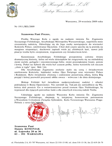 Warszawa, 29 września 2009 roku Nr 1911/BD/2009 Szanowna Pani Prezes, Prośba Waszego Kola o zgodę na nadanie imienia Św. Zygmunta Szczęsnego Felińskiego, Arcybiskupa Metropolity Warszawskiego, napełniła mnie zrozumiałą radością. Odwołując się do Jego osoby nawiązujecie do wierności Kościoła Polsce, umiłowanej Ojczyźnie. Choć dziś często spycha się tę prawdę na margines niepamięci, duchowni zapisali wiele jej chlubnych kart, nawet jeśli pisać je trzeba było cierpieniem, wygnaniem czy świadectwem krwi. Kanonizacja Arcybiskupa Felińskiego przypomina całemu światu dramatyczną historię, która od wielu dziesiątków lat rozgrywała się na nieludzkiej ziemi zsyłek, gułagów i niezmierzonego bólu; ziemi przesiąkniętej łzami, potem i krwią. Pobyt na Syberii dla wielu był czasem próby, która wytrawiła ich niczym „złoto w tyglu" (por. Mdr 3,6). Dla Arcybiskupa Zygmunta zesłanie stało się ceną i świadectwem umiłowania Kościoła, lojalności wobec Ojca Świętego oraz wierności Polsce i Rodakom. Było świadomie złożoną i codziennie ponawianą ofiarą, którą Bóg przyjął i której pozwolił przynosić obfite owoce - wówczas i do dnia dzisiejszego. Biskup Feliński był świadkiem nadprzyrodzonej nadziei i ufności pokładanej w Bożej Opatrzności. Nie zawiódł się. Tak jak nie zawiedliście się Wy, którzy dziś prosicie Go o wstawiennictwo przed tronem Ojca Niebieskiego, by wypraszał dla żyjących potrzebne łaski a dla zmarłych wieczną radość Nieba. Udzielając zgody na nadanie Waszemu Kołu imienia Św. Zygmunta Szczęsnego Felińskiego, obejmuję tę inicjatywę honorowym patronatem a Wszystkim Członkom Związku Sybiraków, Koła Terenowego Warszawa PragaPółnoc z serca bło^egteyie Szanowna Pani Danuta KOMINIAK ul. Łojewska 20 m 36 03 - 392 WARSZAWA ul. Floriańska 2 A, 03-707 Warszawa, tel. biuro 22-518-15-00, tel. dom 518-15-56, fax 22-619-26-78