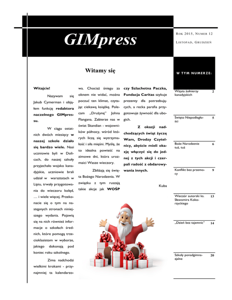 GIMPRESS GIMpress R OK 2 015, N UME R 12 L IST OP AD , G RUDZ IE Ń Witamy się Witajcie! W T Y M N U M E R Z E: wa. Chociaż śniegu za czy Szlachetna Paczka, się oknem nie widać, można Fundacja Caritas szykuje Jakub Cymerman i obją- poczuć ten klimat, czyta- prezenty dla potrzebują- łem funkcję redaktora jąc ciekawą książkę. Pole- cych, a recka parafia przy- naczelnego GIMpres- cam su. Flangana. Zabierze nas w gich. Nazywam W ciągu ostatnich dwóch miesięcy w naszej szkole działo się bardzo wiele. Nasi uczniowie byli w Dolicach, do naszej szkoły przyjechało wojsko kanadyjskie, uczniowie brali „Drużynę” świat Skandian - wojowni- Święto Niepodległości 5 Z okazji Boże Narodzenie tuż, tuż 6 Konflikt bez przemocy 9 Wieczór autorski ks. Sławomira Kokorzyckiego 13 „Dzień bez tajemnic” 14 Szkoły ponadgimnazjalne 20 nad- ków północy, wśród któ- chodzących świąt życzę rych liczą się wytrzyma- Wam, Drodzy Czytelłość i siła mięśni. Myślę, że nicy, abyście mieli okato idealna powieść na zję włączyć się do jedzimowe dni, która uroz- nej z tych akcji i czermaici Wasze wieczory. pali radość z obdarowyZbliżają się świę- wania innych. ta Bożego Narodzenia. W Lipiu, trwały przygotowa- związku z tym ruszają nia do wieczoru kolęd, takie akcje jak WOŚP nacie się o tym na na- 2 Johna gotowuje żywność dla ubo- udział w warsztatach w … i wiele więcej. Przeko- Wizyta żołnierzy kanadyjskich Kuba stępnych stronach niniejszego wydania. Pojawią się na nich również informacje o szkołach średnich, które pomogą trzecioklasistom w wyborze, jakiego dokonają pod koniec roku szkolnego. Zima nadchodzi wielkimi krokami - przynajmniej ta kalendarzo- R OK 2 015, N UME R 12 S TR. 2 Wizyta żołnierzy kanadyjskich 13 listopada naszą mości. Każdy mógł się prze- ręczną (składy mieszane) i w szkołę odwiedzili żołnierze z konać w jakim stopniu potrafi siatkówkę 3 Batalionu Królewskie- rozmawiać po angielsku. go 22 Regimentu Armii Następnie (Kanada 2:1 Recz). Między spotkaniami wszyscy zaprezentował się nasz ze- Kanadyjskiej, którzy ćwi- przenieśliśmy się na halę spor- spół cheerleaderek, do któ- czą na poligonie drawskim. tową. Tam sierżant G. Weber rego dołączyło kilku żołnie- Na dziedzińcu szkoły rozsta- zaprezentował swój kraj i za- rzy. wili pojazdy i sprzęt wojsko- poznał nas z tamtejszymi wy, z którym obcują na co zwyczajami. My nie zostali- otrzymali drobne upomin- dzień. śmy im dłużni i też przygoto- ki wykonane przez szkołę. Uczniowie Gimna- Po meczu nasi goście waliśmy prezentację - o najcie- Czas spędzony był w zjum, Szkoły Podstawowej kawszych miejscach naszego miłej atmosferze. Nasi goście oraz dzieci z Przedszkola z kraju, gminy oraz o tym, co się okazali się bardzo sympa- wielkim zainteresowaniem dzieje w naszym gimnazjum. tycznymi i oglądali prezentowany tabor. Prowadzili ją w jęz. polskim i osobami. Sami Mogli zobaczyć wozy bojo- angielskim Wiktoria Rakowska stwierdzili, że wizyta w na- we i przymierzyć poszcze- i Aleks Marach. gólne elementy ubioru. Nasi otwartymi również szej szkole była dla nich Potem nadeszła kolej ogromną przyjemnością. goście chętnie tłumaczyli, na pytania, a następnie dwie co do czego służy i opo- konkurencje: łamańce języ- icenie w życiu szkoły. Z chę- wiadali o sobie. Zaintere- kowe (w jęz. polskim, jęz. an- cią sowani malowali twarze w gielskim oraz francuskimi) oraz gości w naszych murach. barwy maskujące. Była to też łamigłówki matematyczne. okazja do zrobienia pamiąt- Z matmy lepsi byli Kanadyjczy- kowych zdjęć oraz za- cy. wierania nowych znajo- dwoma Spotkanie zakończono meczami: w piłkę Było to duże urozma- przywitamy kolejnych Jakub Cymerman GI M PRE SS S TR. 3 Wizyta żołnierzy kanadyjskich - fotorelacja R OK 2 015, N UME R 12 S TR. 4 Wywiad z sierżantem Weberem z 3 Batalionu Królewskiego Sił Zbrojnych Kanady Ile lat służy Pan w wojsku? To będzie już 26 rok. Szybko zleciało. Dlaczego wybrał Pan ten zawód? Co Pana zainspirowało do takiej decyzji? Na początku chciałem zobaczyć świat i wstąpiłem do marynarki wojennej. Z czasem przepisałem się na lotnictwo. Do kiedy będzie Pan przebywał na Poligonie Drawskim ? Nasza jednostka zostaje tutaj do lutego 2016 roku. Co spodobało się Panu i Pana kolegom w Polsce ? Ja pochodzę z Polski i mi się dużo rzeczy tutaj podoba. Kanadyjczykom, kiedy przyjechali pierwszy raz do Polski, bardzo spodobały się polskie dziewczyny (śmiech). Liczą również na łagodną zimę, nie tak srogą jak w Kanadzie. Jakie polskie jedzenie Panu smakuje? Dla mnie wszystkie polskie potrawy są wyśmienite. Żołnierzom smakują najbardziej polskie pierogi z mięsem, pierogi ruskie, żurek i bardzo lubią polskie piwo. Co kanadyjskiego mógłby pan polecić Polakom ? Syrop klonowy. Najlepszy z Kanady, polecam :) Jakiej muzyki Pan słucha ? Wszystko, od muzyki poważnej do muzyki ciężkiej, najnowsze hity, ale też piosenki z lat 80. Ogląda Pan polskie seriale, filmy ? Oglądam, jeden z moich ulubionych to "Czterej pancerni i pies". Lubię polskie filmy. Dziękujemy za rozmowę. Ja również dziękuję, był mi bardzo miło. Rozmawiały Wiktoria Bagrowska i Natalia Janiak GI M PRE SS S TR. 5 Święto Niepodległości - 11 listopada Jest to bardzo ważne ści, Koncert Niepodległości, historii wydarzenie dla nas – Pola- wykłady i inscenizacje histo- Mieliśmy również okazję za- ków. 11 listopada 1918 r. ryczne, koncerty patriotycz- trzymać się i zastanowić nad uznawany jest symbolicznie ne czy parady ulicami miast. tym, jak ważna jest wol- za pierwszy dzień niepod- W naszej szkole rów- ległości. Jednak proces od- nież staramy się uszanować naszej Ojczyzny. ność i nasz kraj. Podczas apelu rozda- zyskiwania wolności i wytyczania granic państwa był bardzo długi. Tego dnia, działając na prośbę Rady Regencyjn