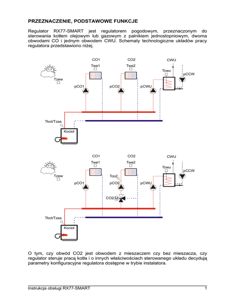 PRZEZNACZENIE, PODSTAWOWE FUNKCJE Regulator RX77-SMART jest regulatorem pogodowym, przeznaczonym do sterowania kotłem olejowym lub gazowym z palnikiem jednostopniowym, dwoma obwodami CO i jednym obwodem CWU. Schematy technologiczne układów pracy regulatora przedstawiono niżej. CO1 CO2 Twe1 Twe2 CWU Tcwu pCCW Tzew pCO1 pCO2 pCWU Tkot/Tzas Kocioł CO1 CO2 Twe1 Twe2 CWU Tcwu Tzew pCCW Tco2 pCO1 pCO2 pCWU CO2 M Tkot/Tzas Kocioł O tym, czy obwód CO2 jest obwodem z mieszaczem czy bez mieszacza, czy regulator steruje pracą kotła i o innych właściwościach sterowanego układu decydują parametry konfiguracyjne regulatora dostępne w trybie instalatora. Instrukcja obsługi RX77-SMART 1 Ważniejsze funkcje realizowane przez regulator: praca w dwóch trybach Zima lub Lato wybieranych ręcznie lub automatycznie, pogodowa lub pogodowo-pokojowa regulacja temperatury w obwodach CO, oddzielne krzywe grzania i niezależne programy tygodniowe dla obwodów CO, sterowanie pracą siłownika mieszacza obwodu CO2 w oparciu o algorytm PI, program Ferie załączany na określoną ilość dni lub bezterminowo, tygodniowy program przygotowania CWU, praca z priorytetem lub bez priorytetu CWU, program dezynfekcji instalacji CWU, załączany ręcznie lub automatycznie, tygodniowy program działania cyrkulacji CWU z cykliczną pracą pompy, zmienna histereza sterowania palnikiem, funkcje ochrony kotła i bezpiecznego odstawiania kotła, możliwość kontroli temperatury zasilania (minimalnej i maksymalnej), ochrona przed mrozem, ochrona pomp i siłownika przed zakleszczeniem, wyświetlanie wszystkich mierzonych temperatur, sygnalizacja stanów alarmowych, dźwiękowa (z możliwością wyłączenia) i optyczna, kalibracja wejść pomiarowych, test wyjść umożliwiający sprawdzenie połączeń elektrycznych. CZUJNIKI Charakterystyka czujników temperatury Regulator ma wejścia pomiarowe przystosowane do współpracy z czujnikami KTY81210. Zakres pomiarów wynosi od -28°C do 110°C. Poniższa tabela przedstawia charakterystykę elementu pomiarowego. Temperatura (°C) -40 -30 -20 -10 0 10 20 25 30 40 50 Rezystancja (Ω) 1136 1250 1372 1500 1634 1774 1922 2000 2078 2240 2410 Temperatura (°C) 60 70 80 90 100 110 120 125 130 140 150 Rezystancja (Ω) 2590 2780 2978 3182 3392 3593 3800 3904 4005 4180 4306 Wszystkie czujniki mają ten sam element pomiarowy. Informacje na temat dostępnych typów czujników oraz zalecenia dotyczące ich instalacji można znaleźć w karcie katalogowej "Czujniki temperatury z elementem pomiarowym KTY81-210" lub na stronie www.frisko.pl. 2 Instrukcja obsługi RX77-SMART MONTAŻ Regulator przeznaczony jest do montażu tablicowego. Parametry istotne przy zabudowie tablicowej: wymiary otworu 138x92,5mm, głębokość zabudowy min. 85mm, grubość tablicy 138x92,5mm. Po włożeniu regulatora w otwór tablicy należy na jego bocznych ściankach założyć uchwyty montażowe dostarczane wraz z regulatorem. Sposób zakładania uchwytów pokazano niżej. 2 1 Po założeniu uchwytów śruby dociskające regulator do tablicy należy dokręcić tak, żeby między kołnierzem regulatora a powierzchnią tablicy nie było luzów. Przy dokręcaniu śrub nie należy używać narzędzi. Zbyt mocne dokręcenie może spowodować uszkodzenie obudowy regulatora lub uchwytu. POŁĄCZENIA ELEKTRYCZNE Montaż regulatora należy powierzyć firmie instalacyjnej lub wykwalifikowanemu elektrykowi. Samodzielne wykonywanie połączeń elektrycznych grozi porażeniem lub uszkodzeniem regulatora nie podlegającym gwarancji. W układach bez CWU zaleca się pozostawienie włączonego zasilania regulatora również poza sezonem grzewczym. Umożliwia to ochronę pomp i zaworu mieszającego przed zakleszczeniem oraz zapewnia podtrzymanie nastaw regulatora. Wyłączenie napięcia zasilania na czas dłuższy od 30 dni może spowodować utratę nastaw parametrów i programów. Jeżeli zasilanie regulatora jest przez dłuższy czas wyłączone, na elementach elektronicznych może kondensować się para wodna, co niekorzystnie wpływa na trwałość urządzenia. Maksymalna obciążalność wyjść przekaźnikowych wynosi 1A/230V. Maksymalne sumaryczne obciążenie wyjść przekaźnikowych wynosi 3A/230V. Sterowanie urządzeniami o większej mocy lub trójfazowymi musi się odbywać za pośrednictwem dodatkowych przekaźników/styczników. Instrukcja obsługi RX77-SMART 3 z CO2 Twe2 ZdS Twe1 7 8 Tco2 5 6 ładująca CWU cyrkulacji CWU Tcwu Tkot/Tzas 3 4 L' obiegowa CO1 obiegowa CO2 Tzew 1 2 L o 13 14 15 16 17 18 19 20 21 22 23 24 R N 9 10 11 12 Schemat połączeń elektrycznych RX77-SMART Skróty użyte na schemacie: N L L' Tzew Tkot/Tzas Twe1 ZdS Twe2 Tco2 Tcwu Biegun neutralny zasilania sieciowego 230V/50Hz. Zasilanie regulatora - faza zasilania sieciowego 230V/50Hz. Zasilanie urządzeń wykonawczych - faza zasilania sieciowego 230V/50Hz. Czujnik temperatury zewnętrznej. Czujnik temperatury kotła, gdy regulator steruje pracą kotła. Czujnik temperatury zasiania, gdy regulator nie steruje kotłem ale kontroluje temperaturę zasilania. Czujnik nie jest wymagany, gdy regulator nie steruje kotłem ani nie kontroluje temperatury zasilania. Czujnik temperatury wewnętrznej w obwodzie CO1. Czujnik nie jest wymagany, gdy obwód CO1 jest niewykorzystywany lub gdy w obwodzie CO1 brak jest zezwolenia na regulację pokojową. Opcjonalne zdalne sterowanie dla wybranego obwodu CO, zintegrowane z czujnikiem temperatury wewnętrznej (czujnik typu CTI-S-03). Czujnik temperatury wewnętrznej w obwodzie CO2. Czujnik nie jest wymagany, gdy obwód CO2 jest niewykorzystywany lub gdy w obwodzie CO2 brak jest zezwolenia na regulację pokojową. Czujnik temperatury wody instalacyjnej w obwodzie CO2 z mieszaczem. Czujnik nie jest wymagany, gdy obwód CO2 jest niewykorzystywany lub gdy CO2 jest obwodem bez mieszacza. Czujnik temperatury wody w zasobniku CWU. Czujnik nie jest wymagany, gdy obwód CWU jest niewykorzystywany. Litery Z i O przy zaciska