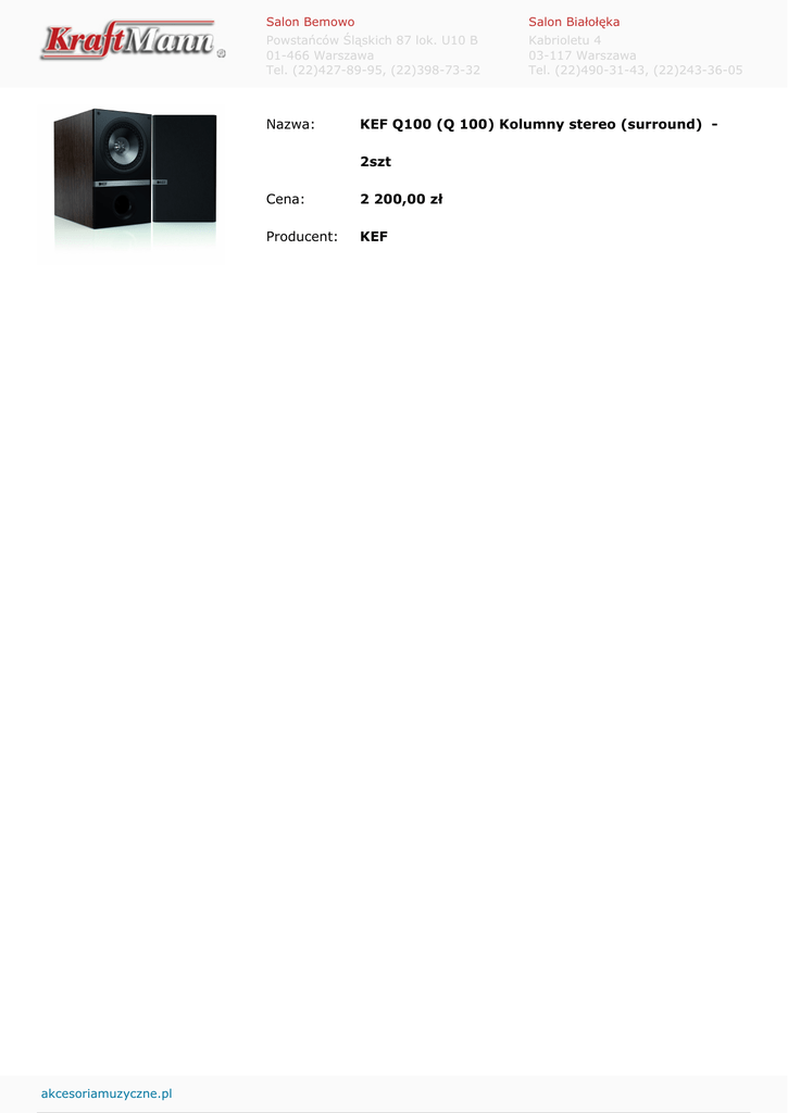 Salon Bemowo Salon Białołęka Powstańców Śląskich 87 lok. U10 B 01-466 Warszawa Tel. (22)427-89-95, (22)398-73-32 Kabrioletu 4 03-117 Warszawa Tel. (22)490-31-43, (22)243-36-05 Nazwa: KEF Q100 (Q 100) Kolumny stereo (surround) 2szt akcesoriamuzyczne.pl Cena: 2 200,00 zł Producent: KEF