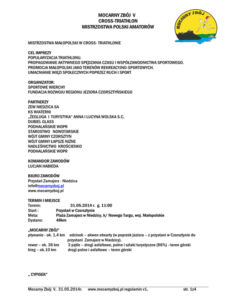 MOCARNY ZBÓJ V CROSS-TRIATHLON MISTRZOSTWA POLSKI AMATORÓW MISTRZOSTWA MAŁOPOLSKI W CROSS- TRIATHLONIE CEL IMPREZY POPULARYZACJA TRIATHLONU. PROPAGOWANIE AKTYWNEGO SPĘDZANIA CZASU I WSPÓŁZAWODNICTWA SPORTOWEGO. PROMOCJA MAŁOPOLSKI JAKO TERENÓW REKREACYJNO-SPORTOWYCH. UMACNIANIE WIĘZI SPOŁECZNYCH POPRZEZ RUCH I SPORT ORGANIZATOR: SPORTOWE WIERCHY FUNDACJA ROZWOJU REGIONU JEZIORA CZORSZTYŃSKIEGO PARTNERZY ZEW NIEDZICA SA KS WIATERNI „ŻEGLUGA I TURYSTYKA“ ANNA I LUCYNA WOLSKA S.C. DUBIEL GLASS PODHALAŃSKIE WOPR STAROSTWO NOWOTARSKIE WÓJT GMINY CZORSZTYN WÓJT GMINY ŁAPSZE NIŻNE NADLEŚNICTWO KROŚCIENKO PODHALAŃSKIE WOPR KOMANDOR ZAWODÓW LUCJAN HABIEDA BIURO ZAWODÓW Przystań Zamajerz - Niedzica [email protected] www.mocarnyzboj.pl TERMIN I MIEJSCE Termin: 31.05.2014 r. g. 11:00 Start : Przystań w Czorsztynie Meta: Plaża Zamajerz w Niedzicy, k/ Nowego Targu, woj. Małopolskie Dystans: 48km „MOCARNY ZBÓJ” pływanie - ok. 1,4 km odcinek – akwen otwarty (w poprzek jeziora – z przystani w Czorsztynie do przystani Zamajerz w Niedzicy). rower – ok. 36 km 3 pętle – drogi asfaltowe, polne i szlaki turystyczne (96%) –teren górski bieg – ok.10 km drogi polne i asfaltowe – teren górski „ CYPISEK“ Mocarny Zbój V, 31.05.2014r. www.mocarnyzboj.pl regulamin v1, str. 1z4 MOCARNY ZBÓJ V CROSS-TRIATHLON MISTRZOSTWA POLSKI AMATORÓW Pływanie - ok. 200 m Przystań Zamajerz w Niedzicy Rower górski ok. 12 km 1 pętla z dystansu głównego Bieg - ok. 3 km drogi polne i asfaltowe – teren górski KLASYFIKACJA I KATEGORIE WIEKOWE Generalna – kobiet i mężczyzn K miejsce 1,2,3 M miejsce 1,2,3 Kobiety – K, Mężczyźni – M K/M 2: 16 – 17 lat ; K/M 3: 18 – 19 lat; K/M 4: 20 – 29 lat; K/M 5: 30 – 39 lat; K/M 6: 40 – 49 lat; K7: 50 lat i powyżej, M7: 50 – 59 lat; M8: 60 lat i powyżej O przynależności do kategorii wiekowej decyduje rok urodzenia. SZTAFETY Zespoły trzy-osobowe (pływak, rowerzysta, biegacz). WARUNKI UCZESTNICTWA Zgłoszenie i opłacenie wpisowego w terminie przewidzianym przez regulamin. Pisemne oświadczenie o stanie zdrowia umożliwiającym uprawianie sportów wytrzymałościowych lub takież zaświadczenie lekarskie. ZGŁOSZENIA Po wypełnieniu formularza zgłoszeniowego zawodnik będzie automatycznie umieszczony na liście startowej. O terminie zgłoszenia decyduje data wpływu środków na konto Organizatora. Limit startujących jest ograniczony do 250 zawodników. Zgłoszenia należy wypełniać elektronicznie na stronie www.sport-timing.pl Zgłoszenia online będą aktywne do 17.05.2014 r. , późniejsza rejestracja będzie niemożliwa. WPISOWE ZAWODNICY INDYWIDUALNI 150 PLN płatne w terminie do 15.04.2014r. 200 PLN płatne w terminie od 16.04 do 10.05.2014r. 250 PLN płatne w terminie od 10.05 do 17.05.2014r. SZTAFETY 240 PLN płatne w terminie do 15.04.2014r. 360 PLN płatne w terminie od 16.04 do 10.05.2014r. 450 PLN płatne w terminie od 10.05 do 17.05.2014r. Młodzież Szkół Podstawowych i Gimnazjum oraz mieszkańcy gminy Łapsze Niżne – bezpłatnie. KONTO BANKOWE: Mocarny Zbój V, 31.05.2014r. www.mocarnyzboj.pl regulamin v1, str. 2z4 MOCARNY ZBÓJ V CROSS-TRIATHLON MISTRZOSTWA POLSKI AMATORÓW Fundacja Rozwoju Regionu Jeziora Czorsztyńskiego 34-400 Nowy Targ Nr konta: 18 1240 1574 1111 0000 0790 6224 PKO SA O/Nowy Targ z dopiskiem: Frydman tri + imię i nazwisko Wpisowe nie podlega zwrotowi. ZMIANA ZAWODNIKA Opłacony pakiet startowy, w szczególnych przypadkach losowych, można przekazać na innego zawodnika. Należy wypełnić formularz na stronie www.sport-timing.pl jak dla nowego uczestnika. Dodatkowa opłata zamiany na innego zawodnika wynosi 20zł (płatne przy odbiorze pakietu startowego). NAGRODY Dla zawodników, którzy ukończą zawody przewidziane są pamiątkowe medale, dyplomy a dla zwycięzców puchary. Nagrody rzeczowe będą przyznawane w zależności od pozyskanych sponsorów. NOCLEGI rekomendujemy (rezerwacje i opłaty we własnym zakresie) Dom Wypoczynkowy Pod Taborem, oś. Pod Taborem 2, 34-441 Niedzica Tel: 018 26 29 322 Fax:018 26 29 383 wew 231 e-mail: [email protected] Hotel Pieniny ,ul. Kanada 38, 34-441 Niedzica Tel. 018 26 29 383 Tel. 018 26 29 474 e-mail: [email protected] UWAGI KOŃCOWE 1. Zawody odbędą się bez względu na warunki atmosferyczne. 2. Ostateczne zamknięcie listy startowej nastąpi 17.05.2014 o godz. 22:00. 3. Odbiór pakietów startowych w dniu 30.05.2014 w godz. 17:00 - 20:00 4. Limit zawodników na obu dystansach wynosi 250 osób. 5. Start rozpoczyna się „z wody” o godzinie 11.00 6. Kask rowerowy jest obowiązkowy. Do strefy zmian zawodnik wchodzi z zapiętym kaskiem na głowie. 7. Sprzęt audio, w szczególności ze słuchawkami, jest niedozwolony. 8. W ramach pełnego pakietu startowego zawodnik otrzyma: numery startowe, czepek, okolicznościowy, T-shirt, talon na wyżywienie po zawodach. 9. Zawody będą ubezpieczone od następstw NW. 10. W czasie trwania zawodów organizator zapewnia opiekę medyczną. 11. Zawody odbywają się przy otwartym ruchu drogowym. 12. Zawody przeprowadzone będą według przepisów Polskiego Związku Triathlonu i niniejszego regulaminu. 13. Wszystkie sprawy sporne rozpatrywać będzie komisja apelacyjna. Mocarny Zbój V, 31.05.2014r. www.mocarnyzboj.pl regulamin v1, str. 3z4 MOCARNY ZBÓJ V CROSS-TRIATHLON MISTRZOSTWA POLSKI AMATORÓW 14. Odbiór wszystkich nagród może nastąpić wyłącznie podczas kończącej zawody ceremonii wręczenia nagród. 15. Interpretacja regulaminu należy do organizatora. PROGRAM ZAWODÓW 30.05.2014 r. (piątek): 16.00 – otwarcie Biura Zawodów w Niedzicy (przy plaży) 16.00 –19.00 – wprowadzenie rowerów do strefy zmian 17.00 – 20.00 – wydawanie pakietów startowych 18.00 – 19.00 – konferencja techniczna 31.05.2014 r. (sobota) : 8.00 – 10.00 – otwarcie Biura Zawodów w Niedzicy (przy plaży) 8.00 – 10.00 – wprowadzenie rowerów do strefy zmian, oznakowanie zawodników 1
