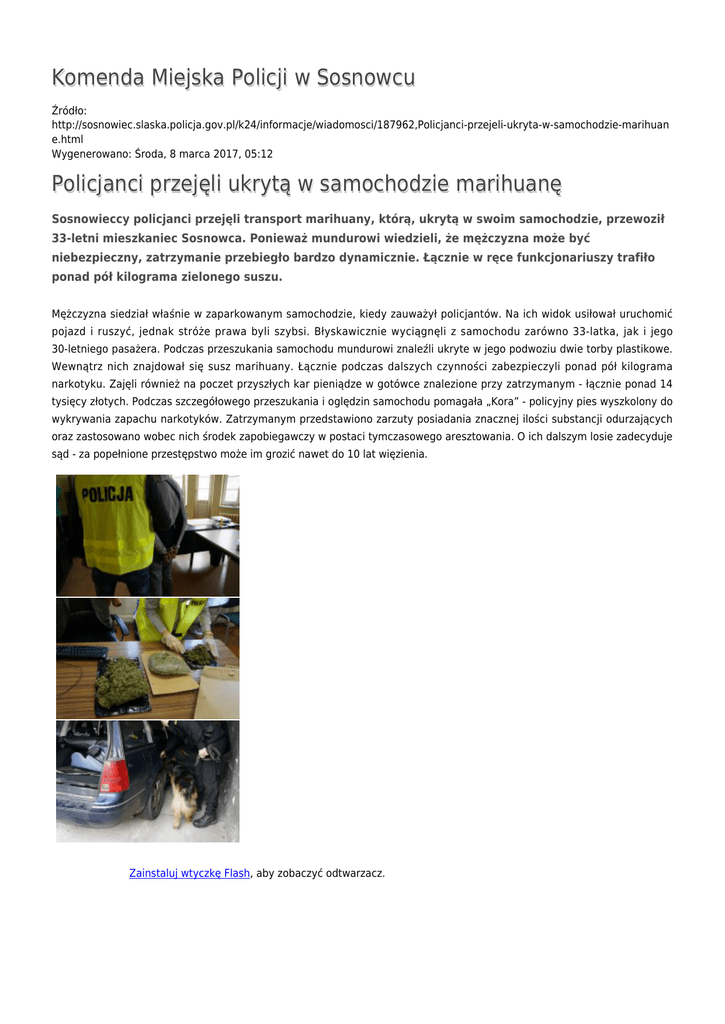 Komenda Miejska Policji w Sosnowcu Źródło: http://sosnowiec.slaska.policja.gov.pl/k24/informacje/wiadomosci/187962,Policjanci-przejeli-ukryta-w-samochodzie-marihuan e.html Wygenerowano: Środa, 8 marca 2017, 05:12 Policjanci przejęli ukrytą w samochodzie marihuanę Sosnowieccy policjanci przejęli transport marihuany, którą, ukrytą w swoim samochodzie, przewoził 33-letni mieszkaniec Sosnowca. Ponieważ mundurowi wiedzieli, że mężczyzna może być niebezpieczny, zatrzymanie przebiegło bardzo dynamicznie. Łącznie w ręce funkcjonariuszy trafiło ponad pół kilograma zielonego suszu. Mężczyzna siedział właśnie w zaparkowanym samochodzie, kiedy zauważył policjantów. Na ich widok usiłował uruchomić pojazd i ruszyć, jednak stróże prawa byli szybsi. Błyskawicznie wyciągnęli z samochodu zarówno 33-latka, jak i jego 30-letniego pasażera. Podczas przeszukania samochodu mundurowi znaleźli ukryte w jego podwoziu dwie torby plastikowe. Wewnątrz nich znajdował się susz marihuany. Łącznie podczas dalszych czynności zabezpieczyli ponad pół kilograma narkotyku. Zajęli również na poczet przyszłych kar pieniądze w gotówce znalezione przy zatrzymanym - łącznie ponad 14 tysięcy złotych. Podczas szczegółowego przeszukania i oględzin samochodu pomagała „Kora” - policyjny pies wyszkolony do wykrywania zapachu narkotyków. Zatrzymanym przedstawiono zarzuty posiadania znacznej ilości substancji odurzających oraz zastosowano wobec nich środek zapobiegawczy w postaci tymczasowego aresztowania. O ich dalszym losie zadecyduje sąd - za popełnione przestępstwo może im grozić nawet do 10 lat więzienia. Zainstaluj wtyczkę Flash, aby zobaczyć odtwarzacz. pobierz film - 31.19 MB Ocena: 3/5 (2) Tweetnij