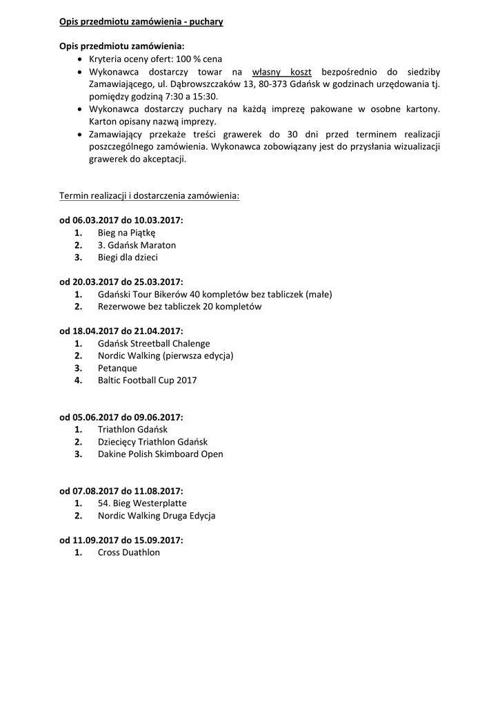 Opis przedmiotu zamówienia - puchary Opis przedmiotu zamówienia: • Kryteria oceny ofert: 100 % cena • Wykonawca dostarczy towar na własny koszt bezpośrednio do siedziby Zamawiającego, ul. Dąbrowszczaków 13, 80-373 Gdańsk w godzinach urzędowania tj. pomiędzy godziną 7:30 a 15:30. • Wykonawca dostarczy puchary na każdą imprezę pakowane w osobne kartony. Karton opisany nazwą imprezy. • Zamawiający przekaże treści grawerek do 30 dni przed terminem realizacji poszczególnego zamówienia. Wykonawca zobowiązany jest do przysłania wizualizacji grawerek do akceptacji. Termin realizacji i dostarczenia zamówienia: od 06.03.2017 do 10.03.2017: 1. Bieg na Piątkę 2. 3. Gdańsk Maraton 3. Biegi dla dzieci od 20.03.2017 do 25.03.2017: 1. Gdański Tour Bikerów 40 kompletów bez tabliczek (małe) 2. Rezerwowe bez tabliczek 20 kompletów od 18.04.2017 do 21.04.2017: 1. Gdańsk Streetball Chalenge 2. Nordic Walking (pierwsza edycja) 3. Petanque 4. Baltic Football Cup 2017 od 05.06.2017 do 09.06.2017: 1. Triathlon Gdańsk 2. Dziecięcy Triathlon Gdańsk 3. Dakine Polish Skimboard Open od 07.08.2017 do 11.08.2017: 1. 54. Bieg Westerplatte 2. Nordic Walking Druga Edycja od 11.09.2017 do 15.09.2017: 1. Cross Duathlon Inne istotne warunki zamówienia: 1. 147 kompletów pucharów identycznych jak na zdjęciu (zał. nr 1) • Puchary składające się z podstawy, nóżki, czaszy oraz tabliczki grawerowanej. • Średnica czaszy pucharu winna być nie mniejsza niż 16 cm w przypadku I miejsca, 14 cm w przypadku II miejsca i 12 cm w przypadku III miejsca. • Puchar I miejsce o wysokości nie mniejszej niż 41,5 cm. • Puchar II miejsce o wysokości nie mniejszej niż 38 cm. • Puchar III miejsce o wysokości nie mniejszej niż 33 cm. • Wysokość podstawy winna być w granicach 2,8-4,2 cm. • Podstawa wykonana jest z kamienia. • Puchary wraz z wygrawerowaną i przyklejoną, metalową tabliczką w kolorze z tekstem dedykacji. • Puchary nie mogą być wykonane w całości z plastiku. Dopuszcza się elementy z plastiku. • Puchary muszą być estetyczne, czasza nie może być wykonana z plastiku, a podstawa pucharu winna być wykonana z kamienia. • Każdy puchar będzie posiadać grawerki o wymiarach dostosowanych do podstawy pucharu przyklejone do podstawy pucharu z nadrukiem o treści podanej przez zamawiającego. Zamawiający przekaże treści grawerek do 30 dni przed terminem realizacji poszczególnego zamówienia. • 1 Komplet = 3szt = I,II,III miejsce. Załącznik nr 1 2. 72 kompletów pucharów identycznych jak na zdjęciu (zał. nr 2) • Puchary składające się z podstawy, nóżki, czaszy oraz tabliczki grawerowanej • Średnica czaszy pucharu winna być nie mniejsza niż 10cm w przypadku I miejsca, 8cm w przypadku II miejsca i 8cm w przypadku III miejsca. • Puchar I miejsce o wysokości nie mniejszej niż 25 cm. • Puchar II miejsce o wysokości nie mniejszej niż 23 cm. • Puchar III miejsce o wysokości nie mniejszej niż 22 cm. • Wysokość podstawy winna być w granicach 1,5-2,5 cm. • Podstawa wykonana jest z kamienia. • Puchary wraz z wygrawerowaną, metalową tabliczką w kolorze z tekstem dedykacji. • Puchary nie mogą być wykonane w całości z plastiku. Dopuszcza się elementy z plastiku. • Puchary muszą być estetyczne, czasza nie może być wykonana z plastiku, a podstawa pucharu winna być marmurowo-podobna. • 1 Komplet = 3szt = I,II,III miejsce. • Każdy puchar będzie posiadać grawerki o wymiarach dostosowanych do podstawy pucharu przyklejone do podstawy pucharu z nadrukiem o treści podanej przez zamawiającego. Zamawiający przekaże treści grawerek do 30 dni przed terminem realizacji poszczególnego zamówienia. Załącznik nr 2 3. 34 kompletów pucharów identycznych jak na zdjęciach (zał. 3) + 3 za I miejsce + 2 za III miejsce: • Puchar I miejsce o wysokości 44 cm, • Puchar II miejsce o wysokości 40 cm, • Puchar III miejsce o wysokości 35 cm, • Każdy puchar wykonany jest ze metalu, marmuru i plastiku. • Podstawa wykonana jest z kamienia. • Puchar wyglądem identyczny jak na zdjęciu. • Każdy puchar będzie posiadać grawerki o wymiarach dostosowanych do podstawy pucharu przyklejone do podstawy pucharu z nadrukiem o treści podanej przez zamawiającego. Zamawiający przekaże treści grawerek do 30 dni przed terminem realizacji poszczególnego zamówienia. • 1 Komplet = 3szt = I,II,III miejsce. Załącznik nr 3 4. 1 komplet pucharów identycznych jak na zdjęciu (zał. nr 4) + 1 puchar za IV miejsce: • Puchar I miejsce o wysokości nie mniejszej niż 57 cm. • Puchar II miejsce o wysokości nie mniejszej niż 53 cm. • Puchar III miejsce o wysokości nie mniejszej niż 49 cm • Puchar IV miejsce o wysokości nie mniejszej niż 43 cm • Średnica czaszy pucharu winna być nie mniejsza niż 20cm w przypadku I miejsca, 20 cm w przypadku II miejsca, 18 cm w przypadku III miejsca i 16 cm w przypadku IV miejsca • Wysokość czaszy pucharu nie może być mniejsza niż 1/3 wysokości całego pucharu • Puchary składające się z podstawy, nóżki, czaszy, tabliczki grawerowanej, uszu oraz przykrywki • Puchary mają mieć uszy wykonane z metalu przytwierdzone do czaszy pucharu, umożliwiające uniesienie za nie pucharu • Podstawa pucharu powinna być wykonana z drewna • Puchary nie mogą być wykonane w całości z plastiku. Dopuszcza się elementy z plastiku. • Czasza winna być wykonana z metalu. • Do każdego pucharu ma być dołączona przykrywka wykonana z metalu • Każdy puchar będzie posiadać grawerki o wymiarach dostosowanych do podstawy pucharu przyklejone do podstawy pucharu z nadrukiem o treści podanej przez zamawiającego. Zamawiający przekaże treści grawerek do 30 dni przed terminem realizacji poszczególnego zamówienia. Załącznik nr 4 Wykonawca zobowiązany jest do przysłania wizualizacji nadruku w celu akceptacji. Wykonawca zobowiązany jest do przyklejenia tabl