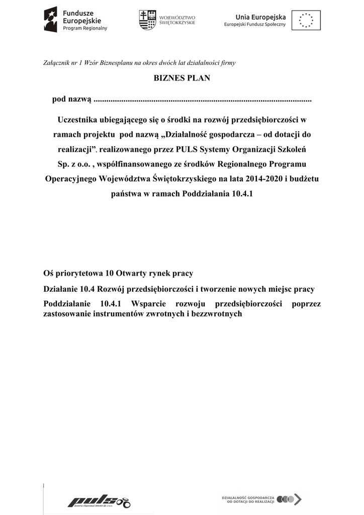 Załącznik nr 1 Wzór Biznesplanu na okres dwóch