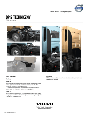 OPIS TECHNICZNY Wloty powietrza Wloty powietrza AIRIN-RL Warianty Wlot powietrza usytuowany po lewej stronie za kabiną, zamontowany na wsporniku błotnika. AIRIN-HI Wlot powietrza zamocowany wysoko po prawej stronie tylnej ściany kabiny ogranicza możliwość przedostawania się kurzu do filtra powietrza i związanych z tym problemów. Obudowa wlotu powietrza jest wykonana z czarnego tworzywa sztucznego i ma nieznaczny wpływ na masę pojazdu. AIRIN-FR Wlot powietrza i filtr powietrza z przodu kabiny, umieszczone przed prawym przednim kołem. Wariant ten jest przeznaczony dla pojazdów z kierownicą po lewej stronie. Volvo Truck Corporation www.volvotrucks.com POL 2013-06-17 Version 01