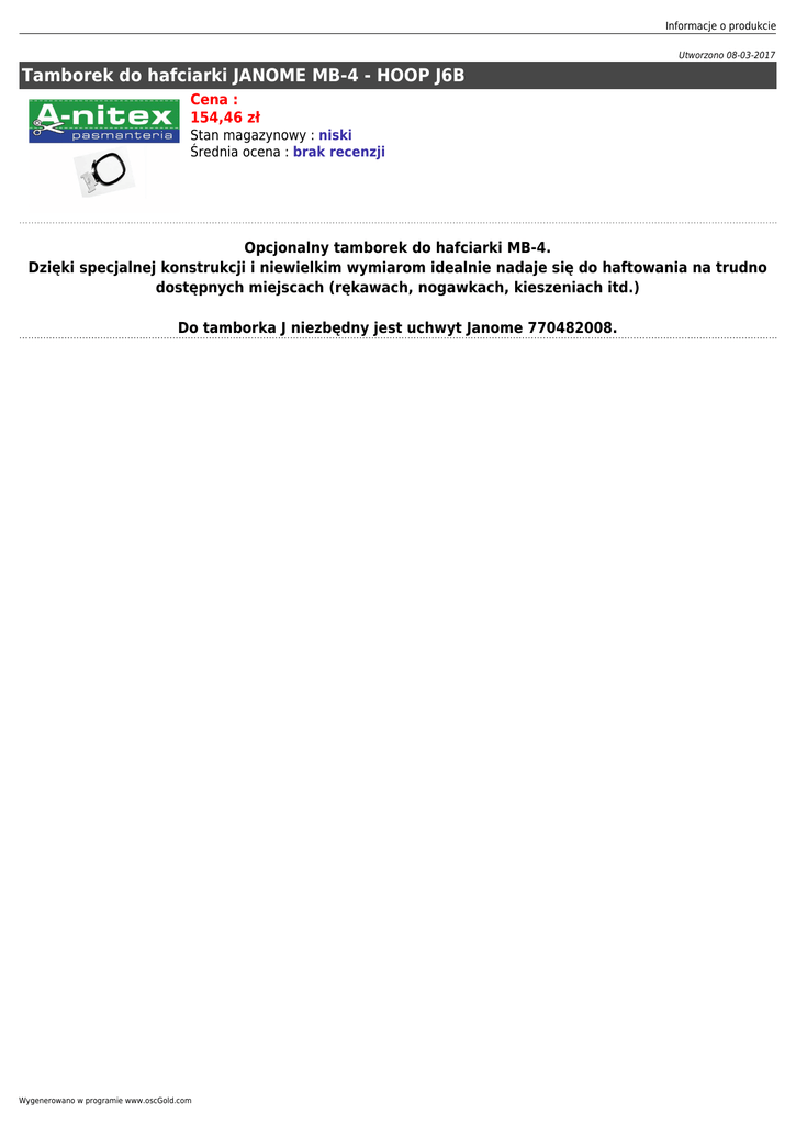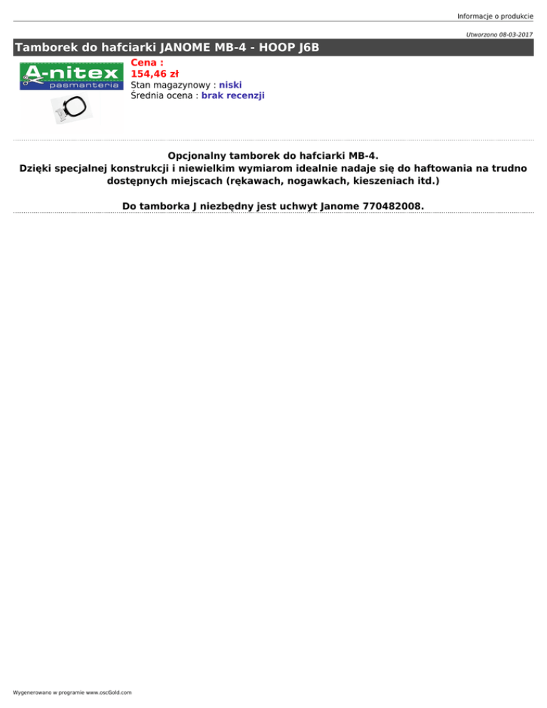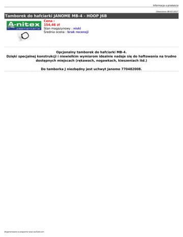 Informacje o produkcie Utworzono 08-03-2017 Tamborek do hafciarki JANOME MB-4 - HOOP J6B Cena : 154,46 zł Stan magazynowy : niski Średnia ocena : brak recenzji Opcjonalny tamborek do hafciarki MB-4. Dzięki specjalnej konstrukcji i niewielkim wymiarom idealnie nadaje się do haftowania na trudno dostępnych miejscach (rękawach, nogawkach, kieszeniach itd.) Do tamborka J niezbędny jest uchwyt Janome 770482008. Wygenerowano w programie www.oscGold.com