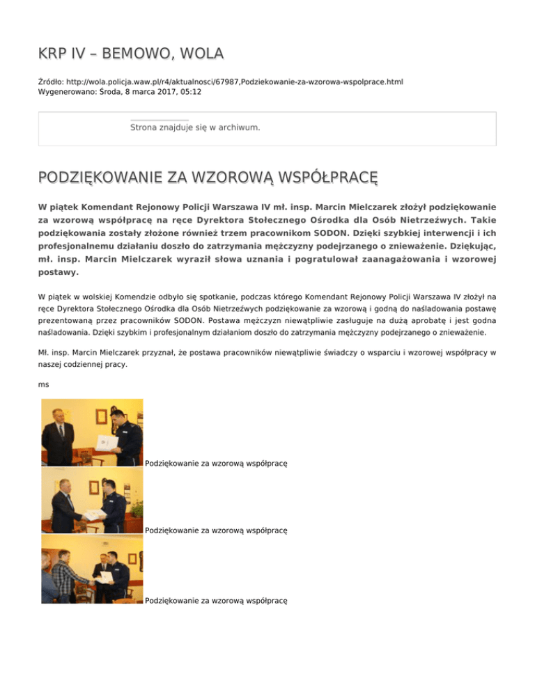 KRP IV – BEMOWO, WOLA Źródło: http://wola.policja.waw.pl/r4/aktualnosci/67987,Podziekowanie-za-wzorowa-wspolprace.html Wygenerowano: Środa, 8 marca 2017, 05:12 Strona znajduje się w archiwum. PODZIĘKOWANIE ZA WZOROWĄ WSPÓŁPRACĘ W piątek Komendant Rejonowy Policji Warszawa IV mł. insp. Marcin Mielczarek złożył podziękowanie za wzorową współpracę na ręce Dyrektora Stołecznego Ośrodka dla Osób Nietrzeźwych. Takie podziękowania zostały złożone również trzem pracownikom SODON. Dzięki szybkiej interwencji i ich profesjonalnemu działaniu doszło do zatrzymania mężczyzny podejrzanego o znieważenie. Dziękując, mł. insp. Marcin Mielczarek wyraził słowa uznania i pogratulował zaanagażowania i wzorowej postawy. W piątek w wolskiej Komendzie odbyło się spotkanie, podczas którego Komendant Rejonowy Policji Warszawa IV złożył na ręce Dyrektora Stołecznego Ośrodka dla Osób Nietrzeźwych podziękowanie za wzorową i godną do naśladowania postawę prezentowaną przez pracowników SODON. Postawa mężczyzn niewątpliwie zasługuje na dużą aprobatę i jest godna naśladowania. Dzięki szybkim i profesjonalnym działaniom doszło do zatrzymania mężczyzny podejrzanego o znieważenie. Mł. insp. Marcin Mielczarek przyznał, że postawa pracowników niewątpliwie świadczy o wsparciu i wzorowej współpracy w naszej codziennej pracy. ms Podziękowanie za wzorową współpracę Podziękowanie za wzorową współpracę Podziękowanie za wzorową współpracę Podziękowanie za wzorową współpracę Ocena: 0/5 (0) Tweetnij