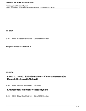 OBSADA NA DZIEŃ 8/9/12.06.2013r. Wpisany przez Mirosław Mądrzak środa, 05 czerwca 2013 08:42 - Poprawiony środa, 12 czerwca 2013 06:32 III LIGA 8.06. 17:00 Notecianka Pakość – Cuiavia Inowrocław Matyniak-Grzesiak-Orszulak K. IV LIGA 8.06. 16:00 LKS Gołuchów – Victoria Ostrzeszów Moszak-Borkowski-Zieliński 8.06. 16:00 Victoria Wrzesnia – LKS Ślesin Krawczyński-Helwich-Wrzeszczyński 8.06. 16:00 Biały Orzeł Kożmin – Obra 1912 Kościan 1 / 20 OBSADA NA DZIEŃ 8/9/12.06.2013r. Wpisany przez Mirosław Mądrzak środa, 05 czerwca 2013 08:42 - Poprawiony środa, 12 czerwca 2013 06:32 Poroś-Smolarek-Szcześniak 8.06. 16:00 Płomyk Jarota II Jarocin – Olimpia Koło Garczarek-Lewek M.-Lewek Z. 8.06. 16:00 KS Opatówek – Sparta Konin Każmierczak-Marcinek-Nowak G. 8.06. 16:00 Włókniarz 1925 Kalisz – Dąbroczanka Pępowo Haszek-Lewandowicz-Drygas 8.06. 16:00 Mieszko Gniezno – Leśniik Margonin Jasiak Ł.-Chlebowski-Król I LIGA KOBIET 8.06. 18:00 Koziołek Poznań – Stilon Gorzów Wlkp. Grygiel III LIGA KOBIET 2 / 20 OBSADA NA DZIEŃ 8/9/12.06.2013r. Wpisany przez Mirosław Mądrzak środa, 05 czerwca 2013 08:42 - Poprawiony środa, 12 czerwca 2013 06:32 8.06. 11:00 Włókniarz 1925 Kalisz – Medyk III Konin Krajewski Sprawozdania OZPN Konin-Ryczałt Okr. Jun. Młodsz.-Czas gry 2x40 min. KLASA OKRĘGOWA 9.06.2013r. 11:00 Czarni Dobrzyca – Gorzyczanka Gorzyce Wielkie Włoch-Resliński-Grygiel 16:00 Orzeł Mroczeń – Pogoń Nowe Skalmierzyce Jasiak W.-Jasiak Ł-Marcinek 16:00 Odolanovia Odolanów – Zieloni Kożminek Wandelewski-Krawczyński-Liberski 11:00 Barycz Janków Przygodzki – LKS Jankowy Orszulak K.-Matyniak-Ostrysz 11:00 Pogoń Trębaczów – Stal Pleszew Szczesniak-Poroś-Krajewski 16:00 LKS Czarnylas – Polonia Kępno Król-Haszek-Helwich 3 / 20 OBSADA NA DZIEŃ 8/9/12.06.2013r. Wpisany przez Mirosław Mądrzak środa, 05 czerwca 2013 08:42 - Poprawiony środa, 12 czerwca 2013 06:32 KLASA OKREGOWA 12.06.2013r. 18:00 Czarni Dobrzyca – LKS Czarnylas Marucha-Wasielewski-Maciejewski 18:00 Olimpia Brzeziny – Pogoń Trębaczów /B.Prosny Kalisz/ ZMIANA--Haszek-Mielcarek-Nowak B. 18:00 Astra Krotoszyn – Odolanovia Odolanów Lewek M.-Garczarek-Lewek Z. 18:00 Stal Pleszew – Pogoń Nowe Skalmierzyce ZMIANA--Moszak-Czubak-Zieliński 18:00 Barycz Janków Przygodzki – Zieloni Kożminek Jasiak Ł.-Jasiak W.-Każmierczak KLASA A GRUPA I 9.06.2013r. 4 / 20 OBSADA NA DZIEŃ 8/9/12.06.2013r. Wpisany przez Mirosław Mądrzak środa, 05 czerwca 2013 08:42 - Poprawiony środa, 12 czerwca 2013 06:32 11:00 Prosna Kalisz – Błękitni Sparta Kotlin Turkiewicz-Moszak-Matyskiewicz 11:00 Błękitni Biadki – WKS Witaszyce Wasielewski-Pawelec-Ostrychalski 11:00 CKS Zduny – Victoria Skarszew Borkowski-Grzesiak-Zieliński 11:00 Unia Szymanowice – Korona-Pogoń Stawiszyn /B. Nowa Wieś/ Haszek-Helwich-Król 11:00 Re-Bud Piast Czekanów – Raszkowianka Raszków Bęś-Lewek M.-Garczarek 16:00 GKS Żerków – CKS Zbiersk Pawelec-Wasielewski-Ostrychalski KLASA A GRUPA II 9.06.2013r. 16:00 LZS Czajków – Lilia Mikstat Czysty-Korczak-Marciniak 5 / 20 OBSADA NA DZIEŃ 8/9/12.06.2013r. Wpisany przez Mirosław Mądrzak środa, 05 czerwca 2013 08:42 - Poprawiony środa, 12 czerwca 2013 06:32 11:00 OKS Ostrów Wlkp. – Sokół Bralin /ul. Krotoszyńska/ Lewek Z.-Śniadecki-Nikodem UWAGA MECZ ODBĘDZIE SIĘ W TRZCINICY--KOSZTY POKRYWA GKS--16:00 GKS Rychtal-Skoroszów – LZS Trzcinica Grzesiak-Borkowski-Zieliński 16:00 Strażak Słupia – LZS Siedlików Starczan-Maj-Wieczorek 11:00 Zawisza Łęka Opatowska – Sokół Świba Każmierczak-Chlebowski-Mielcarek 16:00 Victoria Laski – Pelikan Grabów Kaczała-Janicki-Farbicki D. 16:00 KS Hanulin – Zefka Kobyla Góra /OSiR Kępno/ Pęcherz-Wrzeszczyński-Maciejewski KLASA B GRUPA I 9.06.2013 r. 11:00 Błysk Daniszyn – Sokół Chwaliszew /B. Łąkociny/ Matuszak-Nowak P.-Jakubiak 6 / 20 OBSADA NA DZIEŃ 8/9/12.06.2013r. Wpisany przez Mirosław Mądrzak środa, 05 czerwca 2013 08:42 - Poprawiony środa, 12 czerwca 2013 06:32 11:00 Prosna Chocz-Kwileń – LKS Gorzyce Małe /B.Kwileń/ Kmiecik-Nowak G.-Lewandowicz 11:00 Sulmirczyk Sulmierzyce – Iskra-Prosna Sieroszewice Goliński-Galewski-Kuszaj 11:00 Tarchalanka Tarchały Wielkie – Huragan Szczury Liberski-Krawczyński-Wandelewski 11:00 Zębców Ostrów Wlkp. – Czarni Wierzbno /ul. Staroprzygodzka/ Wieczorek-Starczan-Maj KLASA B GRUPA II 9.06.2013r. 11:00 Pelikan Nowy Karolew – Jaskiniowiec Rajsko Żubrowski-Marucha.-Fiszbach 11:00 KS Kościelna Wieś – Liskowiak Lisków Tomczuk-Kędzia-Szymczak 7 / 20 OBSADA NA DZIEŃ 8/9/12.06.2013r. Wpisany przez Mirosław Mądrzak środa, 05 czerwca 2013 08:42 - Poprawiony środa, 12 czerwca 2013 06:32 11:00 Dragon Dzierzbin – Wicher Mycielin Żakowski-Kurzawa-Garbarek 11:00 Korona Chełmce – Panda Pamięcin /B. Opatówek/ ZMIANA--Marciniak-Korczak-Czysty KLASA B GRUPA III 9.06.2013r. 16:00 Orzeł Wysocko Wielkie – Dunin II Biskupice Zabaryczne /B.Lewków/ ZMIANA--Nowak B.-Dominiak-Krzywański 16:00 Przełom Torzeniec – Masovia Kraszewice Machowicz-Smolarek-Janus 16:00 Sokoły Droszew – Łużyczanka Kużnica Grabowska /B. P. Skalmierzyce/ Garbarek-Kurzawa-Żakowski 16:00 Wtórowianka Wtórek – LZS Godziesze Lewandowicz-Nowak G.-Kmiecik 16:00 Zawisza Sośnie – LZS Doruchów 8 / 20 OBSADA NA DZIEŃ 8/9/12.06.2013r. Wpisany przez Mirosław Mądrzak środa, 05 czerwca 2013 08:42 - Poprawiony środa, 12 czerwca 2013 06:32 Ostrysz-Matyniak-Orszulak K. 12.06. 18:00 /środa/ LZS Godziesze – Zawisza Sośnie Śniadecki-Matuszak-Janicki KLASA B GRUPA IV 9.06.2013r. 11:00 LZS Ostrówiec – LZS Mikorzyn Marcinek-Jasiak W.-Jasiak Ł. 11:00 Pogoń Drożki – KS Rogaszyce Janicki-Kaczała-Farbicki D. 11:00 Zryw Kierzno – Ajax Rojów Wrzeszczyński-Pęcherz-Maciejewski KLASA OKRĘGOWA JUNIOR STARSZY 8.06.2013r. 11:00 LZS Bukownica – Astra - Śniadecki 9 / 20 OBSADA NA DZIEŃ 8/9/12.06.2013r. Wpisany przez Miros