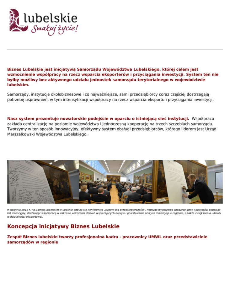 Biznes Lubelskie jest inicjatywą Samorządu Województwa Lubelskiego, której celem jest wzmocnienie współpracy na rzecz wsparcia eksporterów i przyciągania inwestycji. System ten nie byłby możliwy bez aktywnego udziału jednostek samorządu terytorialnego w województwie lubelskim. Samorządy, instytucje okołobiznesowe i co najważniejsze, sami przedsiębiorcy coraz częściej dostrzegają potrzebę usprawnień, w tym intensyfikacji współpracy na rzecz wsparcia eksportu i przyciągania inwestycji. Nasz system prezentuje nowatorskie podejście w oparciu o istniejącą sieć instytucji. Współpraca zakłada centralizację na poziomie województwa i jednoczesną kooperację na trzech szczeblach samorządu. Tworzymy w ten sposób innowacyjny, efektywny system obsługi przedsiębiorców, którego liderem jest Urząd Marszałkowski Województwa Lubelskiego. 9 kwietnia 2015 r. na Zamku Lubelskim w Lublinie odbyła się konferencja „Razem dla przedsiębiorczości”. Podczas wydarzenia włodarze gmin i powiatów podpisali list intencyjny, deklarując współpracę w zakresie wdrożenia działań wspierających napływ i powstawanie nowych inwestycji w regionie, a także zwiększenia udziału w działalności eksportowej. Koncepcja inicjatywy Biznes Lubelskie Zespół Biznes lubelskie tworzy profesjonalna kadra - pracownicy UMWL oraz przedstawiciele samorządów w regionie 1. Poziom województwa reprezentuje zespół składający się z pilotów inwestycyjnych, pracowników wspierających eksport oraz zespołu PR, do których zadań należy m.in.: - pozyskiwanie informacji gospodarczych z regionu, w tym powiatów i gmin, - pozyskiwanie ofert inwestycyjnych od właścicieli terenów przeznaczonych pod inwestycje, - wsparcie powiatowych i gminnych pracowników w obsłudze inwestorów przy zachowaniu wysokiej jakości standardów obsługi (profesjonalne prowadzenie procesu inwestycyjnego, wsparcie językowe samorządów przy komunikacji i współpracy z inwestorem, organizacja wizyt studyjnych, wsparcie w przygotowaniu materiałów promocyjnych, prezentacja potencjału inwestycyjnego województwa w miejscu organizacji wizyt studyjnych) 2. Poziom powiatowy reprezentuje wydelegowany do pełnienia tej funkcji pracownik starostwa powiatowego: - pracownik powiatowy wspiera zespół Biznes Lubelskie poprzez cykliczne dostarczanie informacji gospodarczych z powiatu, a tym samym zwiększa zasięg promocji powiatu, - pracownik powiatowy wspiera zespół Biznes Lubelskie w pozyskiwaniu aktualnych ofert inwestycyjnych z powiatu, 3. Poziom gminny reprezentuje wydelegowany do pełnienia tej funkcji pracownik urzędu gminy/miasta, którego zadaniem jest: - wspieranie zespołu Biznes Lubelskie poprzez cykliczne dostarczanie informacji gospodarczych z gminy/miasta, a tym samym zwiększa zasięg promocji gminy, - przekazywanie cyklicznie do zespołu Binzes Lubelskie informacji dotyczących dostępnych terenów inwestycyjnych Zachęcamy do współpracy Będąc członkiem zespołu otrzymują Państwo: - wsparcie w profesjonalnym przygotowaniu opisu terenów dla inwestorówi oraz ich promocji wśród polskich i zagranicznych inwestorów, - wsparcie pilotów inwestycyjnych w procesie obsługi inwestorów, (wsparcie w opracowywaniu strategii obsługi inwestora, wspólna organizacja spotkań z inwestorem, wizyt studyjnych, wsparcie w tłumaczeniach językowych), - pomoc w pozyskiwaniu informacji gospodarczych kluczowych dla inwestora przez członków Biznes Lubelskie w UMWL (wsparcie ekspertów odpowiadających za poszczególne branże i obszary tematyczne), - promocję gminy/powiatu na portalu gospodaczym w postaci publikacji przekazanych UMWL informacji gospodarczych z Państwa powiatu/gminy, - promocję lokalnych wydarzeń poprzez możliwość zamieszczenia ich w kalendarzu wydarzeń gospodarczych, a także wsparcie w rozpowszechnianiu informacji o tych wydarzeniach w oparciu o dysponowaną bazę kilku tysięcy adresatów, - promocję lokalnych firm, instytucji oraz stowarzyszeń, które działają na rzecz wsparcia biznesu, - współpracę podczas kreowania i organizacji wydarzeń gospodarczych, Dzięki naszej współpracy korzysta przedsiębiorca - eksporter/inwestor, który nie jest odsyłany „od okienka do okienka”, tylko od początu do końca jest otoczony naszą profesjonalną opieką. Przedsiębiorca w jednym miejscu otrzymuje kluczowe informacje: 1. Inwestor: dostępne tereny inwestycyjne, ulgi i zachęty podatkowe, możliwości dofinansowania inwestycji z UE, informacje o Specjalnych Strefach Ekonomicznych, zasobach ludzkich w województwie, wynagrodzeniach, nieruchomościach itp. 2. Eksporter: pomoc w doborze rynku zbytu, przewozie towarów, informacje celne, dot. opłat, warunków sprzedaży, certyfikatach itp., analizy rynków eksportowych, bazy kooperantów itp. Przedsiębiorca jest klientem, a zespół Biznes Lubelskie dba o to, by pomoc dla biznesu była profesjonalna, kompleksowa i szybka. Zainteresowane samorządy serdecznie zapraszamy do współpracy. W każdej chwili można przyłączyć się do inicjatywy podpisując list intencyjny. Dane kontaktowe do osób odpowiedzialnych za poszczególne powiaty w ramach inicjatywy Biznes Lubelskie dostępne są w zakładce "Kontakt". Drukuj [1] Pobierz PDF [2] Pobierz DOC [3] Źródło: http://www.invest.lubelskie.pl/pl/portal-wspolnych-dzialan Odnośniki [1] http://www.invest.lubelskie.pl/pl/print/410 [2] http://www.invest.lubelskie.pl/pl/printpdf/410 [3] http://www.invest.lubelskie.pl/pl/print/410?type=doc