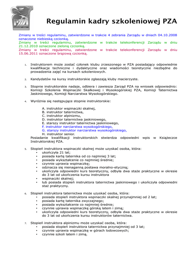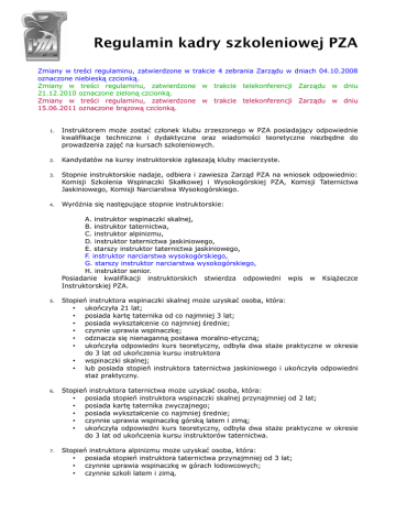 Regulamin kadry szkoleniowej PZA Zmiany w treści regulaminu, zatwierdzone w trakcie 4 zebrania Zarządu w dniach 04.10.2008 oznaczone niebieską czcionką. Zmiany w treści regulaminu, zatwierdzone w trakcie telekonferencji Zarządu w dniu 21.12.2010 oznaczone zieloną czcionką. Zmiany w treści regulaminu, zatwierdzone w trakcie telekonferencji Zarządu w dniu 15.06.2011 oznaczone brązową czcionką. 1. Instruktorem może zostać członek klubu zrzeszonego w PZA posiadający odpowiednie kwalifikacje techniczne i dydaktyczne oraz wiadomości teoretyczne niezbędne do prowadzenia zajęć na kursach szkoleniowych. 2. Kandydatów na kursy instruktorskie zgłaszają kluby macierzyste. 3. Stopnie instruktorskie nadaje, odbiera i zawiesza Zarząd PZA na wniosek odpowiednio: Komisji Szkolenia Wspinaczki Skałkowej i Wysokogórskiej PZA, Komisji Taternictwa Jaskiniowego, Komisji Narciarstwa Wysokogórskiego. 4. Wyróżnia się następujące stopnie instruktorskie: A. instruktor wspinaczki skalnej, B. instruktor taternictwa, C. instruktor alpinizmu, D. instruktor taternictwa jaskiniowego, E. starszy instruktor taternictwa jaskiniowego, F. instruktor narciarstwa wysokogórskiego, G. starszy instruktor narciarstwa wysokogórskiego, H. instruktor senior. Posiadanie kwalifikacji instruktorskich stwierdza odpowiedni Instruktorskiej PZA. wpis w Książeczce 5. Stopień instruktora wspinaczki skalnej może uzyskać osoba, która: • ukończyła 21 lat; • posiada kartę taternika od co najmniej 3 lat; • posiada wykształcenie co najmniej średnie; • czynnie uprawia wspinaczkę; • odznacza się nienaganną postawa moralno-etyczną; • ukończyła odpowiedni kurs teoretyczny, odbyła dwa staże praktyczne w okresie do 3 lat od ukończenia kursu instruktora • wspinaczki skalnej; • lub posiada stopień instruktora taternictwa jaskiniowego i ukończyła odpowiedni staż praktyczny. 6. Stopień instruktora taternictwa może uzyskać osoba, która: • posiada stopień instruktora wspinaczki skalnej przynajmniej od 2 lat; • posiada kartę taternika zwyczajnego; • posiada wykształcenie co najmniej średnie; • czynnie uprawia wspinaczkę górską latem i zimą; • ukończyła odpowiedni kurs teoretyczny, odbyła dwa staże praktyczne w okresie do 3 lat od ukończenia kursu instruktorów taternictwa. 7. Stopień instruktora alpinizmu może uzyskać osoba, która: • posiada stopień instruktora taternictwa przynajmniej od 3 lat; • czynnie uprawia wspinaczkę w górach lodowcowych; • czynnie szkoli latem i zimą. 8. Stopień instruktora taternictwa jaskiniowego może uzyskać osoba, która: • ukończyła 23 lata; • posiada kartę taternika jaskiniowego od co najmniej 5 lat; • posiada wykształcenie co najmniej średnie; • odznacza się nienaganną postawą moralno-etyczną; • czynnie uprawia wspinaczkę jaskiniową; • ukończyła odpowiedni kurs. 9. Stopień st. instruktora taternictwa jaskiniowego może uzyskać osoba która: • posiada stopień instruktora taternictwa jaskiniowego przynajmniej od 5 lat; • czynnie uprawia taternictwo jaskiniowe; • czynnie szkoli na kursach instruktorskich. 10. Stopień instruktora seniora może uzyskać osoba, która: • ukończyła 50 lat; • udokumentowała pracę instruktorską przez szkoleniowych. co najmniej 10 sezonów 11. Stopień instruktora narciarstwa wysokogórskiego może uzyskać osoba która: • ukończyła 23 lata; • posiada wykształcenie co najmniej średnie; • czynnie uprawia narciarstwo wysokogórskie; • odznacza się nienaganną postawa moralno-etyczną; • ukończyła kurs instruktorski narciarstwa wysokogórskiego. 12. Stopień st. instruktora narciarstwa wysokogórskiego może uzyskać osoba która: • posiada stopień instruktora narciarstwa wysokogórskiego przynajmniej od 5 lat; • czynnie uprawia narciarstwo wysokogórskie; • czynnie szkoli na kursach narciarstwa wysokogórskiego. 13. Prawo do prowadzenia działalności szkoleniowej w terenie mają wyłącznie instruktorzy posiadający aktualne uprawnienia szkoleniowe. 14. Dokumentem stwierdzającym posiadanie aktualnych uprawnień szkoleniowych jest licencja instruktorska udzielana odpowiednio przez Komisję Szkolenia lub Komisję Taternictwa Jaskiniowego lub Komisję Narciarstwa Wysokogórskiego w oparciu o regulamin licencji instruktorskich. Do posiadania licencji są zobligowani instruktorzy: • wspinaczki skalnej, • taternictwa, • alpinizmu, • narciarstwa wysokogórskiego, • starsi instruktorzy narciarstwa wysokogórskiego; • taternictwa jaskiniowego, • starsi instruktorzy taternictwa jaskiniowego. 15. Kompetencje następujące: instruktorów posiadających aktualne uprawnienia szkoleniowe A. instruktor wspinaczki skalnej ma prawo: • szkolić i prowadzić zajęcia na sztucznych obiektach wspinaczkowych; • szkolić na wszystkich rodzajach kursów w skałkach; • kierować komisją szkolenia w macierzystym klubie. B. instruktor taternictwa posiada wszystkie uprawnienia IWS, a ponadto ma prawo: • szkolić w terenie wysokogórskim na wszystkich rodzajach kursów latem i zimą; • kierować kursami taternickimi latem. są C. instruktor alpinizmu posiada wszystkie uprawnienia IT, a ponadto ma prawo: • kierować kursami taternickimi zimą; • kierować kursami instruktorskimi z wyłączeniem KTJ i KNW. D. instruktor taternictwa jaskiniowego ma prawo • szkolić i prowadzić zajęcia na sztucznych obiektach wspinaczkowych; • szkolić na kursach podstawowych w taternictwie jaskiniowym; • szkolić i prowadzić kursy po drogach ubezpieczonych w skałkach; • kierować kursami podstawowymi w taternictwie jaskiniowym po spełnieniu warunków określonych przez Komisję • Szkolenia KTJ; • kierować komisją szkolenia w macierzystym klubie. E. starszy instruktor taternictwa jaskiniowego posiada wszystkie uprawnienia ITJ, a ponadto ma prawo: • kierować szkoleniem instruktorskim w taternictwie jaskiniowym. F. instruktor