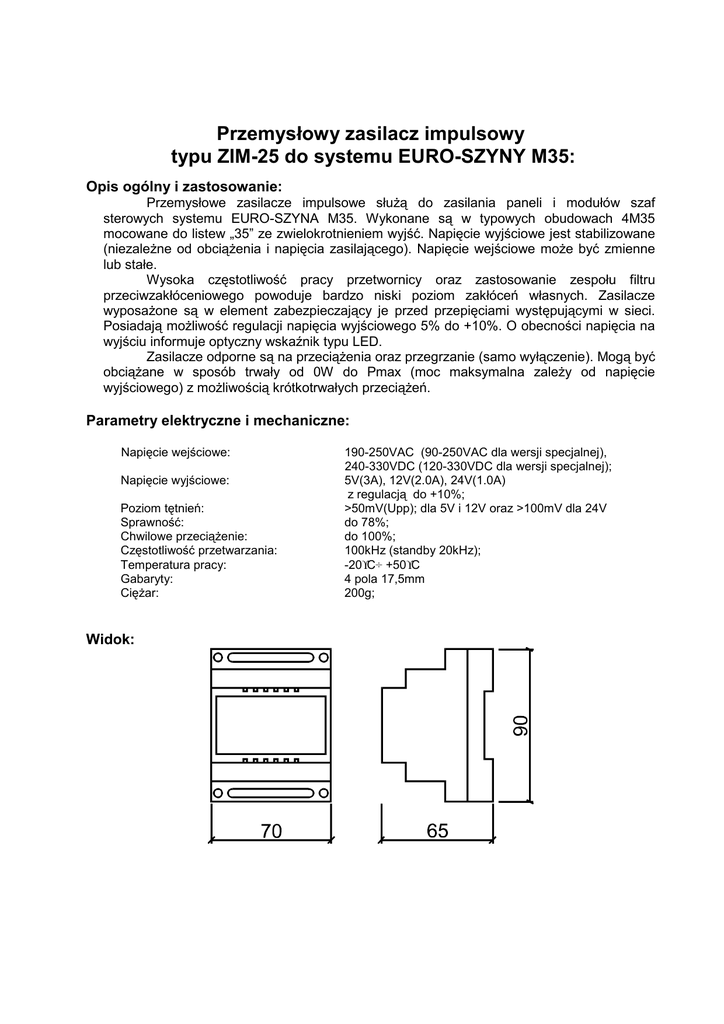 Przemysłowy zasilacz impulsowy typu ZIM-25 do systemu EURO-SZYNY M35: Opis ogólny i zastosowanie: Przemysłowe zasilacze impulsowe słuŜą do zasilania paneli i modułów szaf sterowych systemu EURO-SZYNA M35. Wykonane są w typowych obudowach 4M35 mocowane do listew „35” ze zwielokrotnieniem wyjść. Napięcie wyjściowe jest stabilizowane (niezaleŜne od obciąŜenia i napięcia zasilającego). Napięcie wejściowe moŜe być zmienne lub stałe. Wysoka częstotliwość pracy przetwornicy oraz zastosowanie zespołu filtru przeciwzakłóceniowego powoduje bardzo niski poziom zakłóceń własnych. Zasilacze wyposaŜone są w element zabezpieczający je przed przepięciami występującymi w sieci. Posiadają moŜliwość regulacji napięcia wyjściowego 5% do +10%. O obecności napięcia na wyjściu informuje optyczny wskaźnik typu LED. Zasilacze odporne są na przeciąŜenia oraz przegrzanie (samo wyłączenie). Mogą być obciąŜane w sposób trwały od 0W do Pmax (moc maksymalna zaleŜy od napięcie wyjściowego) z moŜliwością krótkotrwałych przeciąŜeń. Parametry elektryczne i mechaniczne: Napięcie wejściowe: Napięcie wyjściowe: Poziom tętnień: Sprawność: Chwilowe przeciąŜenie: Częstotliwość przetwarzania: Temperatura pracy: Gabaryty: CięŜar: Widok: 190-250VAC (90-250VAC dla wersji specjalnej), 240-330VDC (120-330VDC dla wersji specjalnej); 5V(3A), 12V(2.0A), 24V(1.0A) z regulacją do +10%; >50mV(Upp); dla 5V i 12V oraz >100mV dla 24V do 78%; do 100%; 100kHz (standby 20kHz); -20°C÷ +50°C 4 pola 17,5mm 200g;